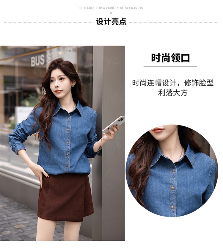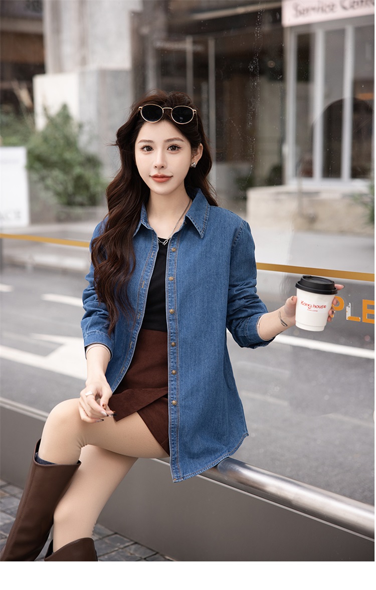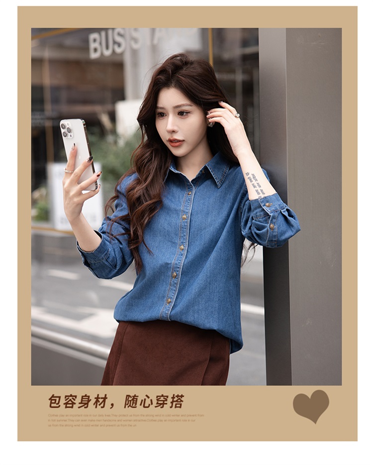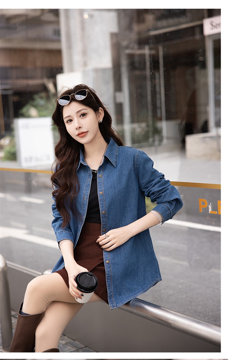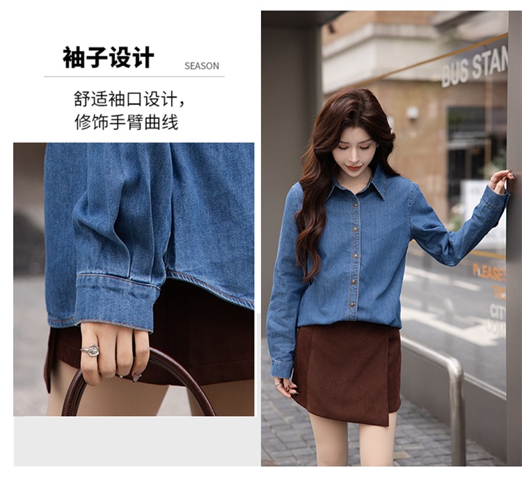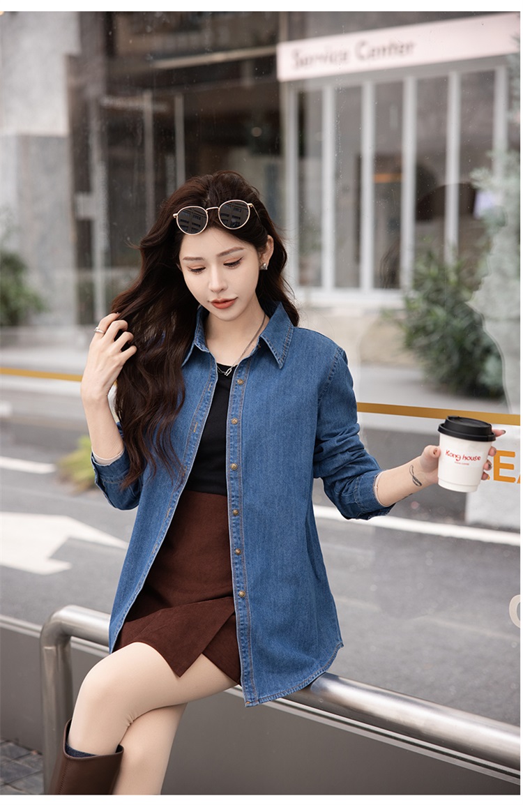 Real shot #No curling dark blue soft denim shirt for women to wear as a layered long-sleeved shirt for petite straight shoulder top