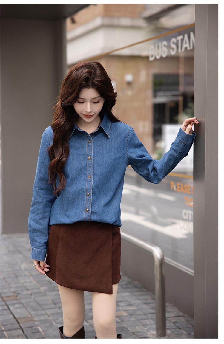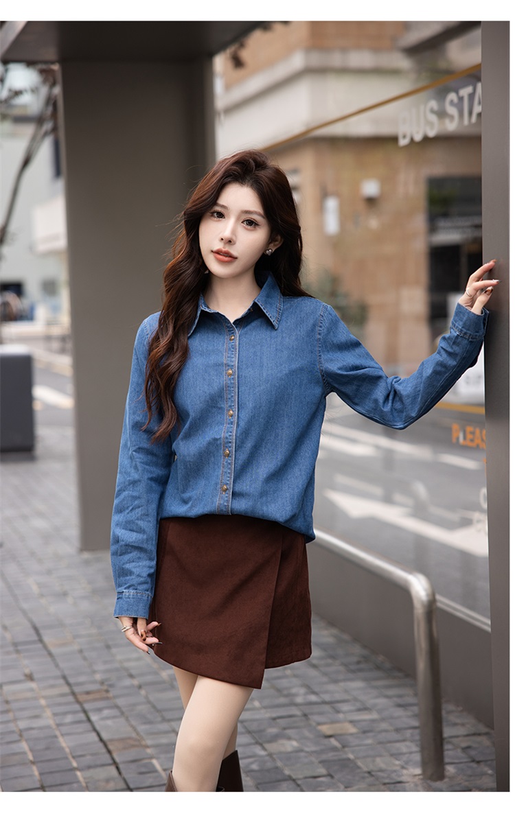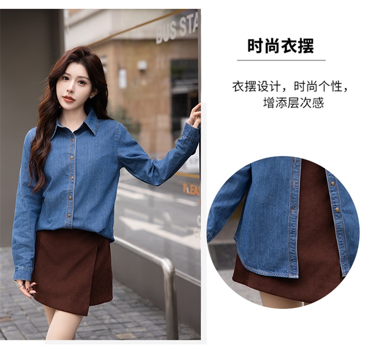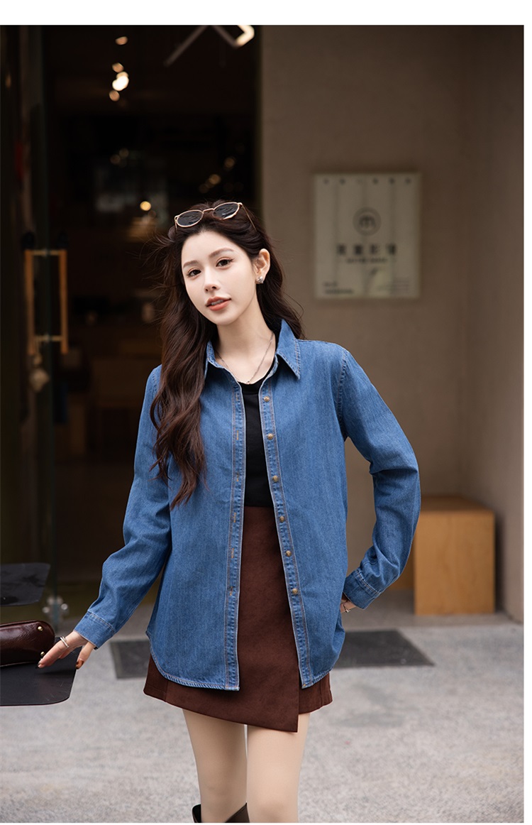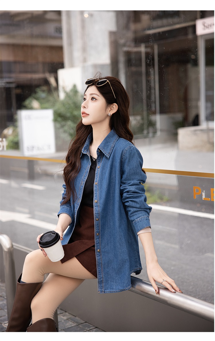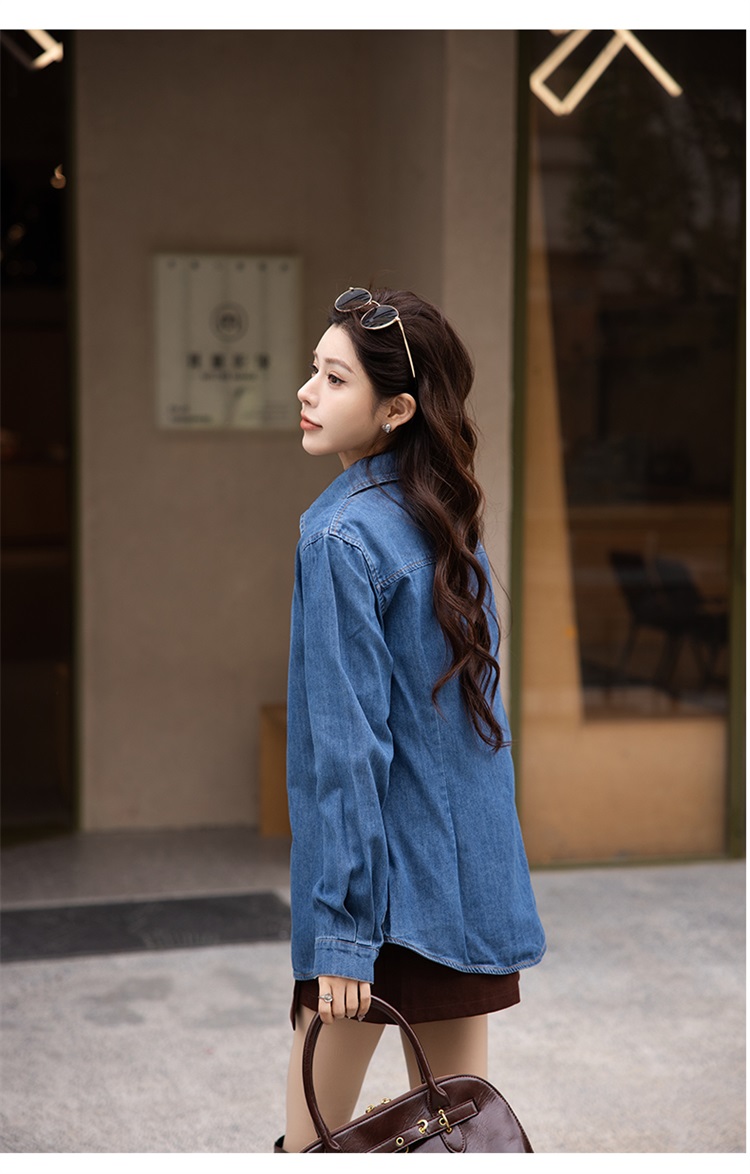 Real shot #No curling dark blue soft denim shirt for women to wear as a layered long-sleeved shirt for petite straight shoulder top