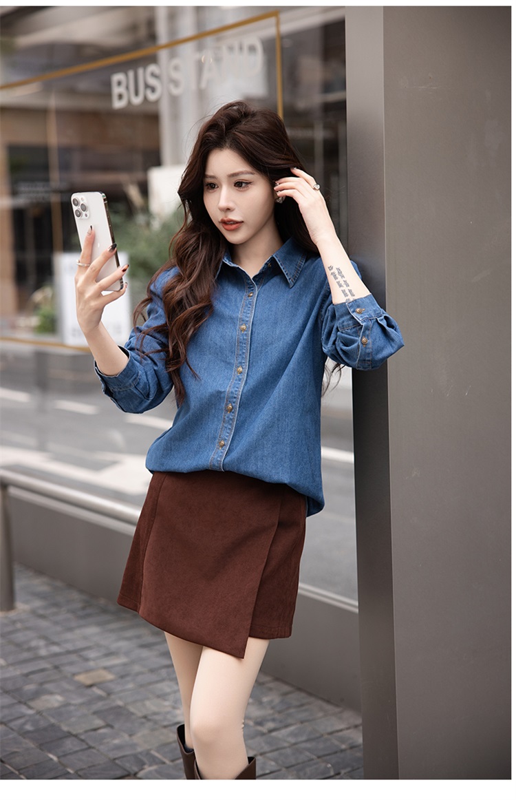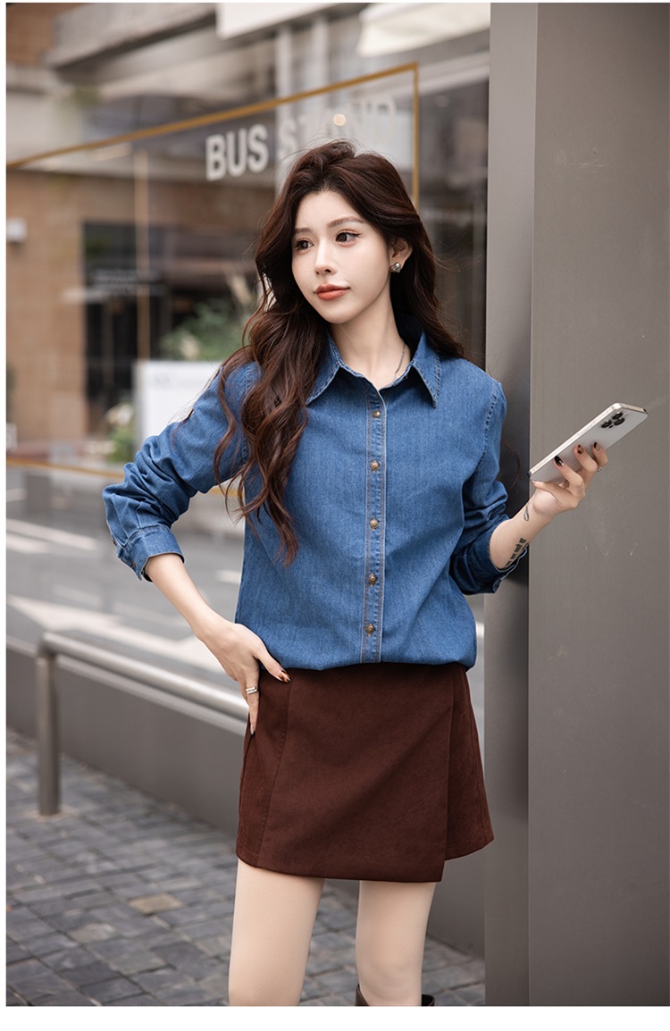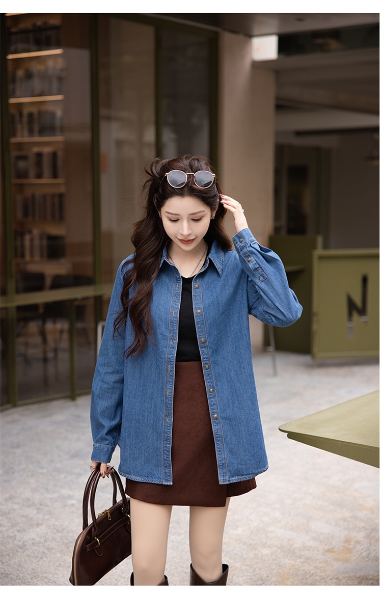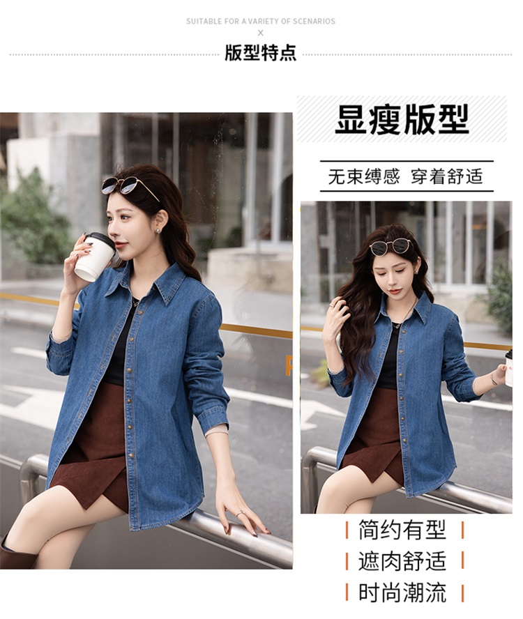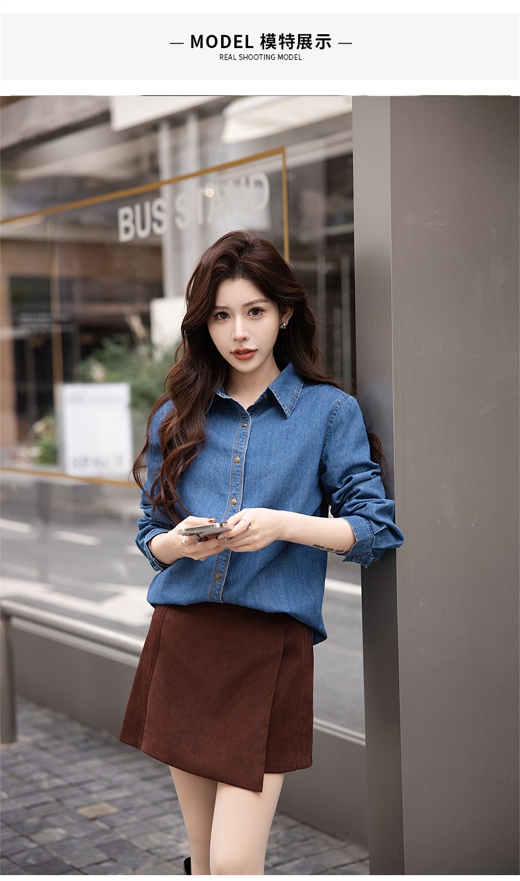 Real shot #No curling dark blue soft denim shirt for women to wear as a layered long-sleeved shirt for petite straight shoulder top