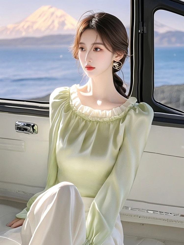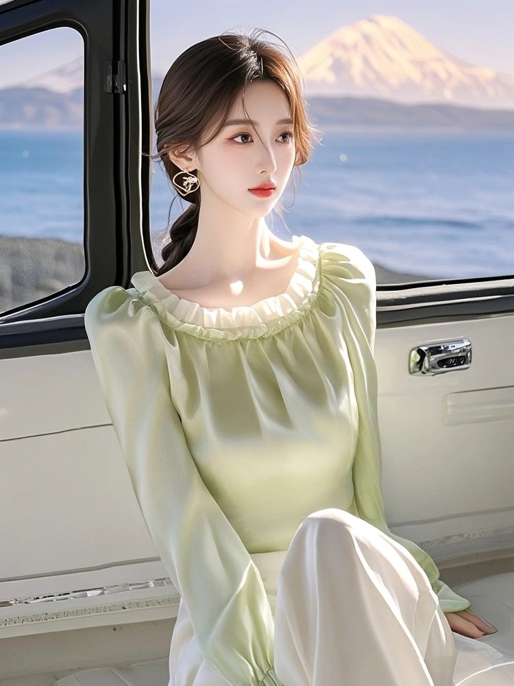 French style high-end inner shirt 2025 spring super beautiful unique beautiful green satin shirt