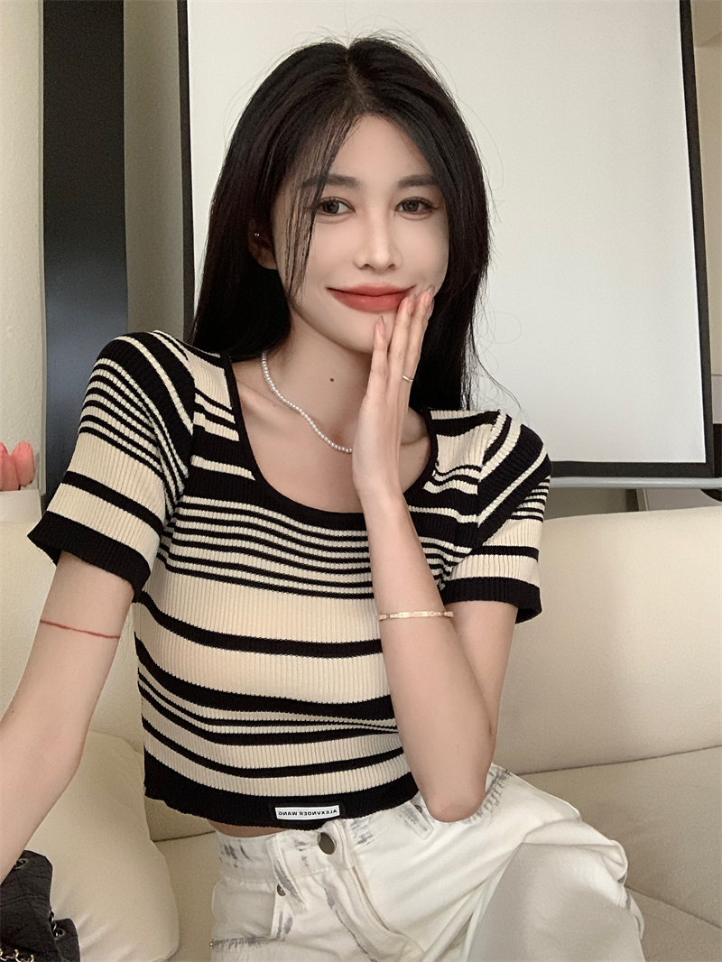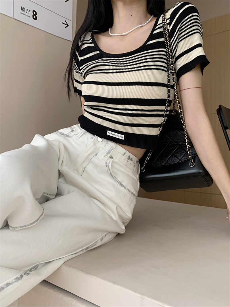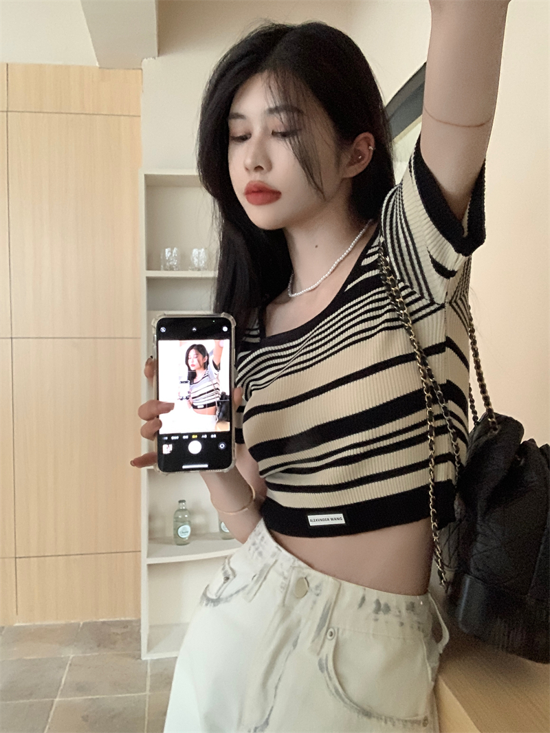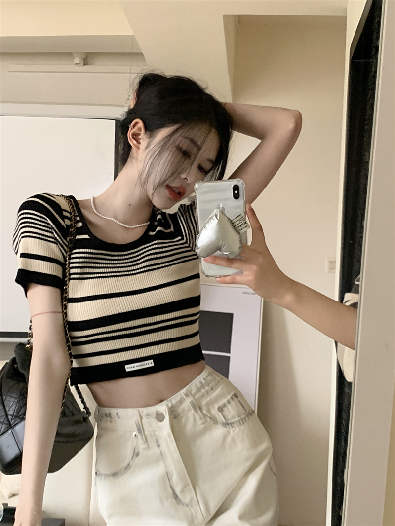 复古条纹夏季新款女2025新款设计感小众oversize风短款短袖上衣