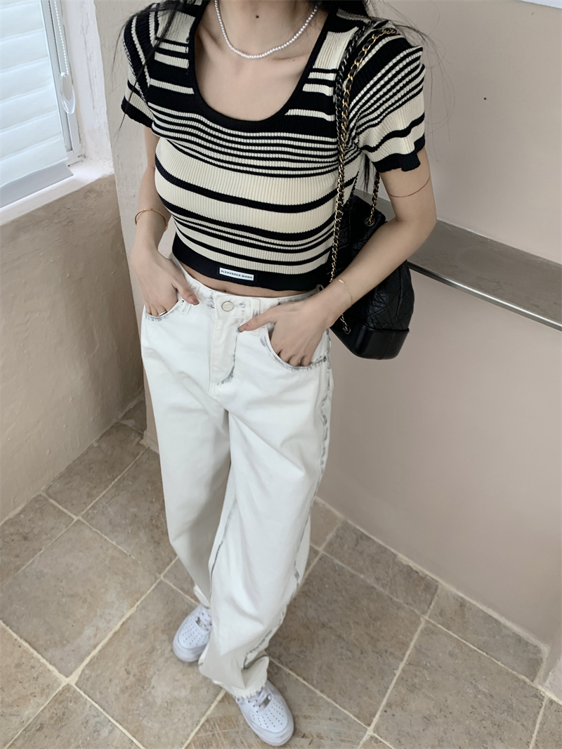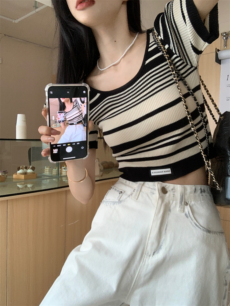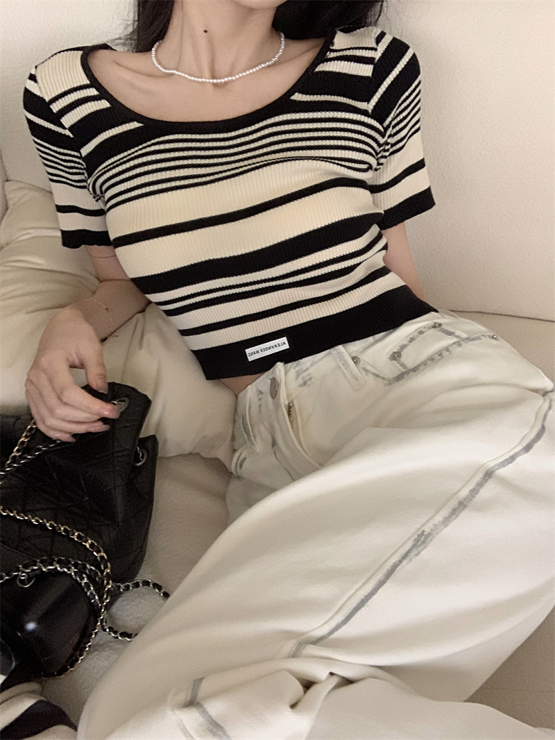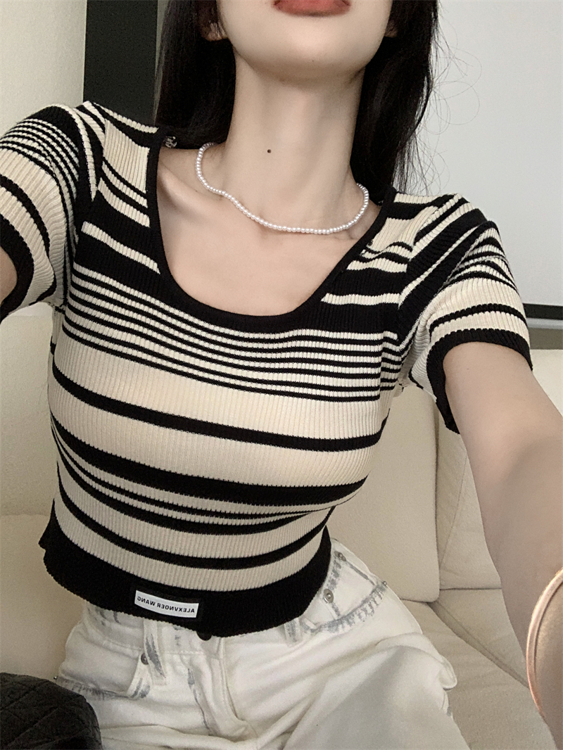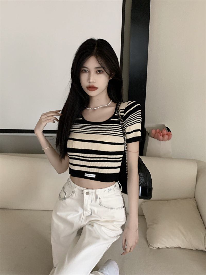 复古条纹夏季新款女2025新款设计感小众oversize风短款短袖上衣
