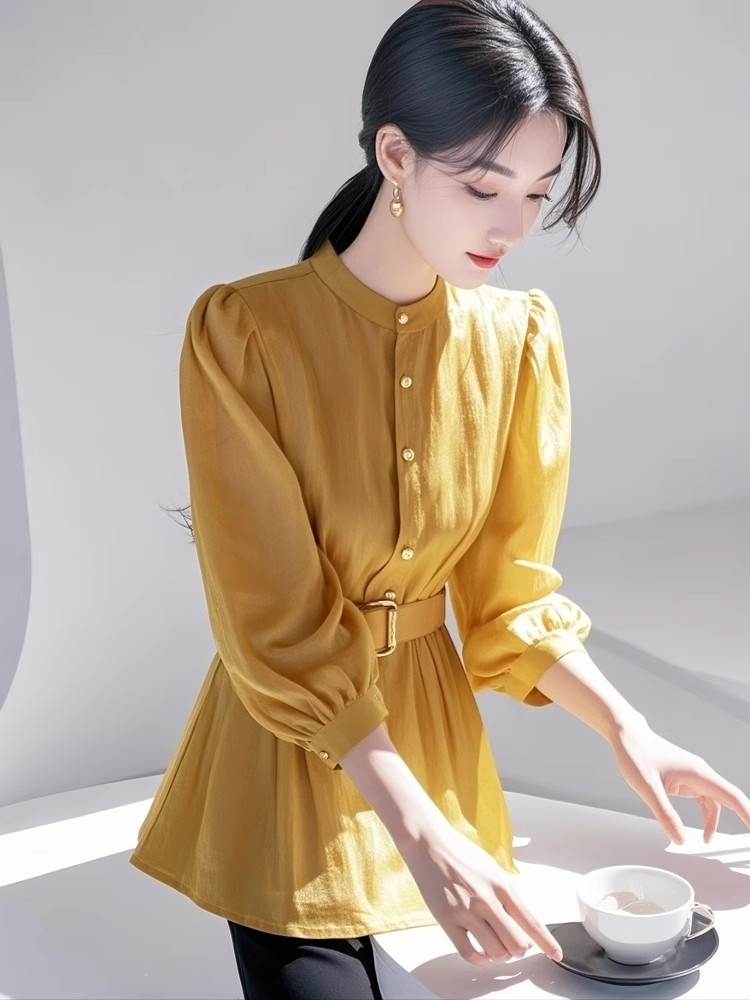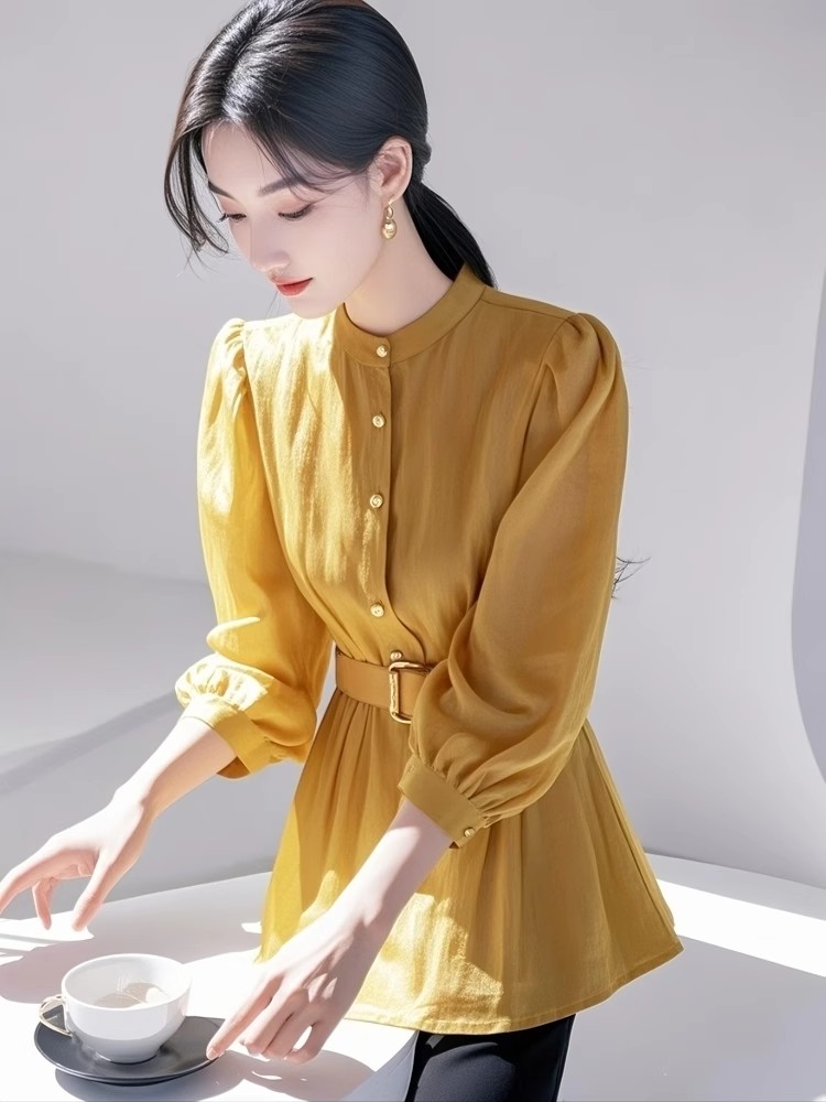 High-grade light luxury waist yellow shirt women 2025 spring new style super good-looking unique beautiful lining