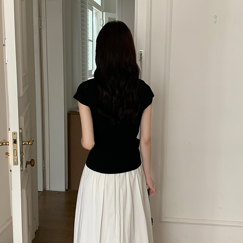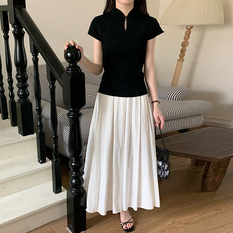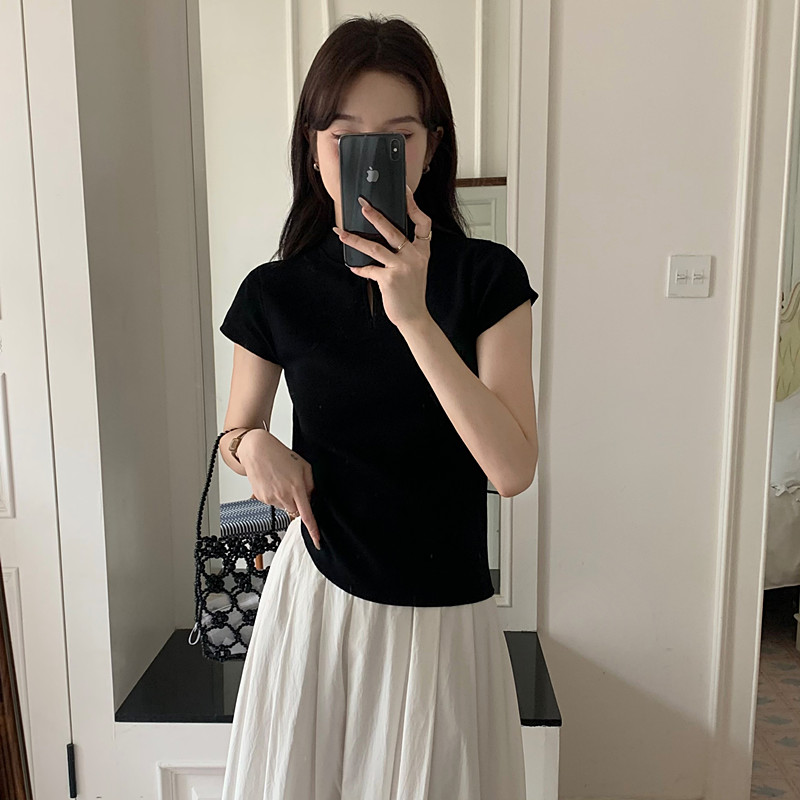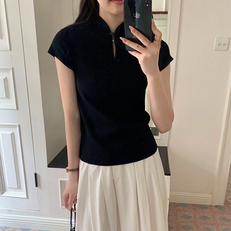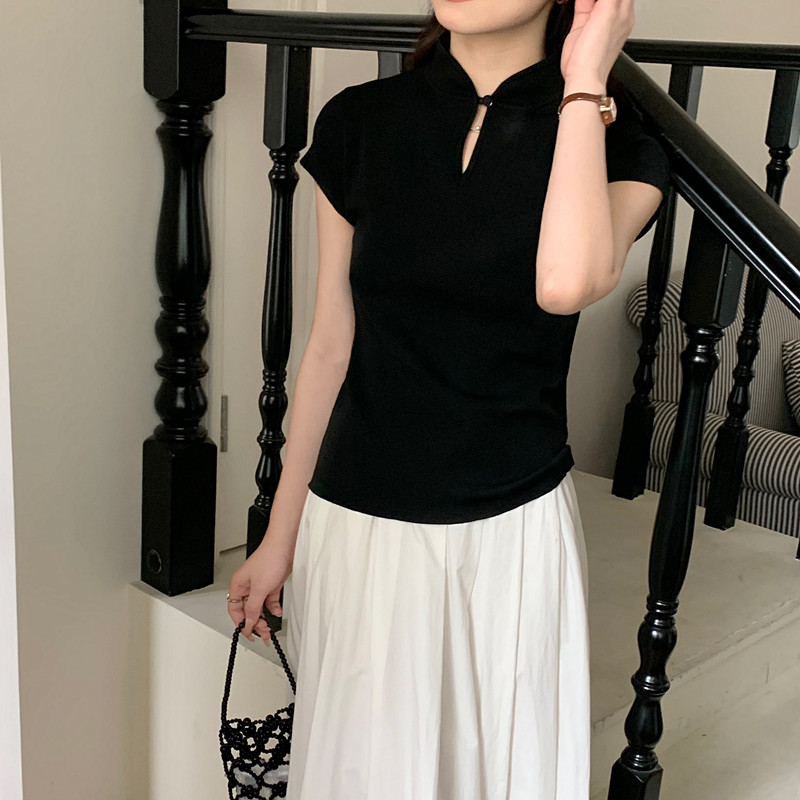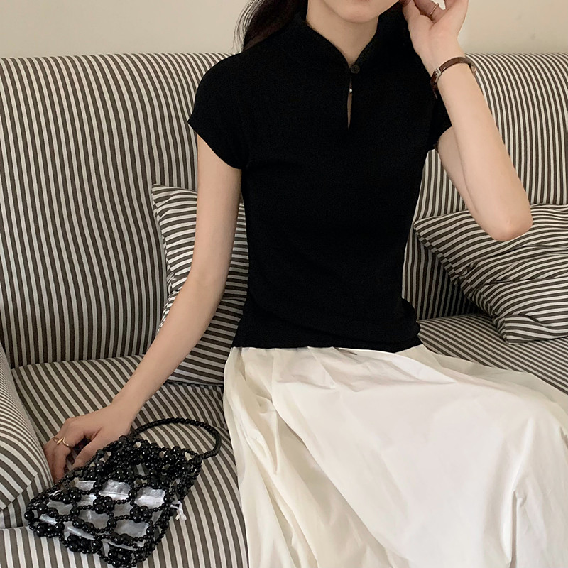 New Chinese style button black stand collar straight shoulder knitted short-sleeved T-shirt women's summer slim small flying sleeve hot girl top
