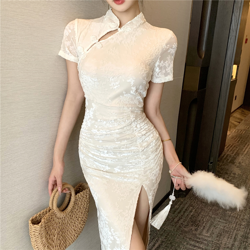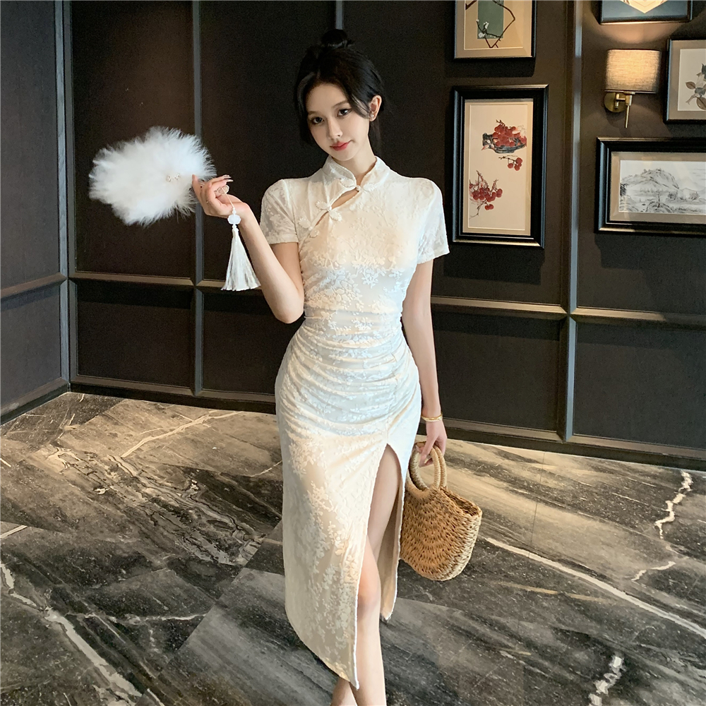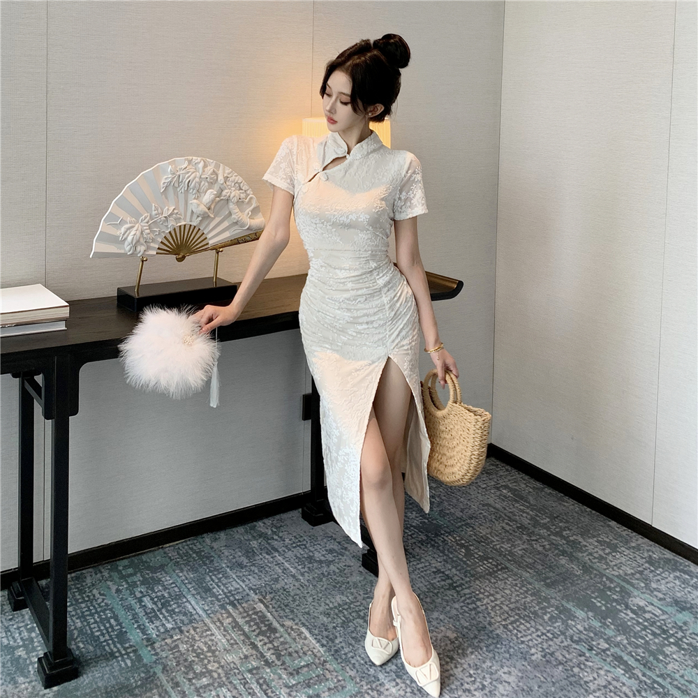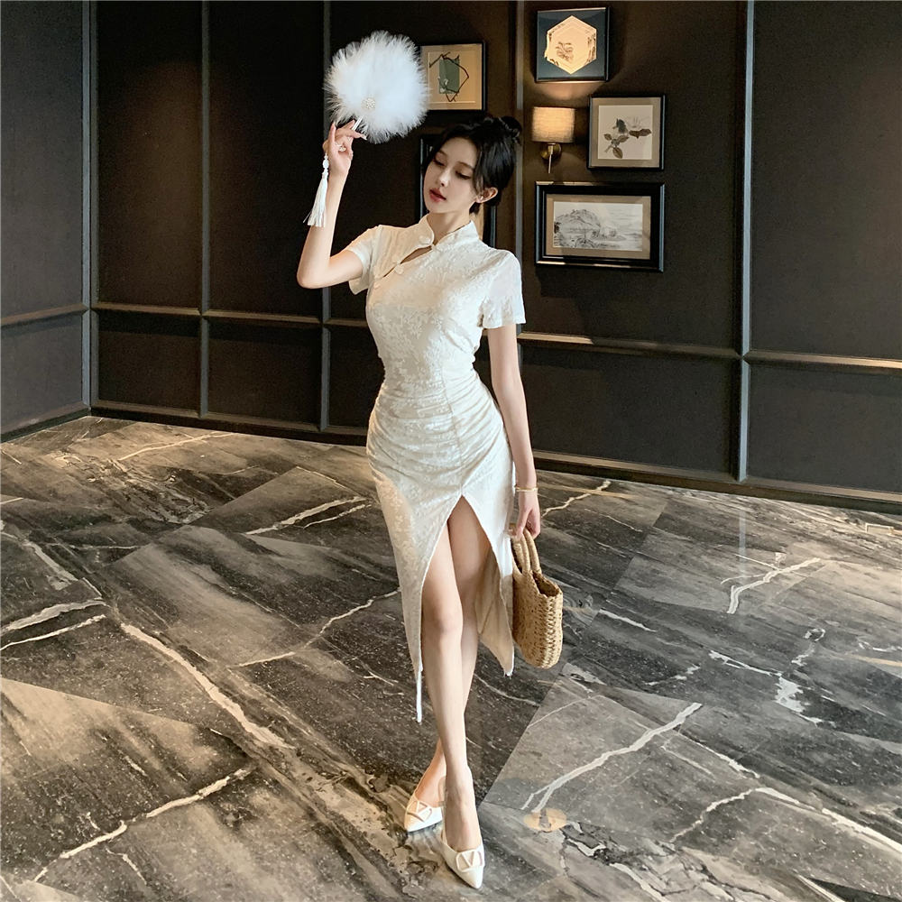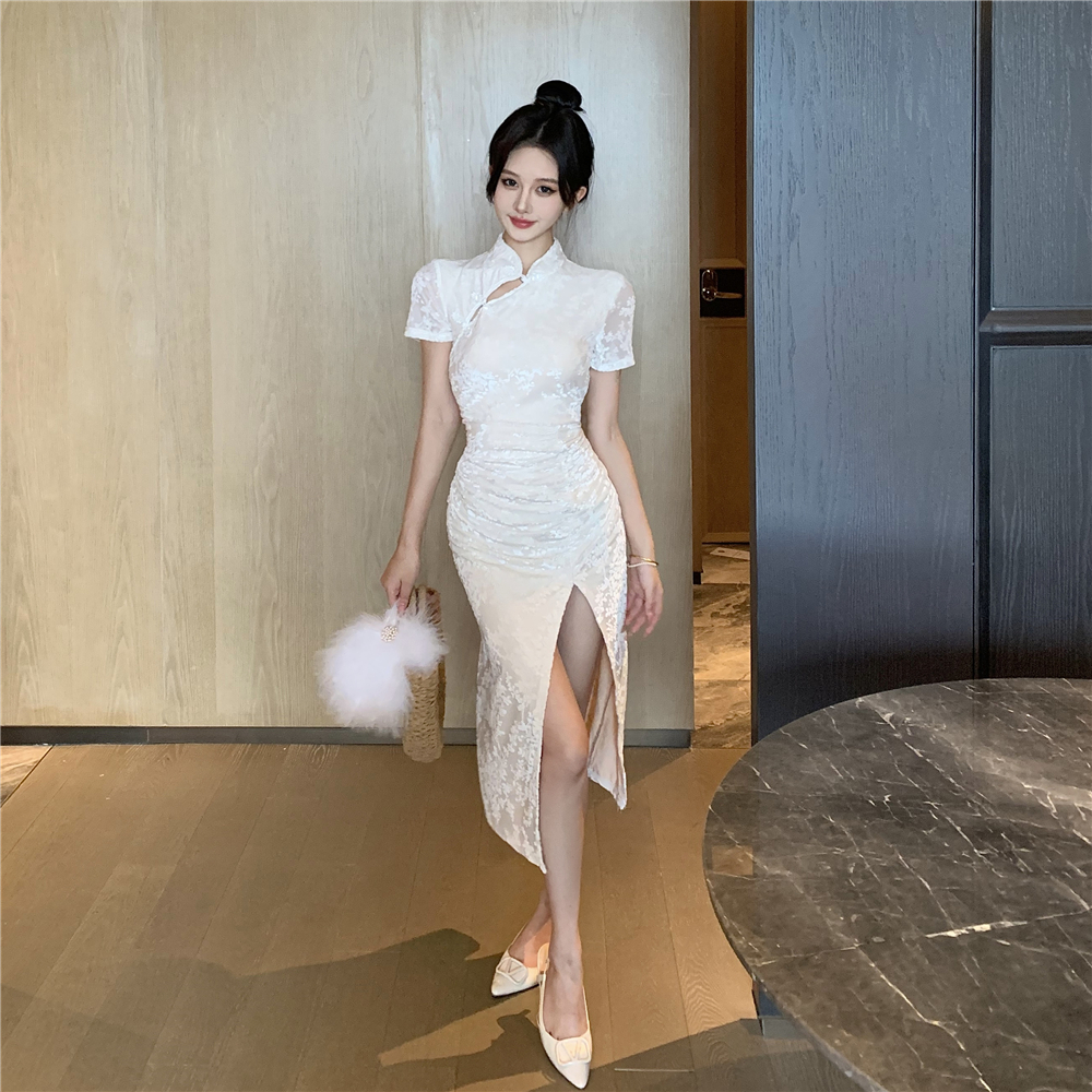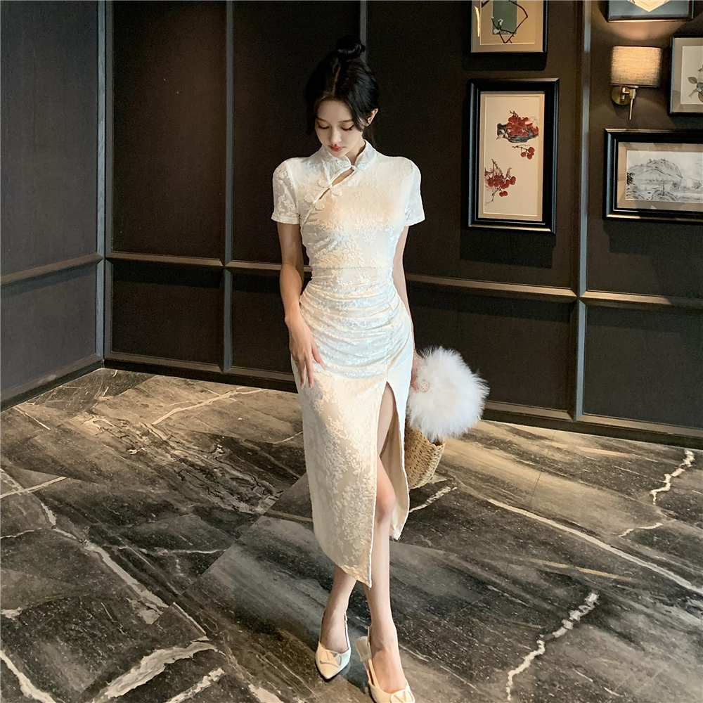 实拍2025年新中式白月光气质提花高腰开叉褶皱显瘦长款旗袍裙