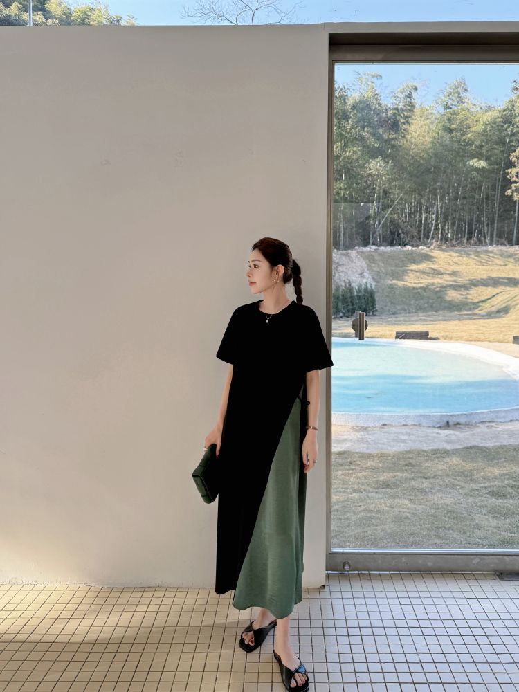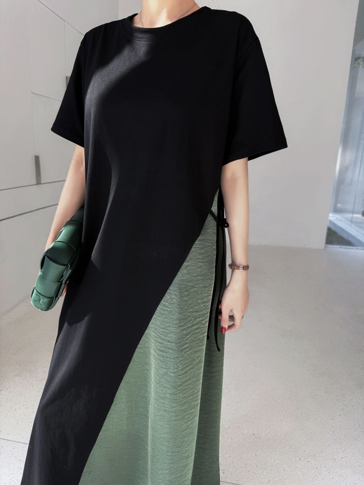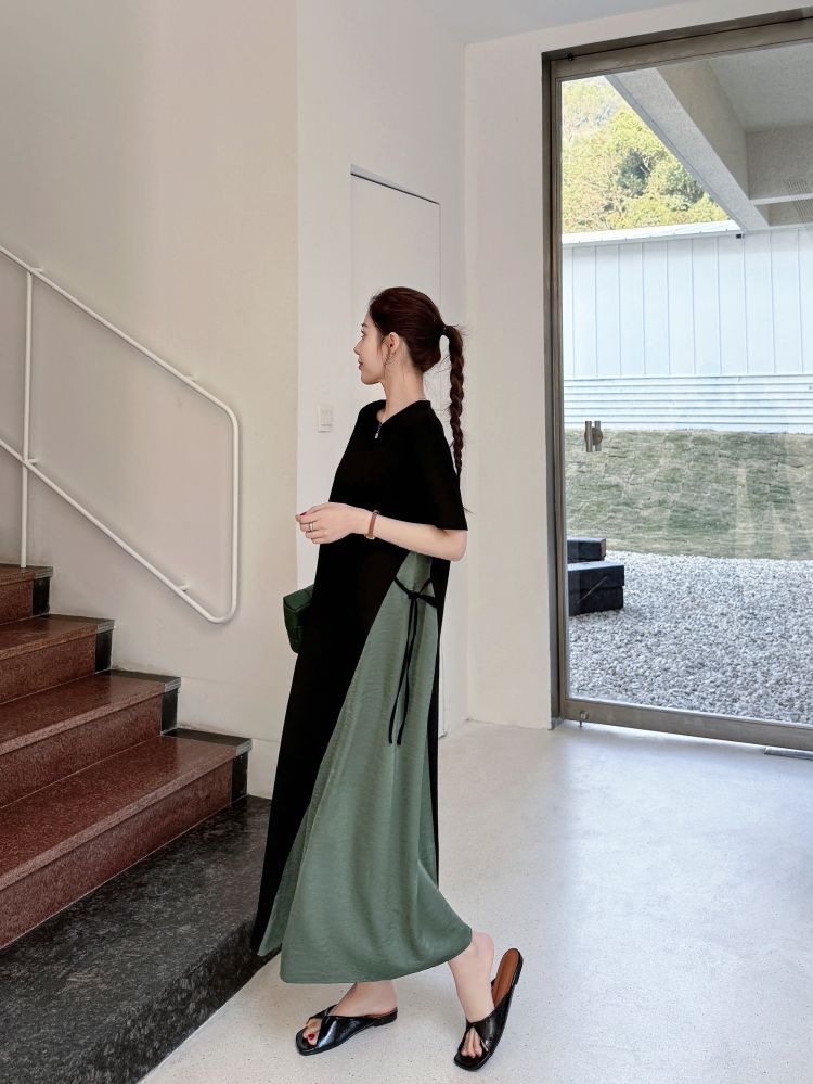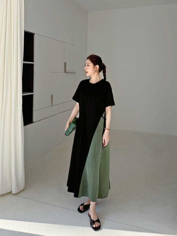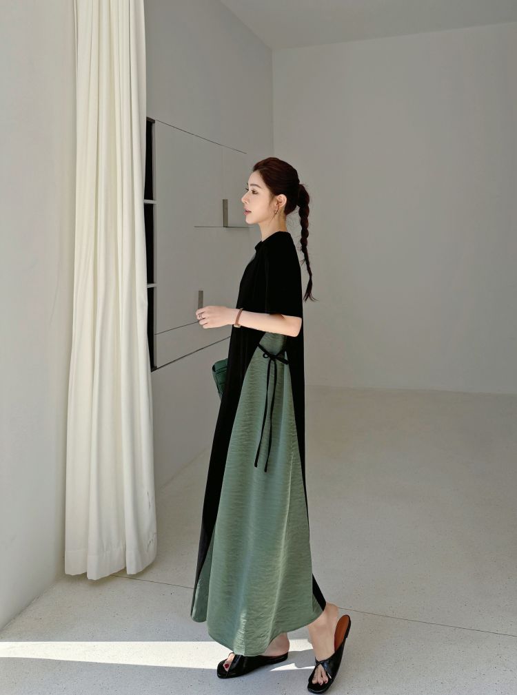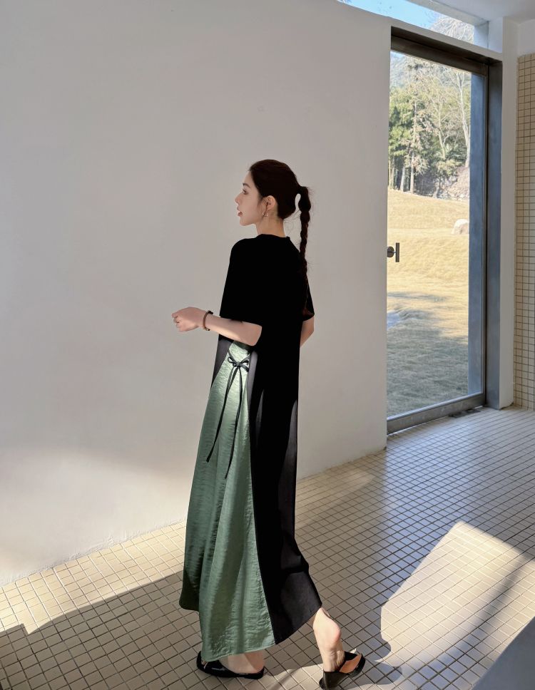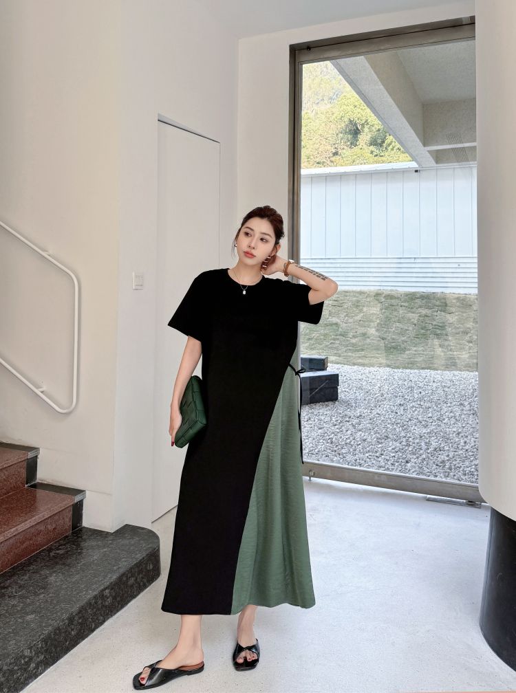 Real shot in stock 2025 summer new style/long plus size spliced acetate satin slim French lace short-sleeved dress