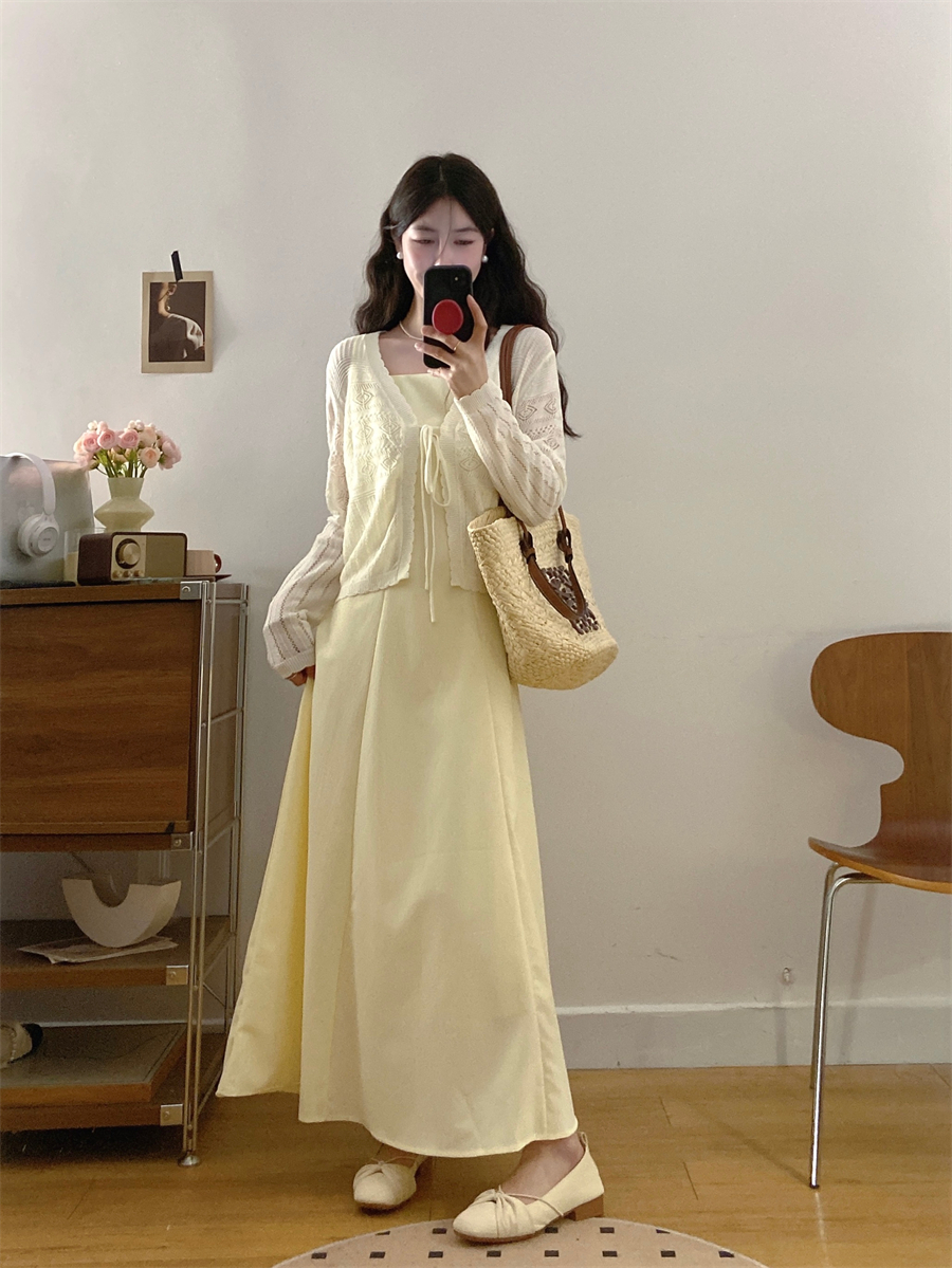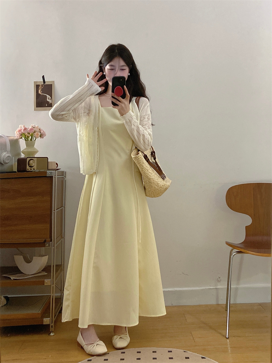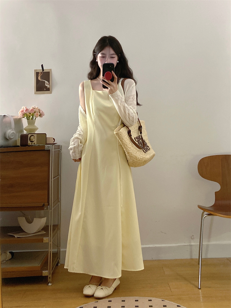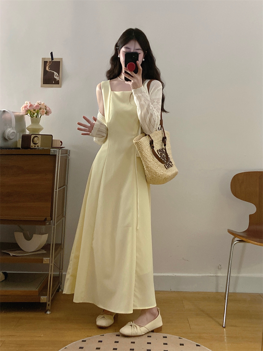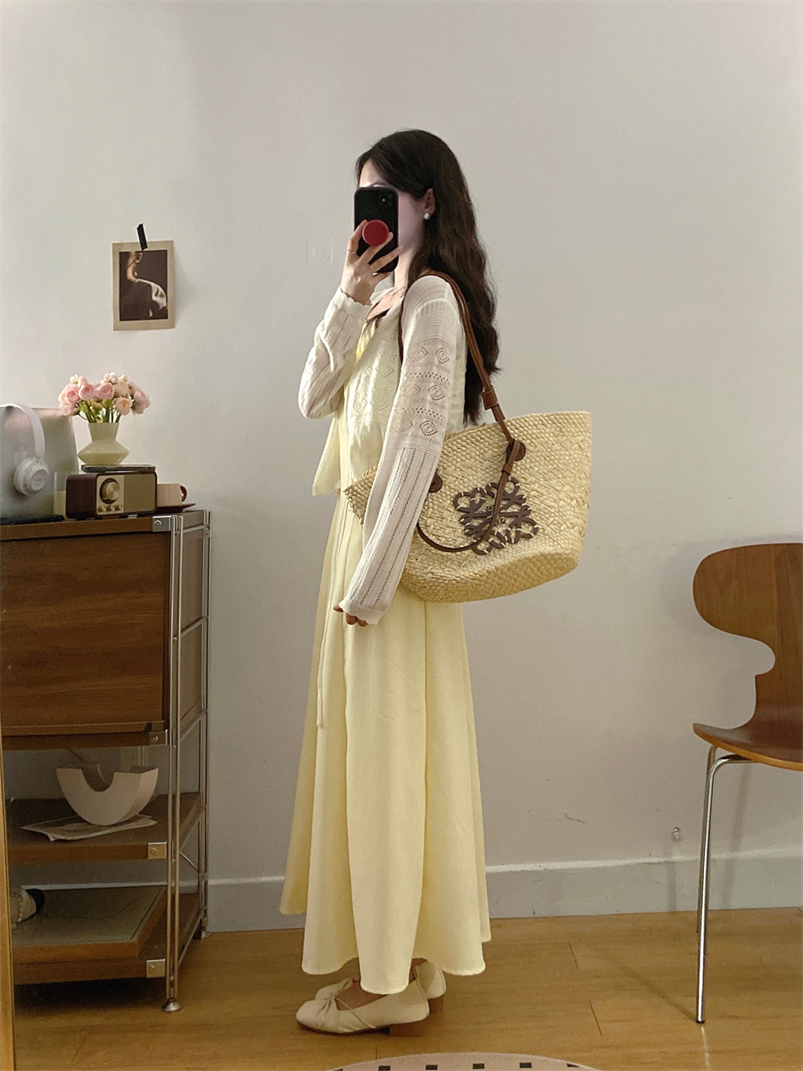 French gentle style yellow suspender dress women's summer wear 2025 new temperament two-piece suit