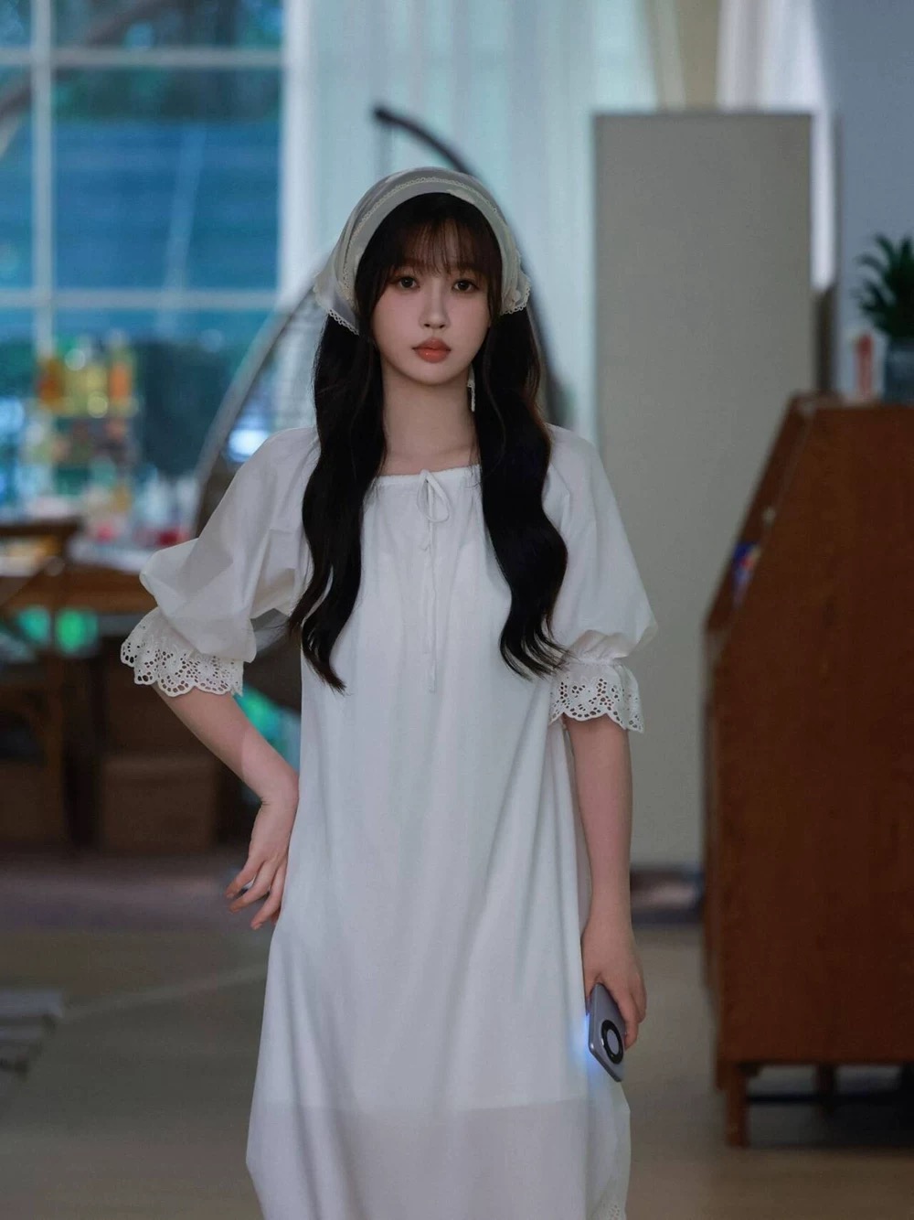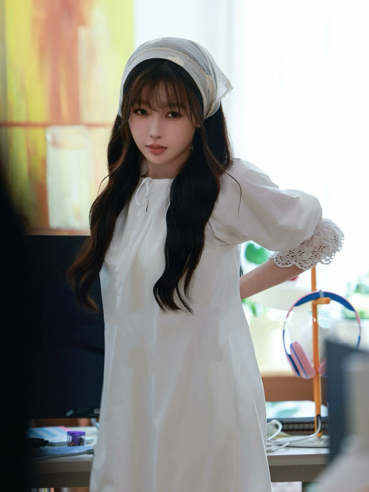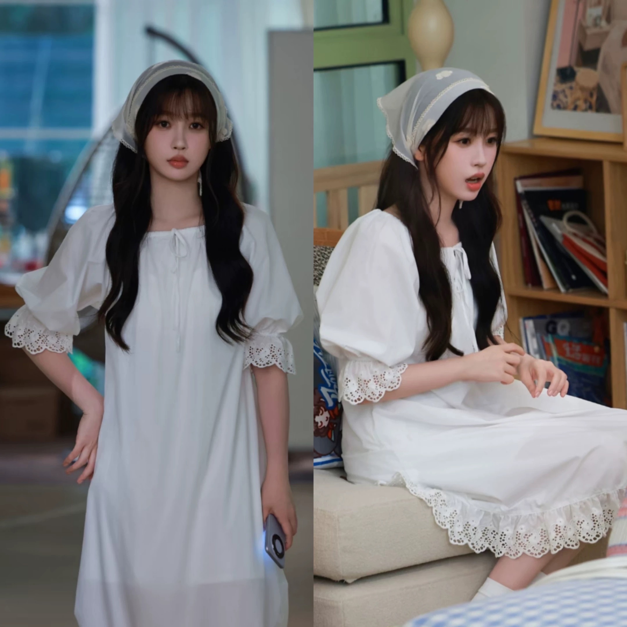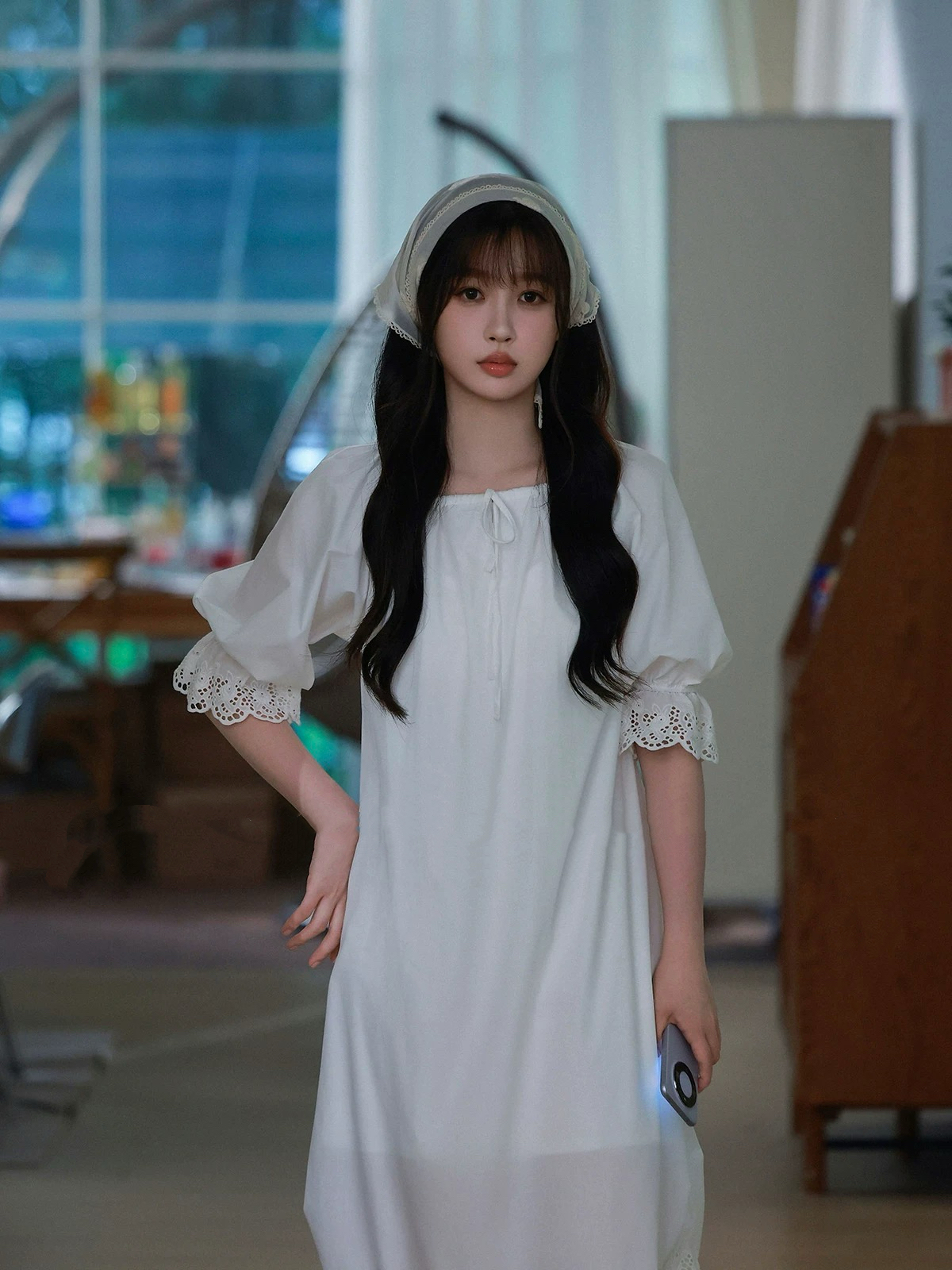 Hush, the king is hibernating, Yu Shuxin, same style, white puff sleeve lace dress, female Weizhi loose mid-length skirt