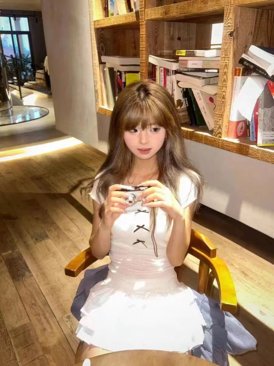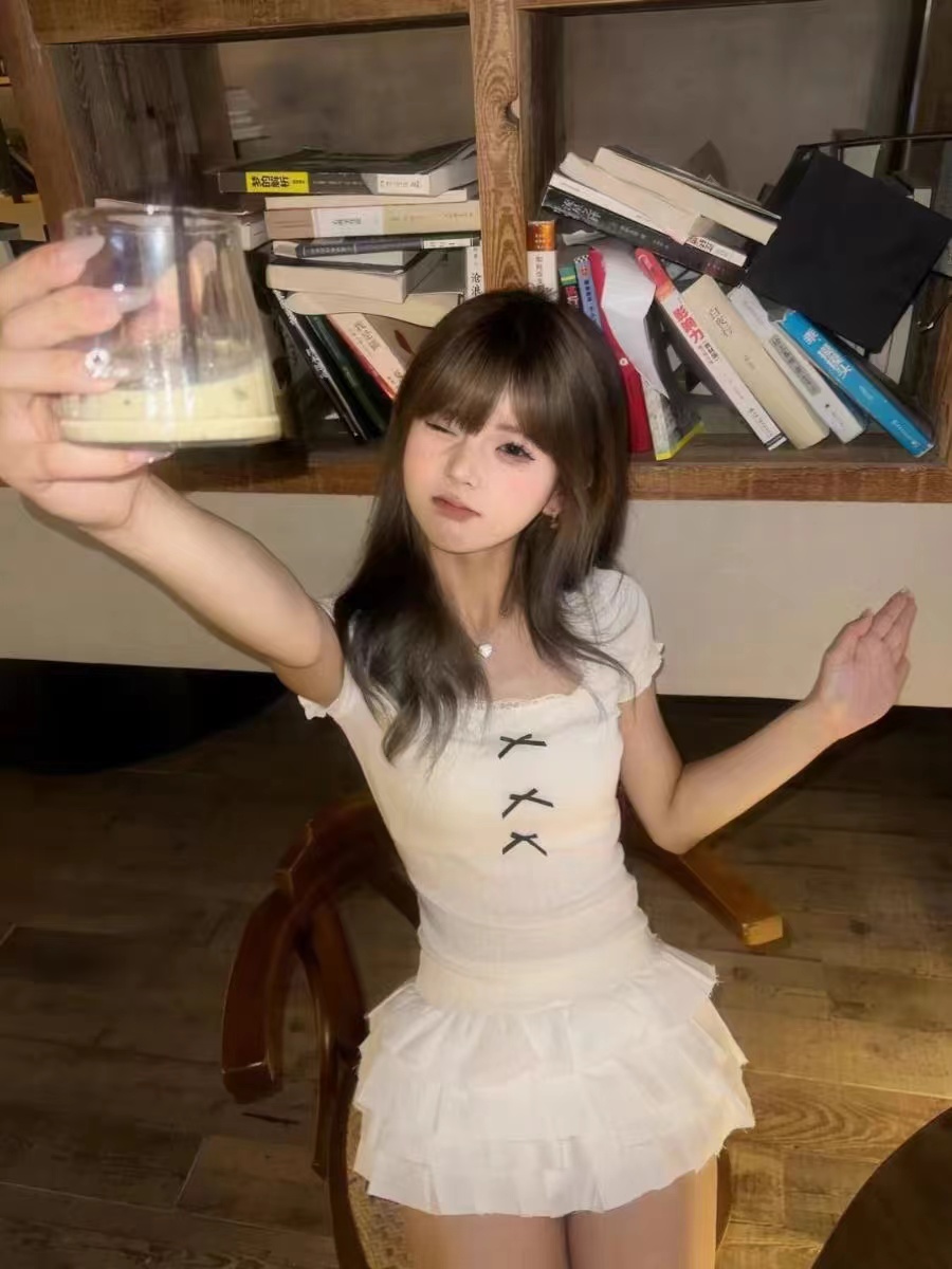 原版提花面料设计感芭蕾风蝴蝶结蕾丝边短袖t女纯欲正肩上衣