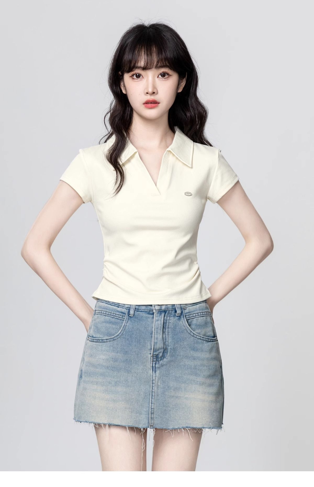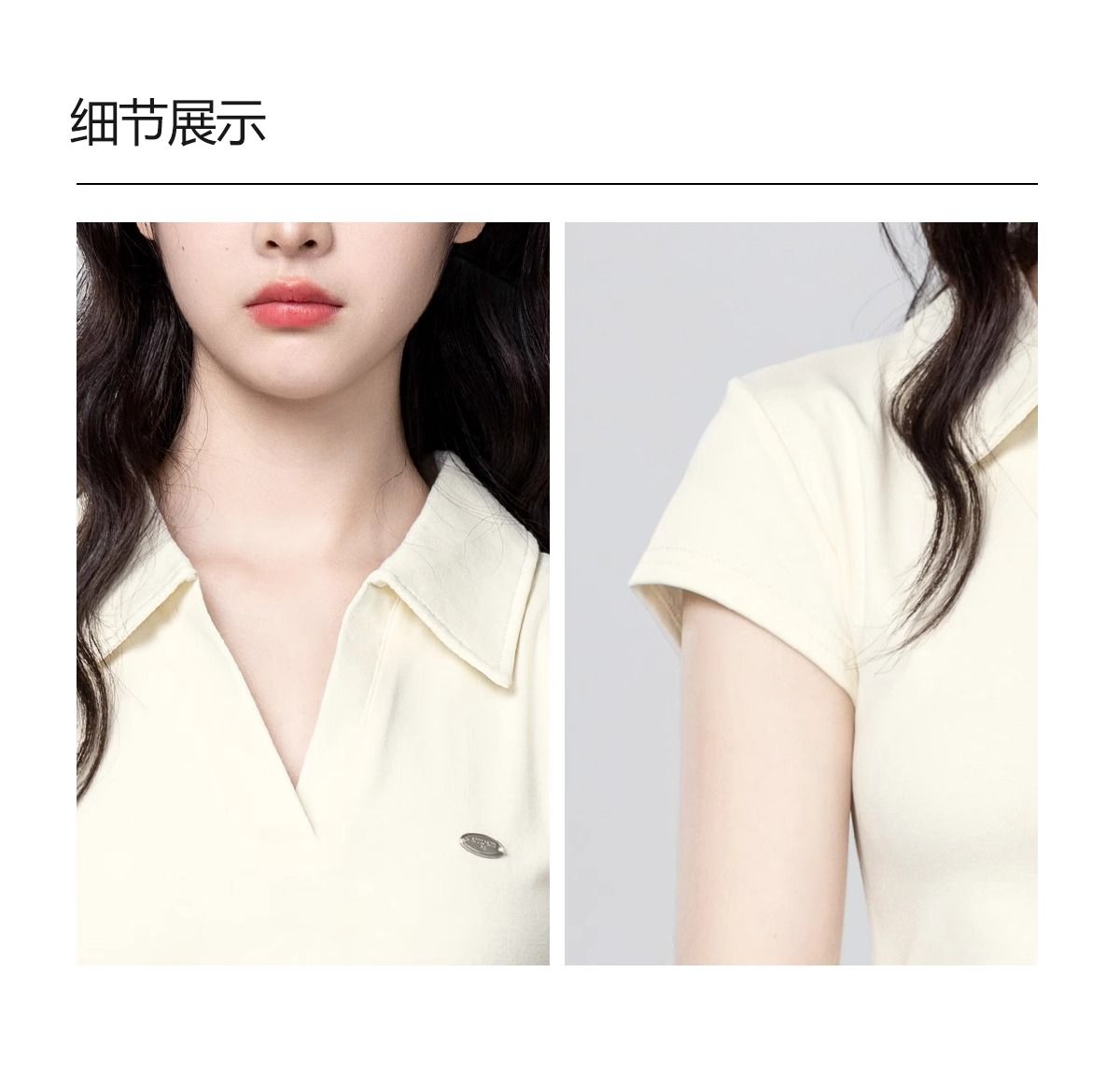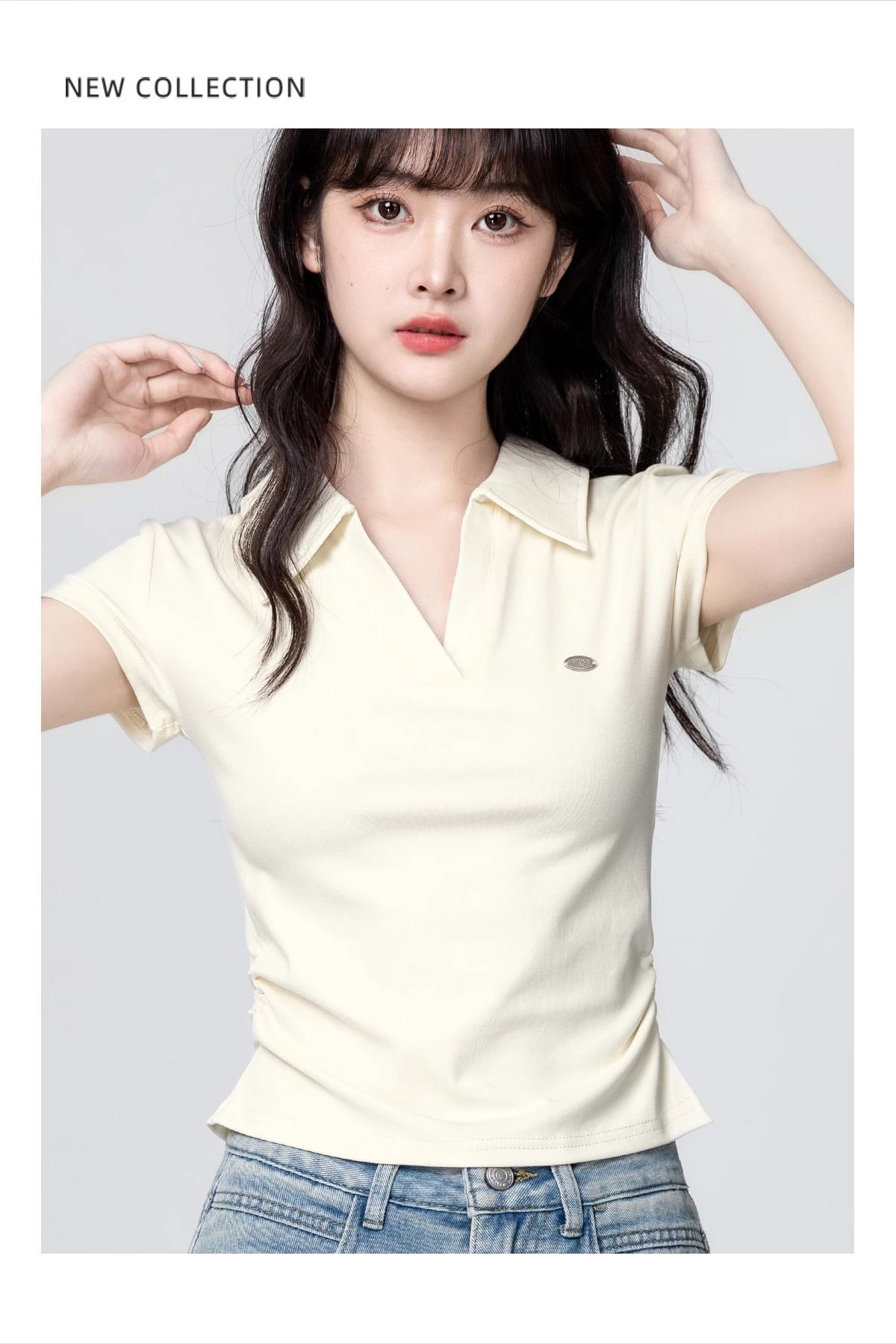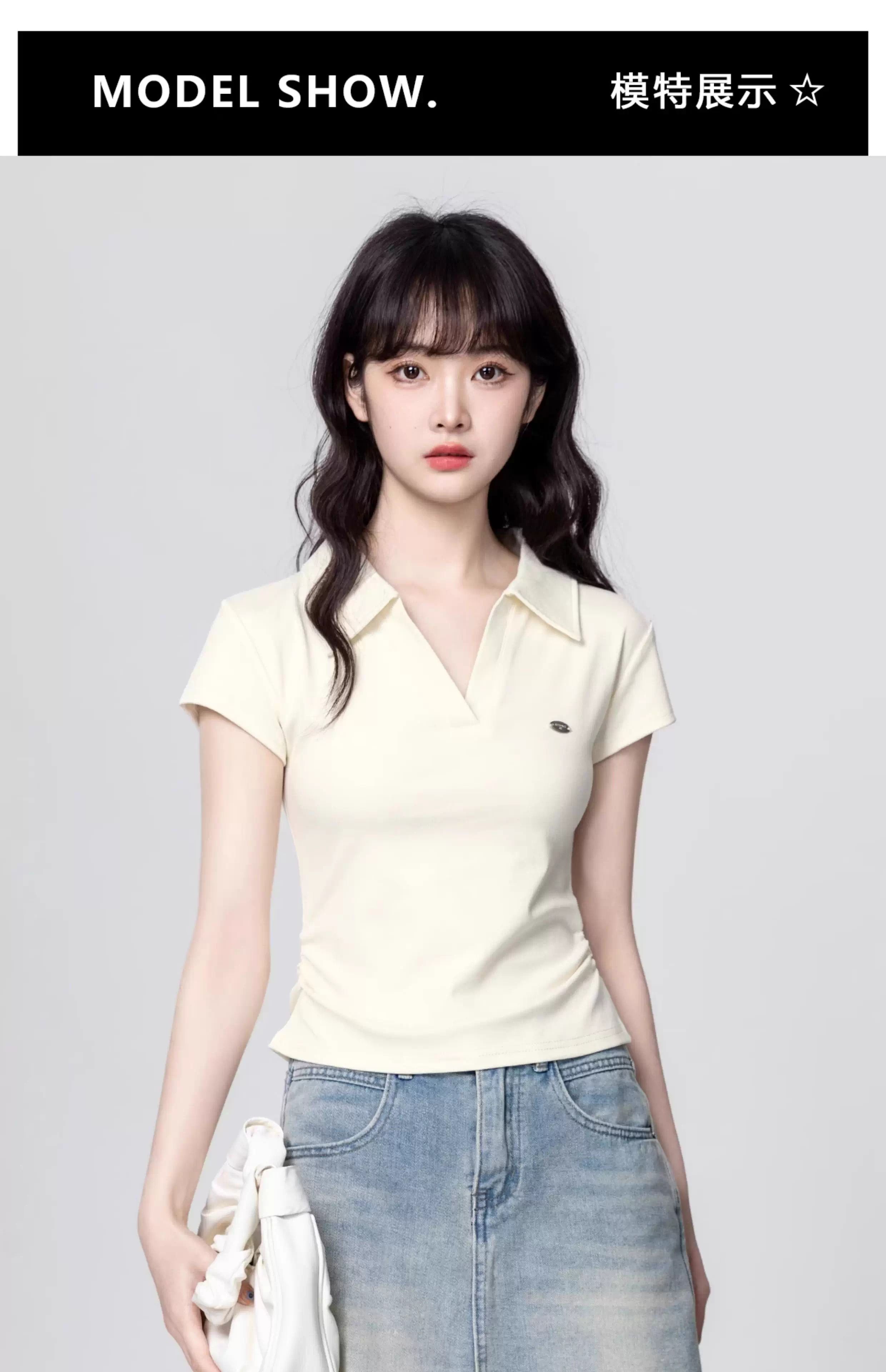 Apricot POLO collar short-sleeved T-shirt for women 2025 summer new style waist slimming V-neck straight shoulder T-shirt short top trend