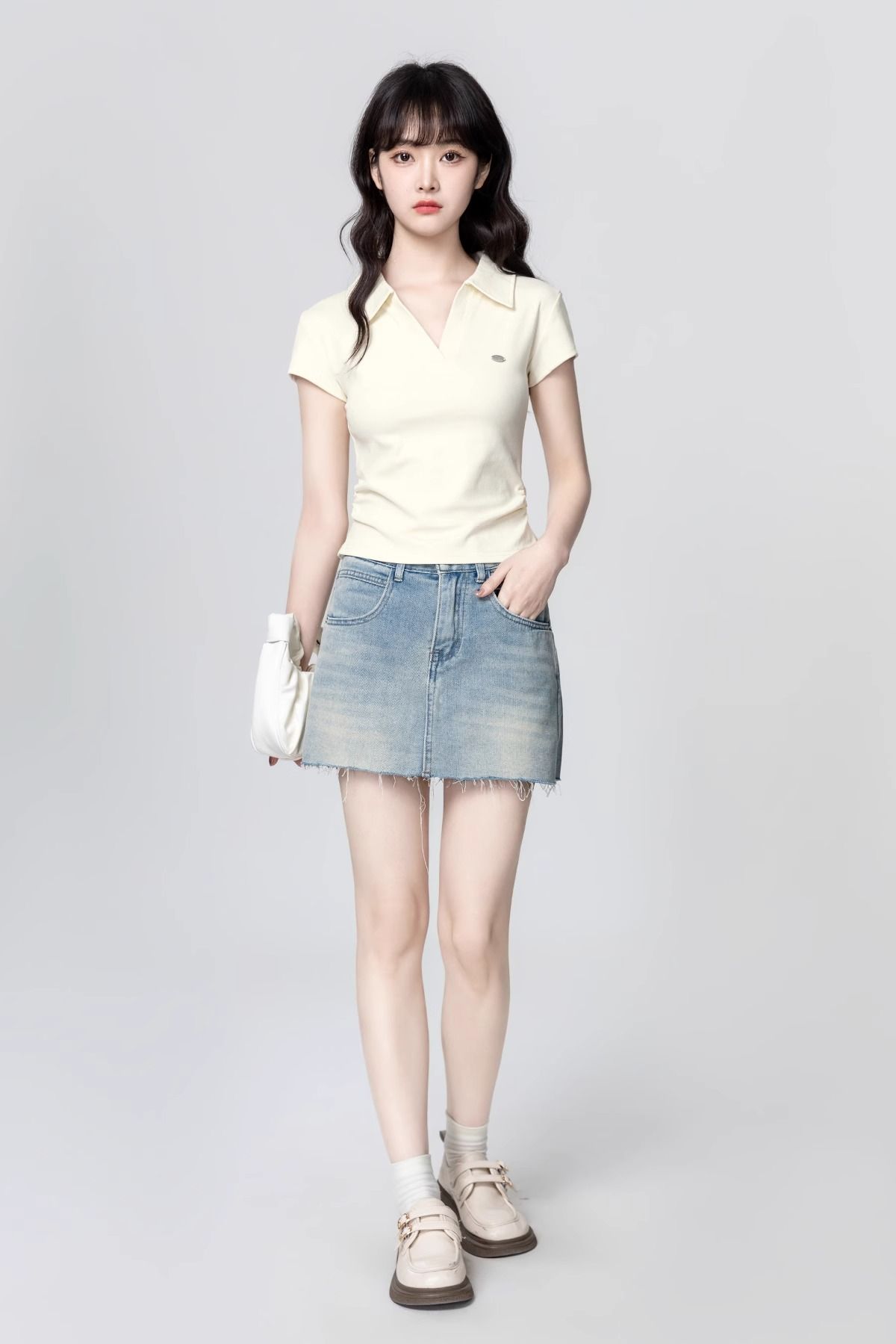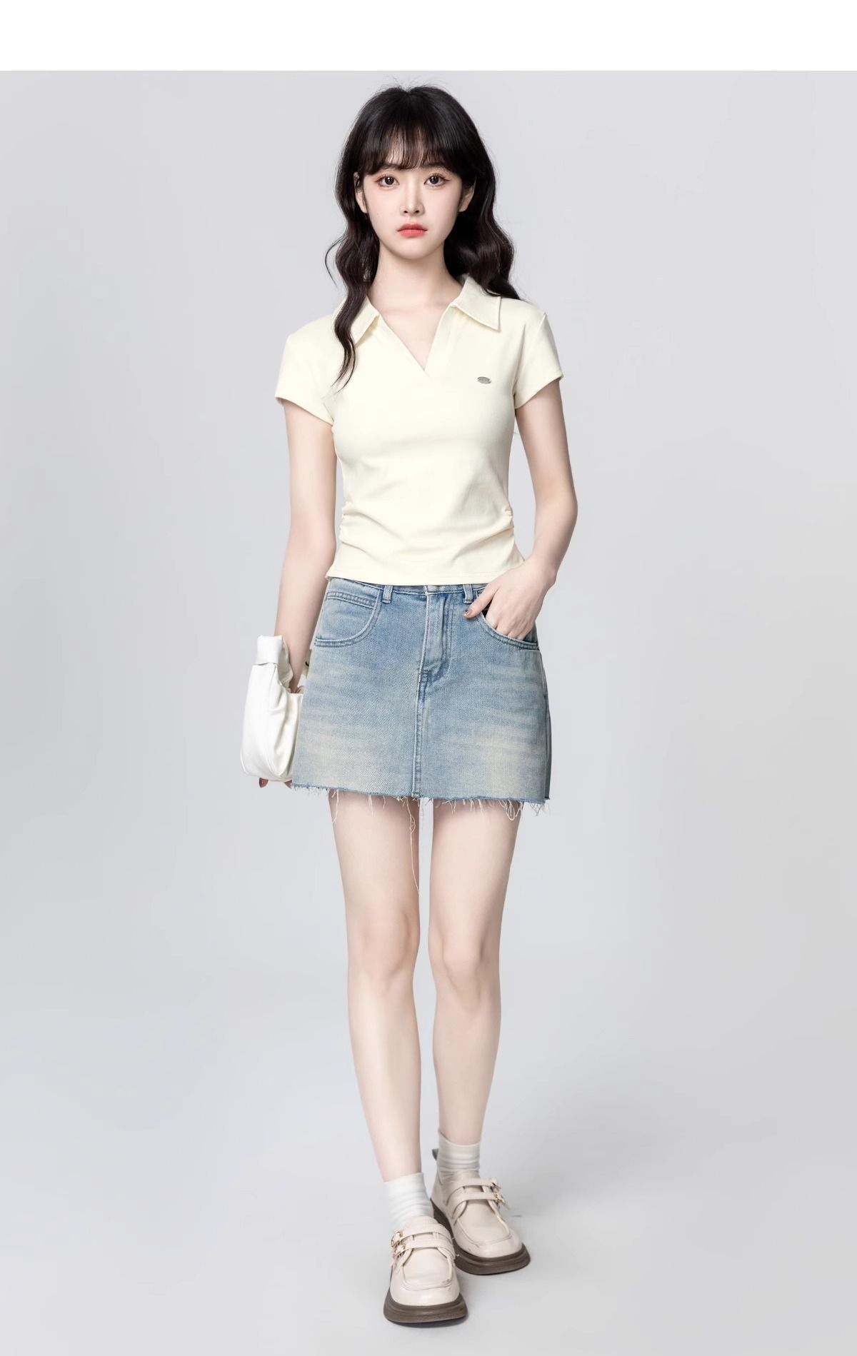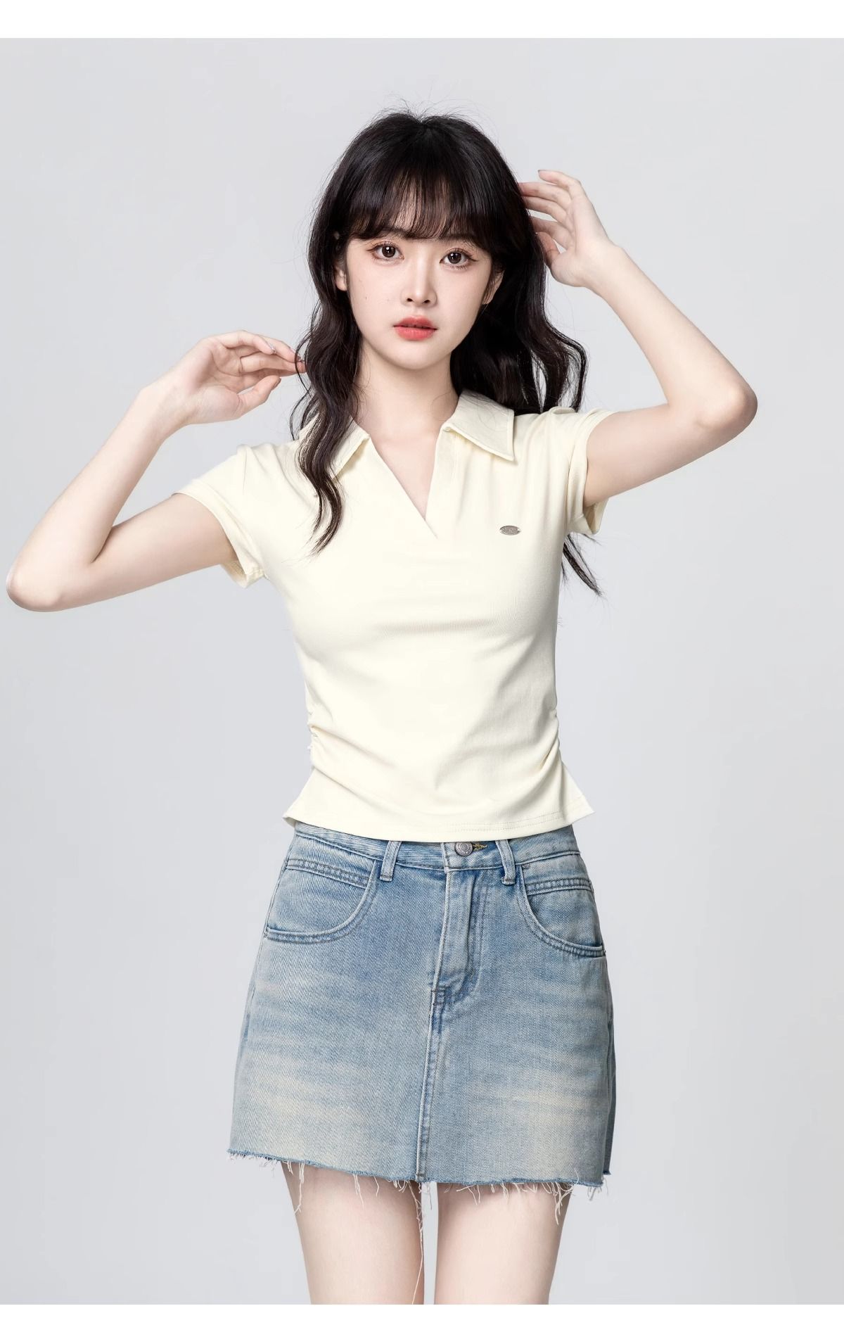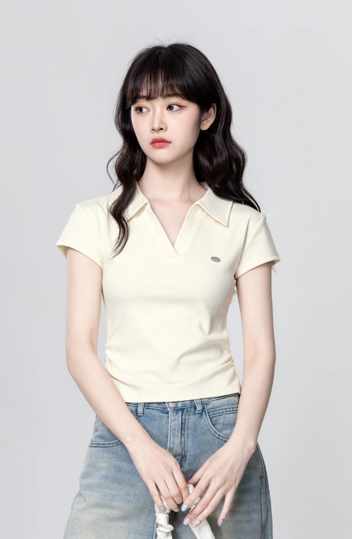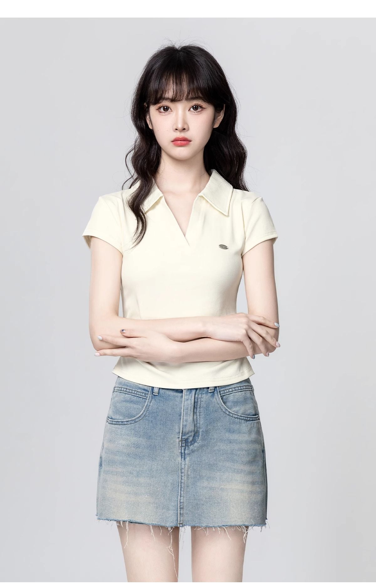 Apricot POLO collar short-sleeved T-shirt for women 2025 summer new style waist slimming V-neck straight shoulder T-shirt short top trend