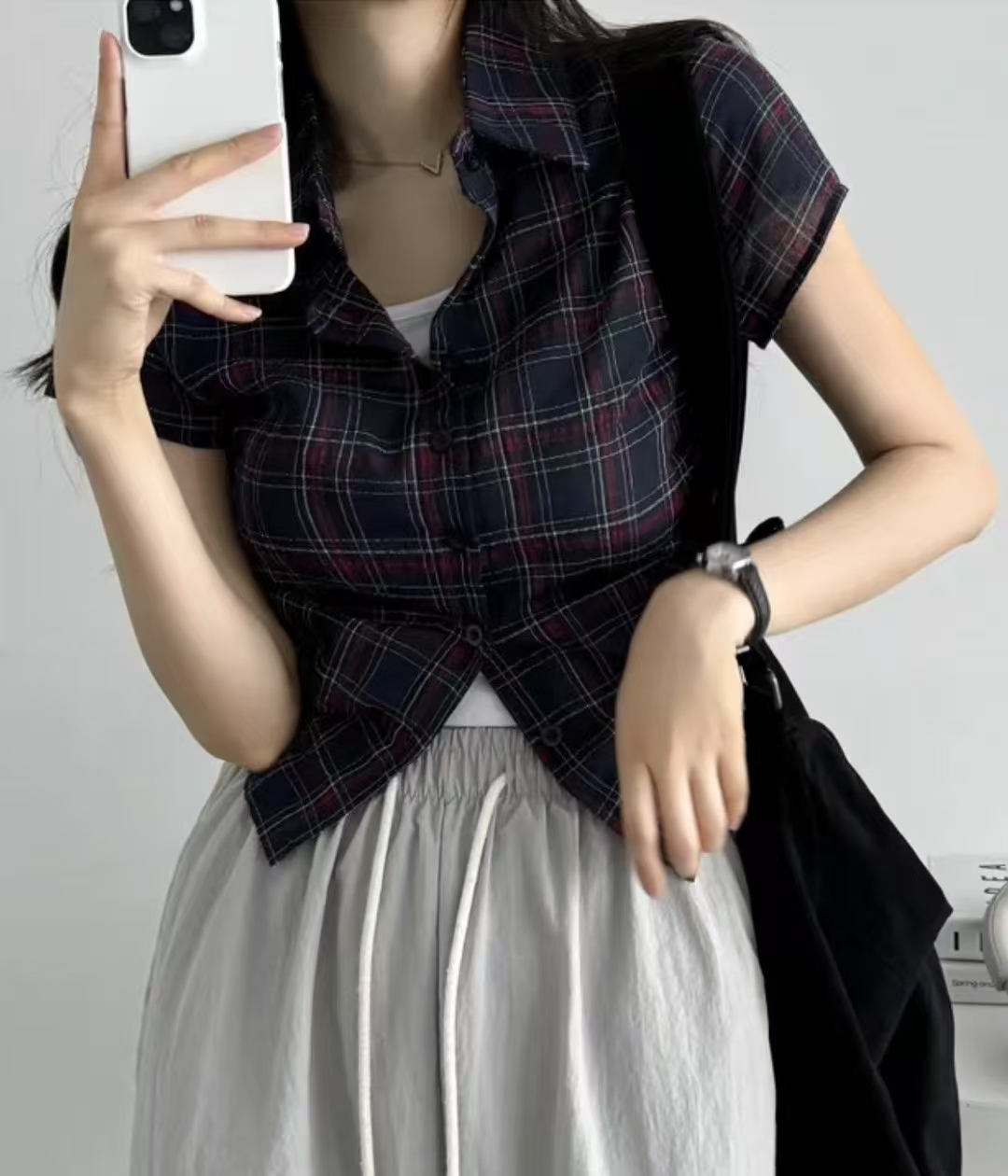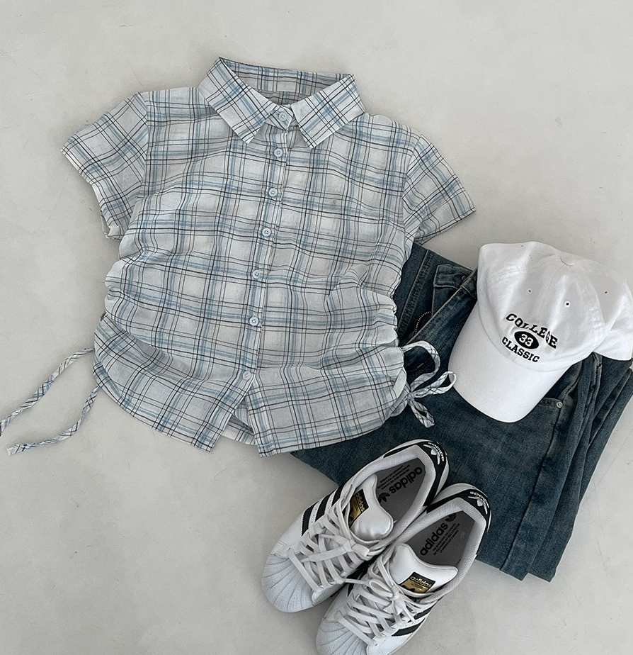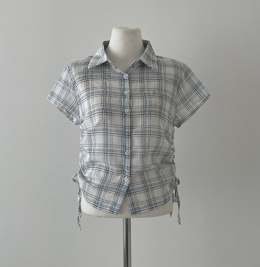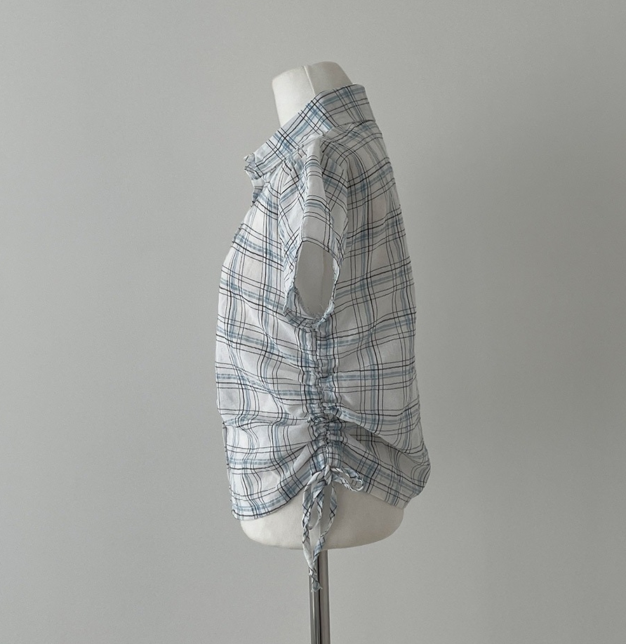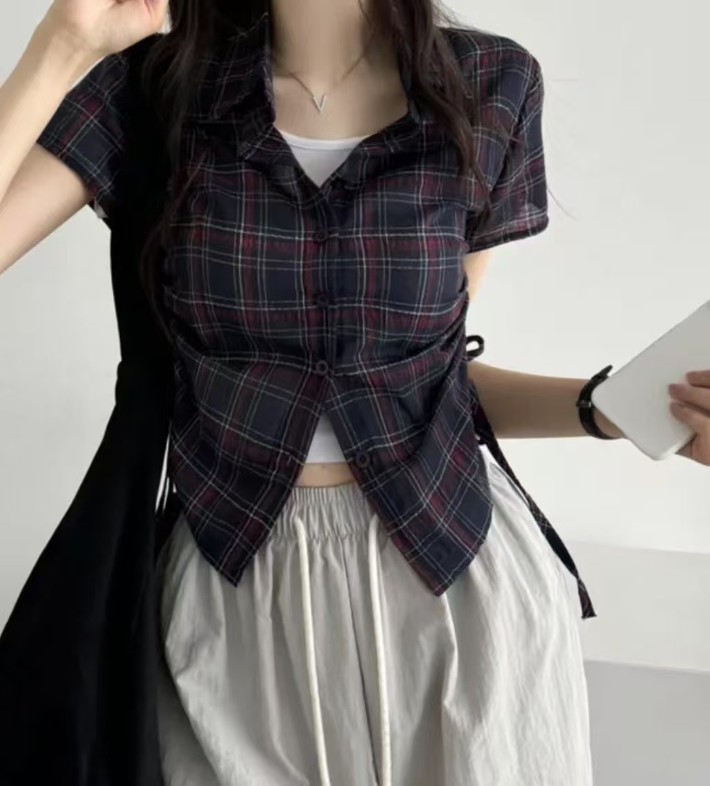 韩国chic格纹短袖单排扣衬衫女下摆抽褶抽绳设计百搭上衣