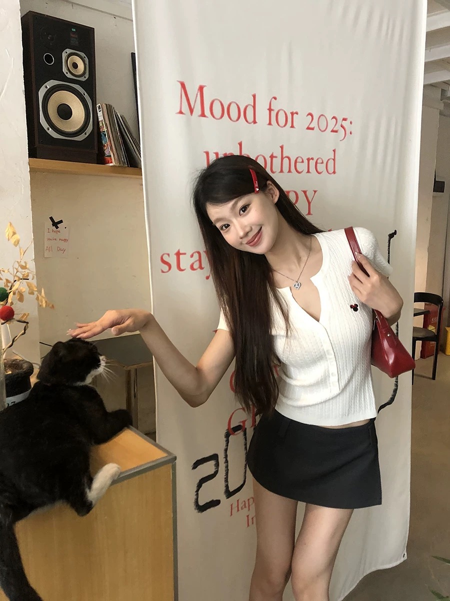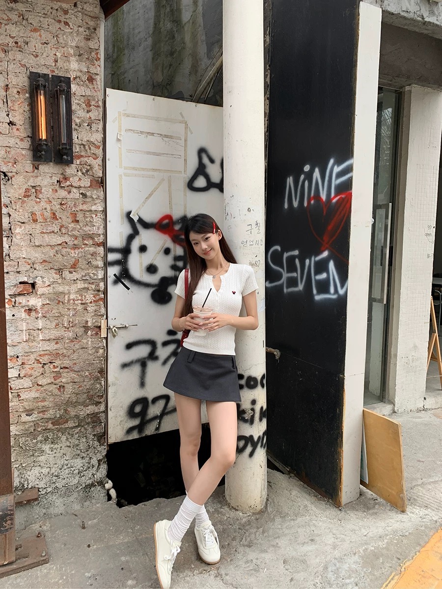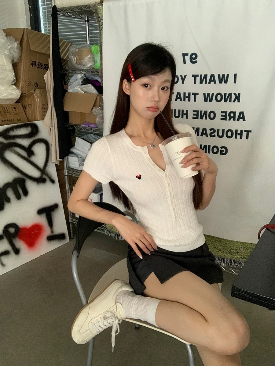 修身短袖t恤女2025新款爆款夏正肩修身白色显瘦针织设计感上衣