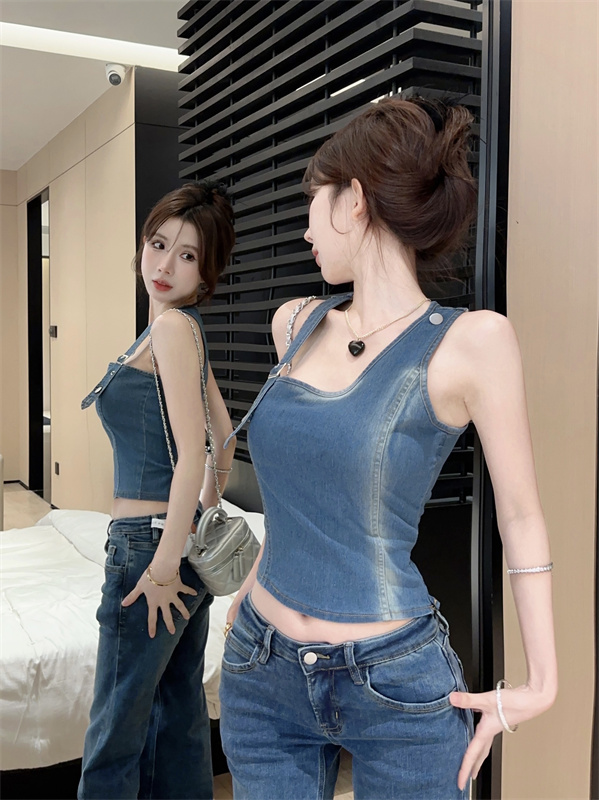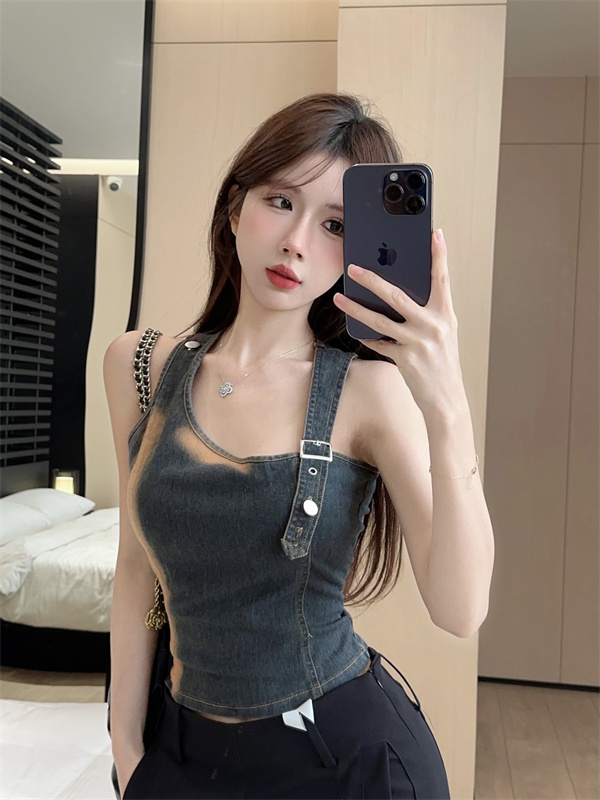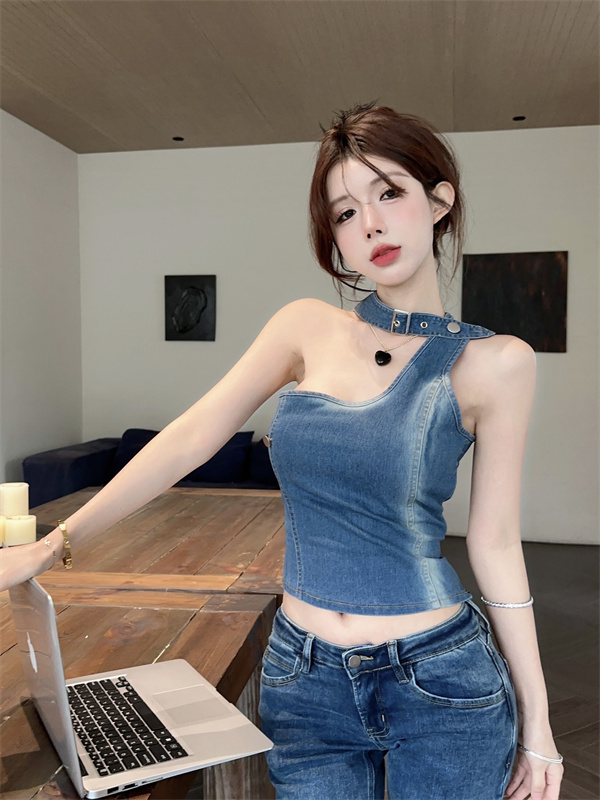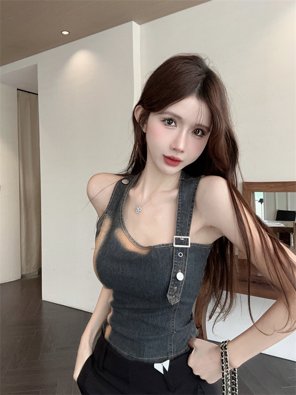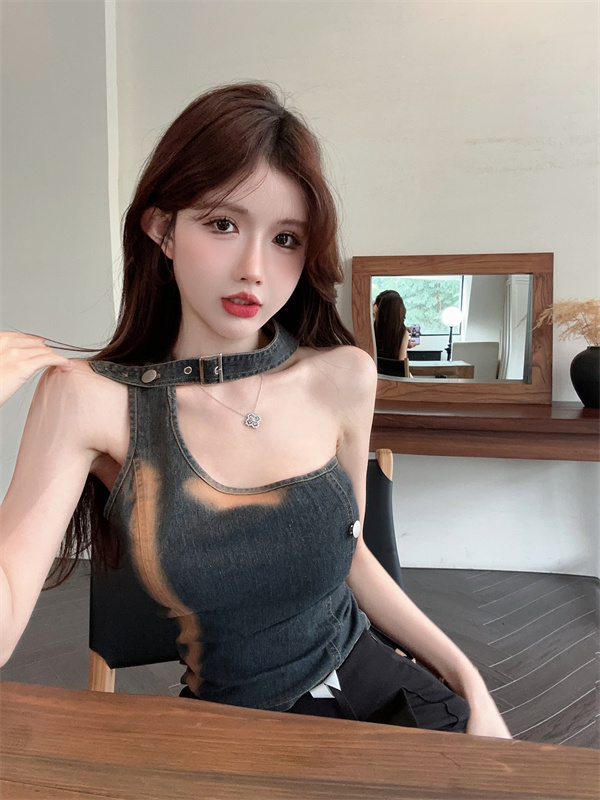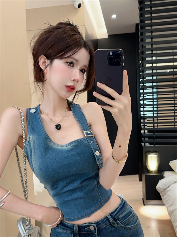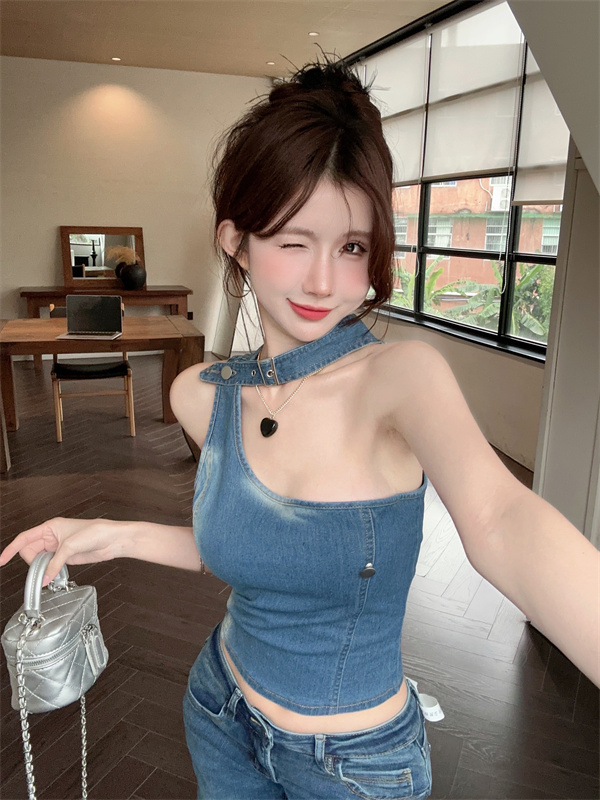 实拍实价~辣妹高腰短款挂脖牛仔背心女夏季新款小众两穿吊带上衣