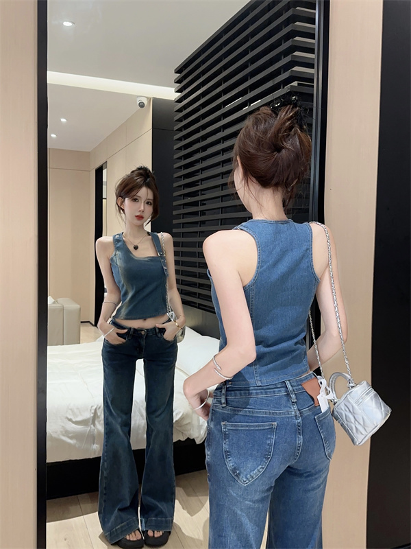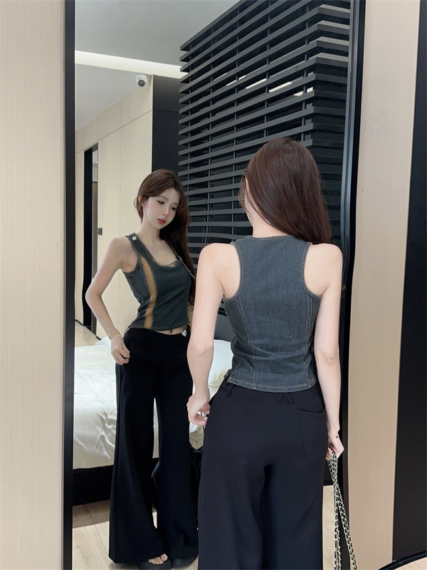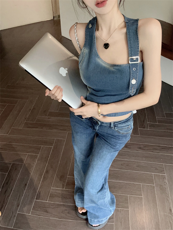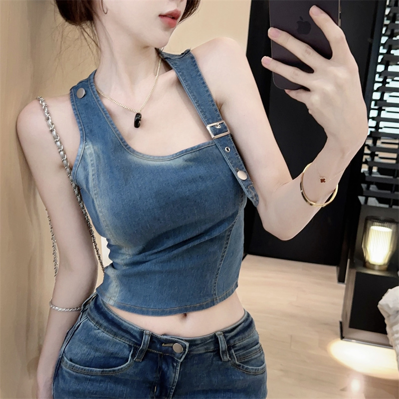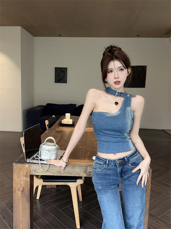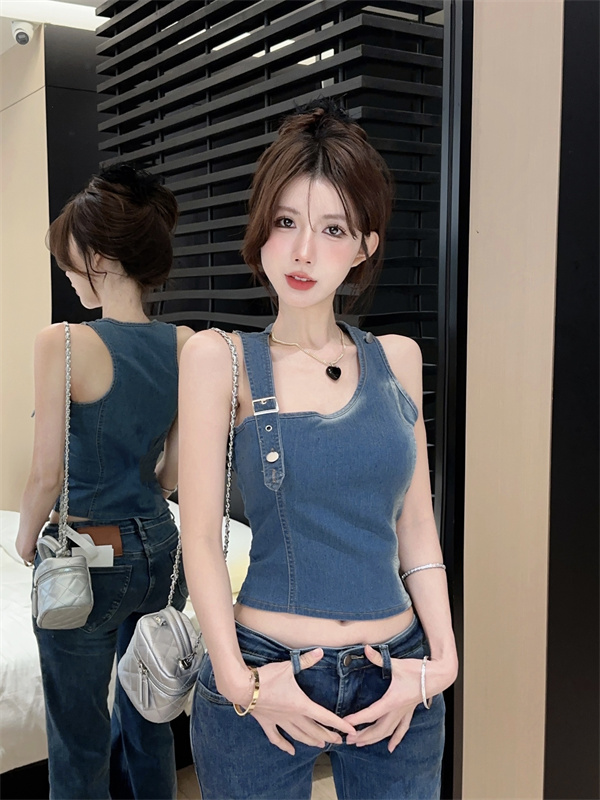 实拍实价~辣妹高腰短款挂脖牛仔背心女夏季新款小众两穿吊带上衣