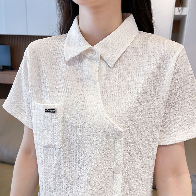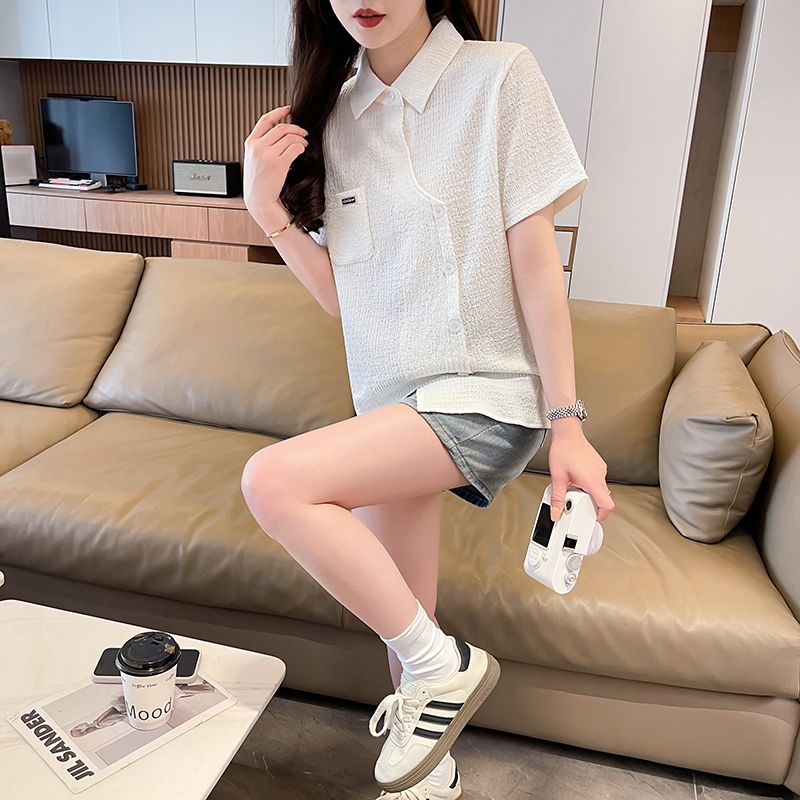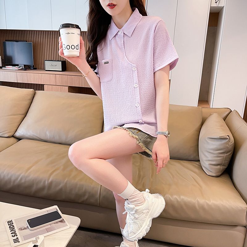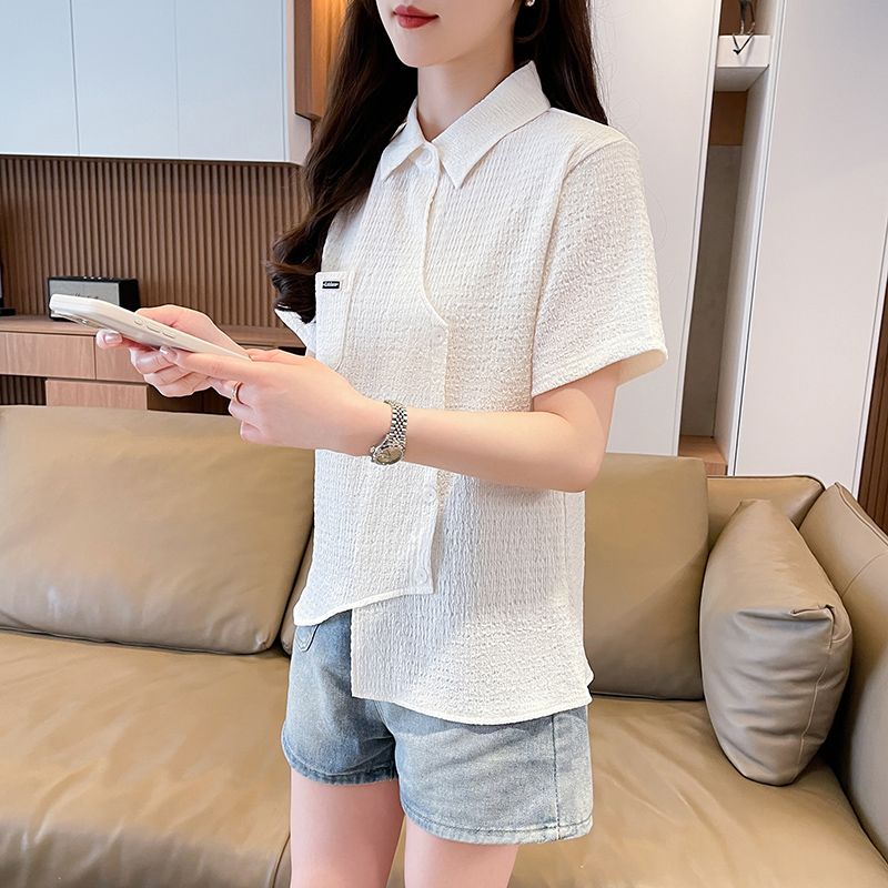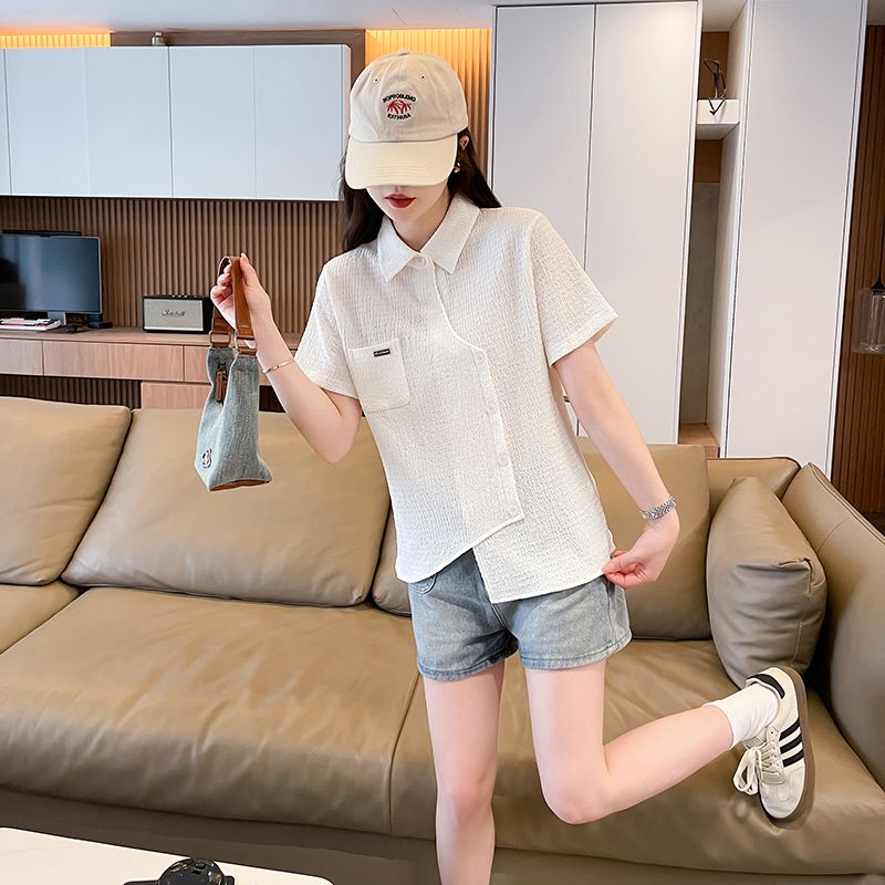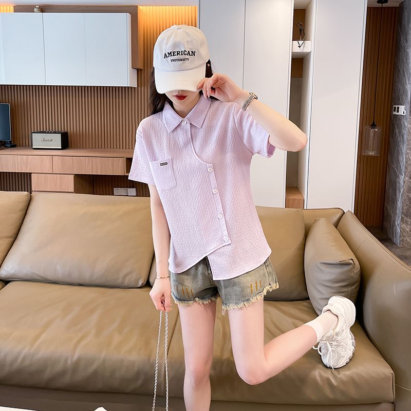 Real shot of large size wrinkled cloth T-shirt for women 2025 summer new short-sleeved shirt design with pockets irregular top