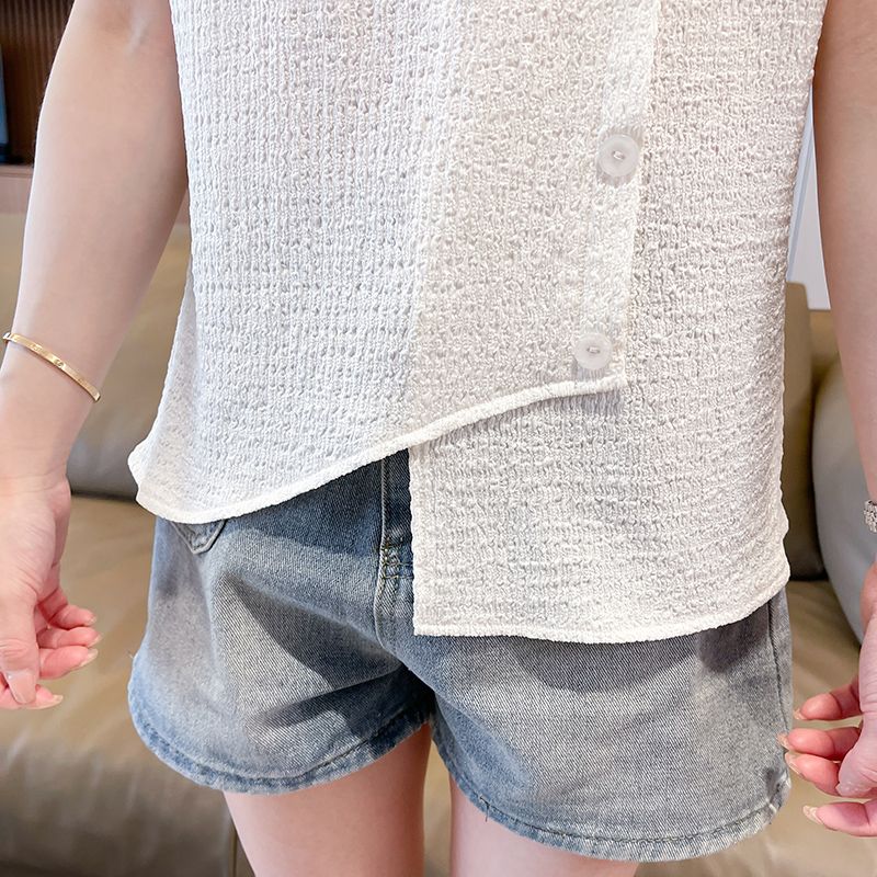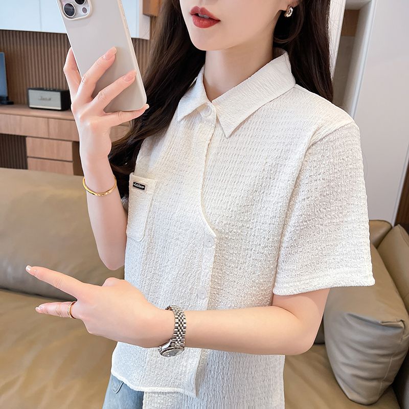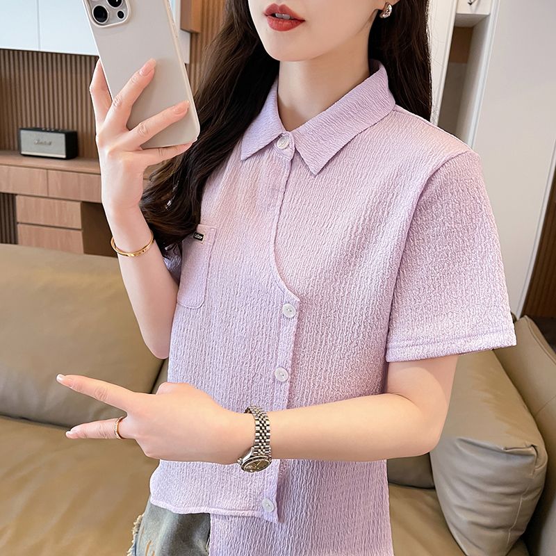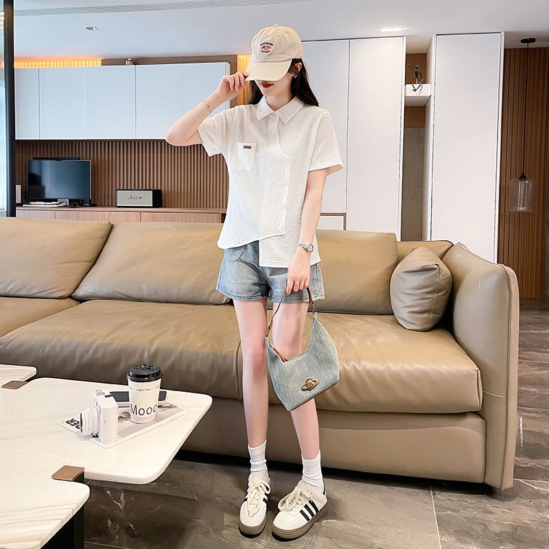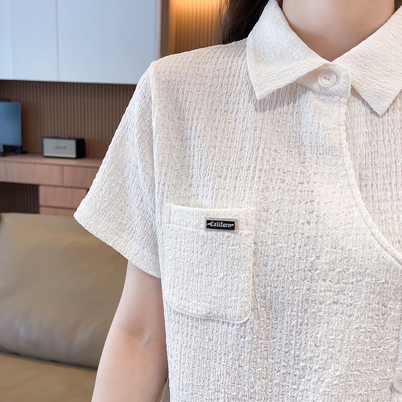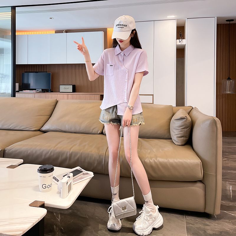 Real shot of large size wrinkled cloth T-shirt for women 2025 summer new short-sleeved shirt design with pockets irregular top