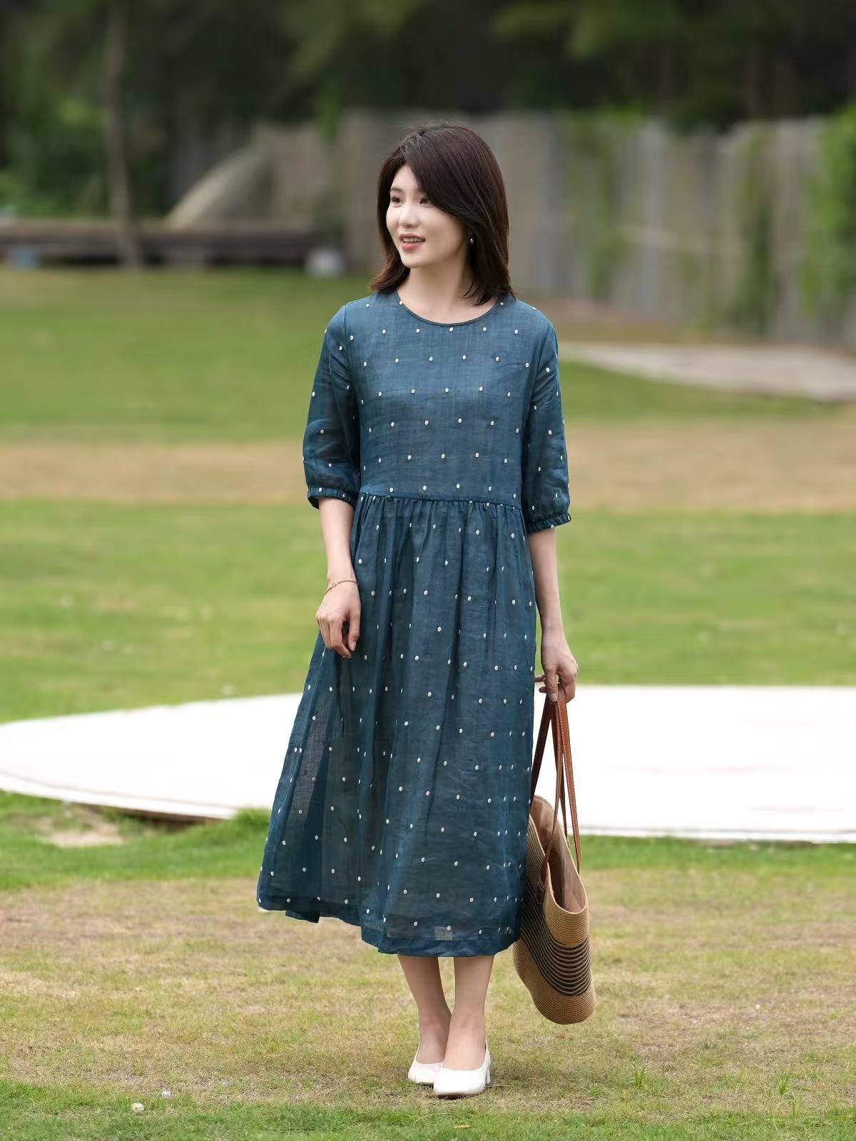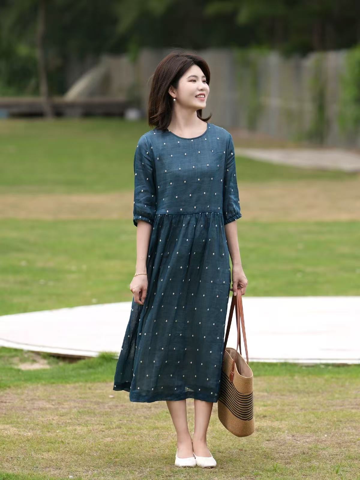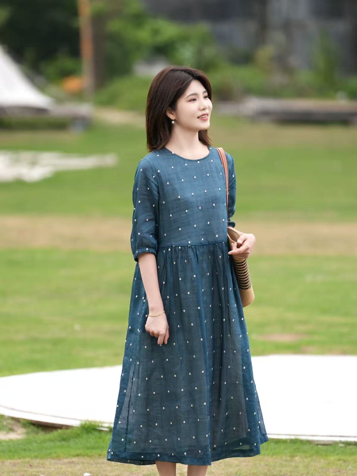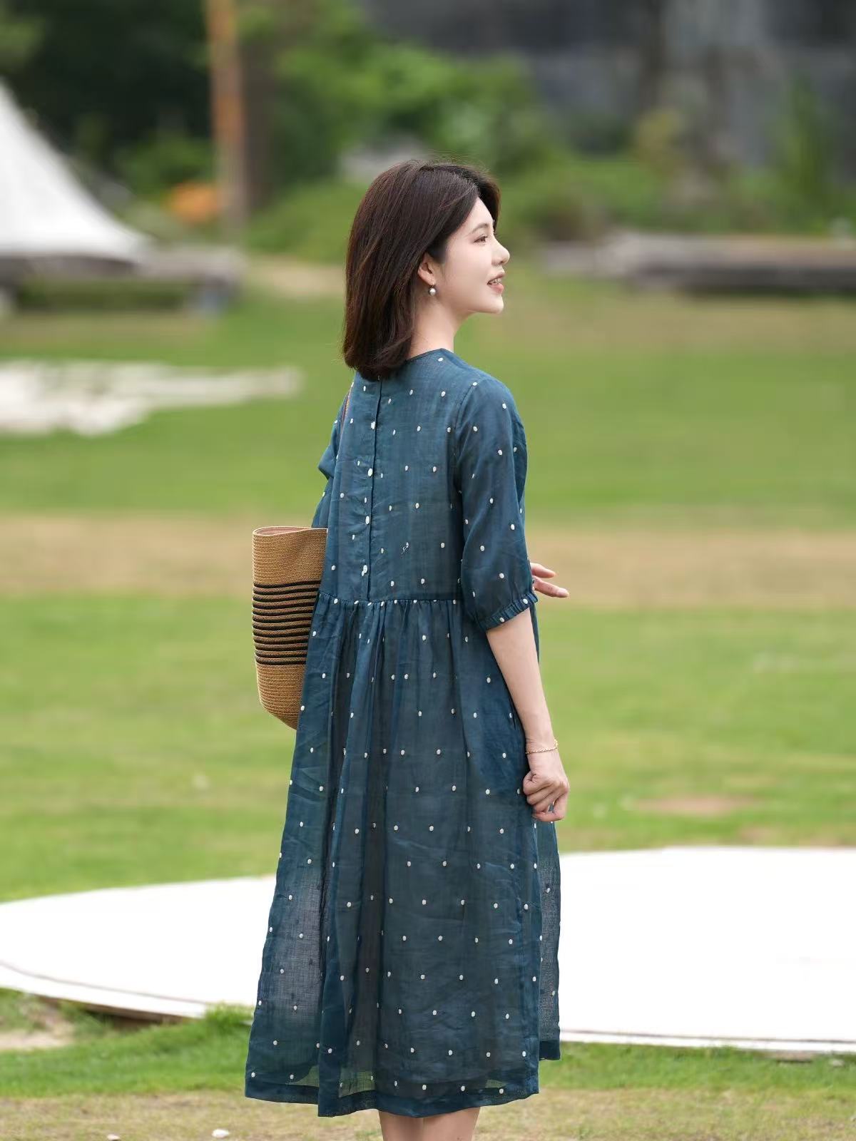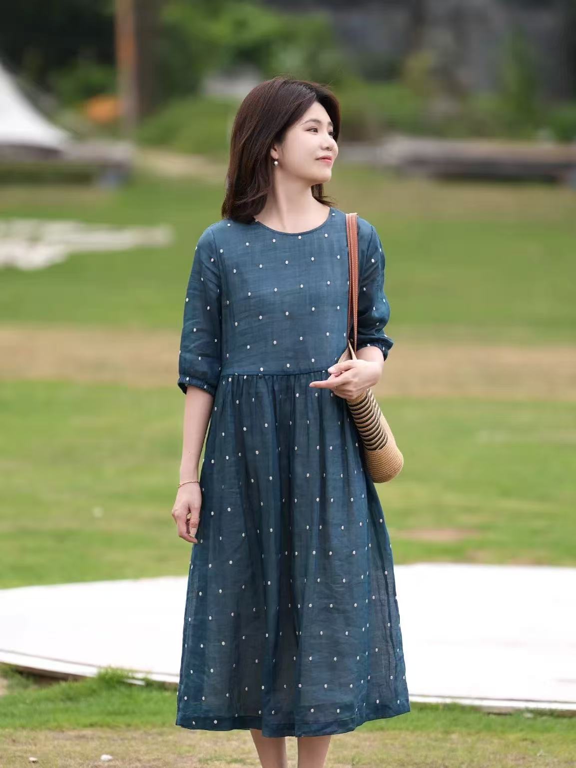 2025轻盈高端苎麻印花圆领大摆文艺气质连衣裙宽松文艺女