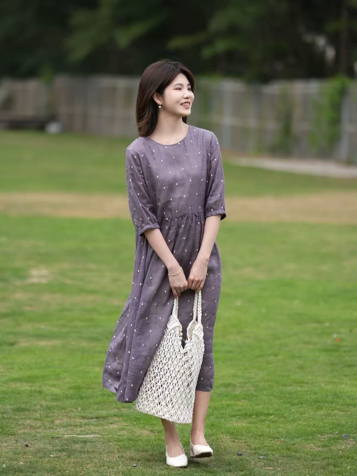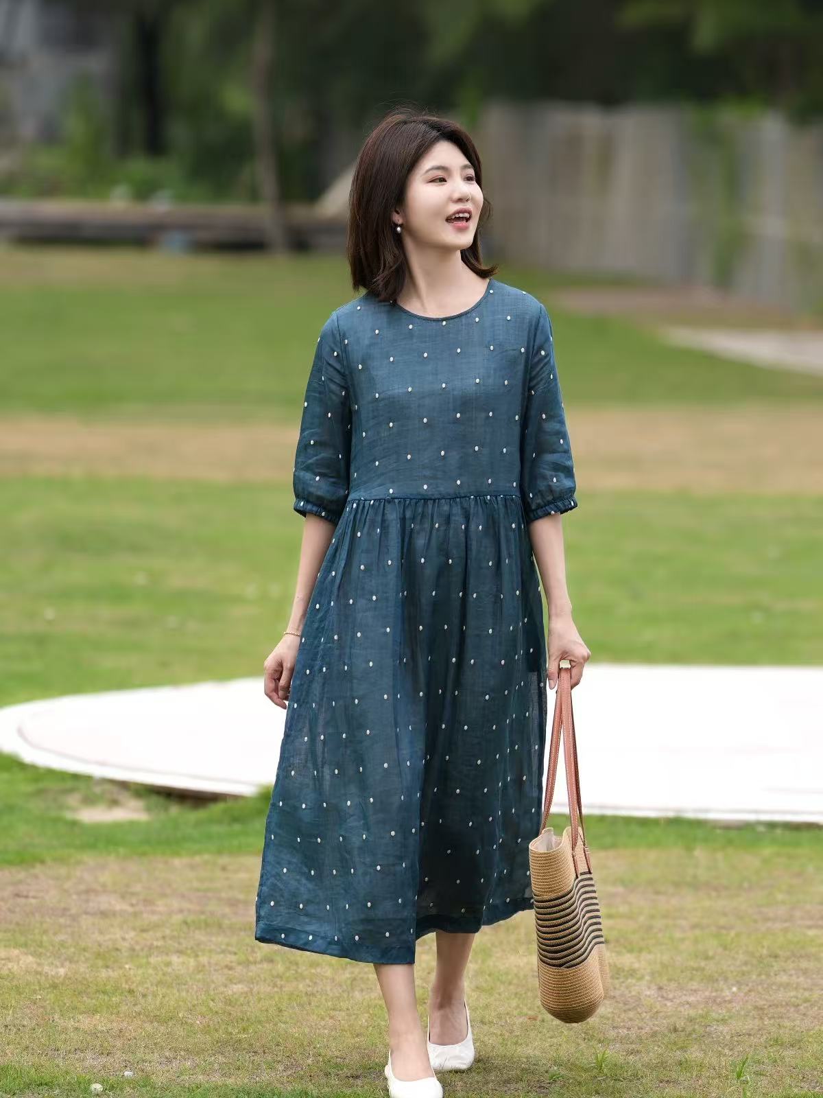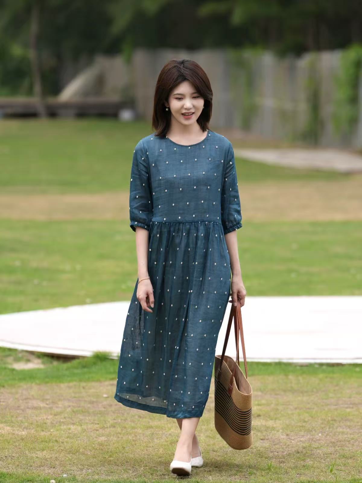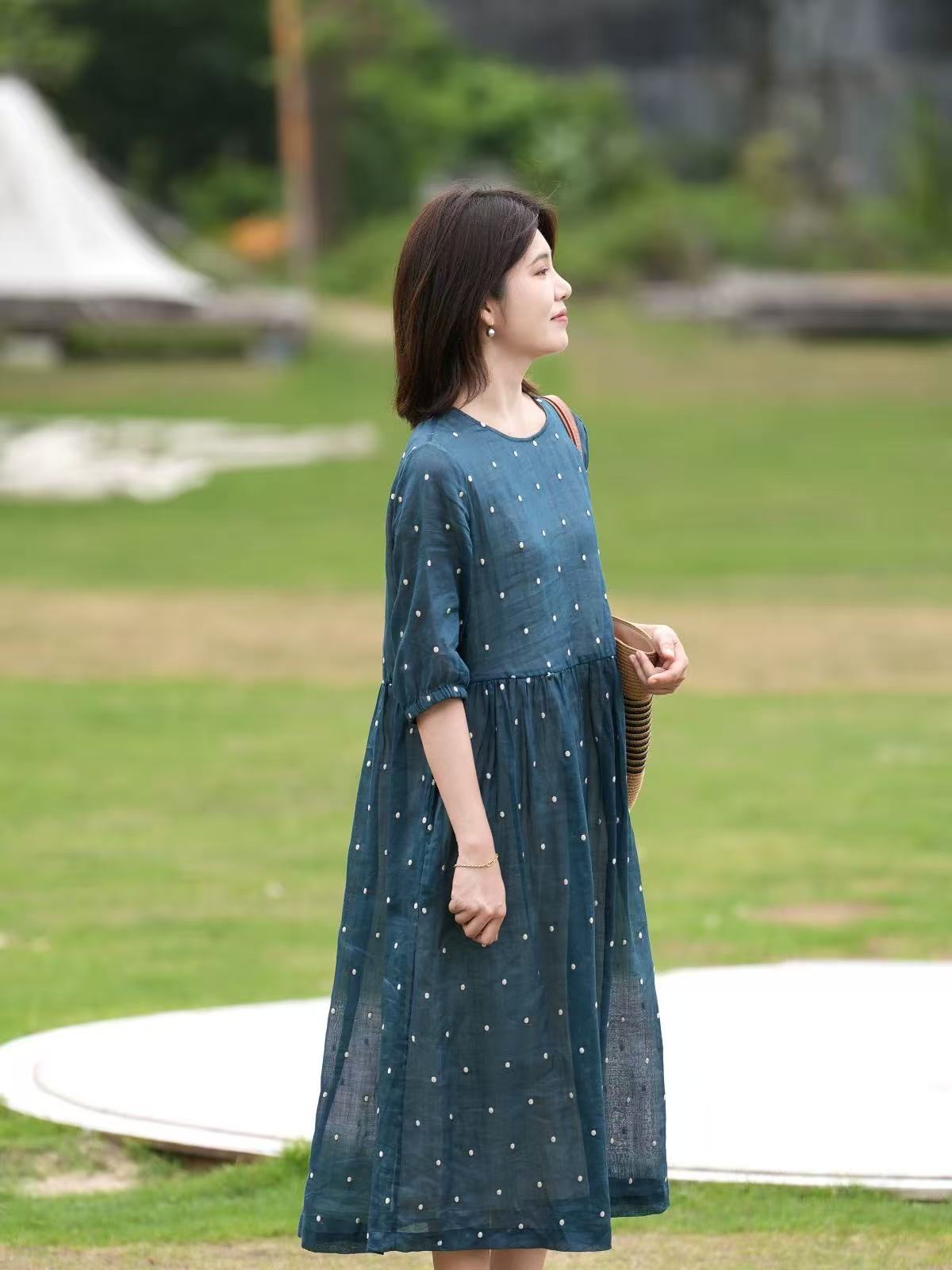 2025轻盈高端苎麻印花圆领大摆文艺气质连衣裙宽松文艺女