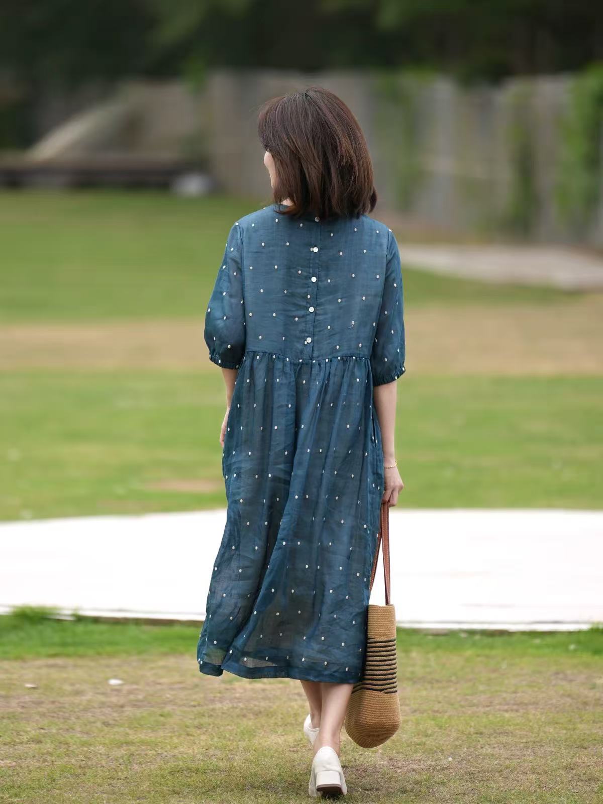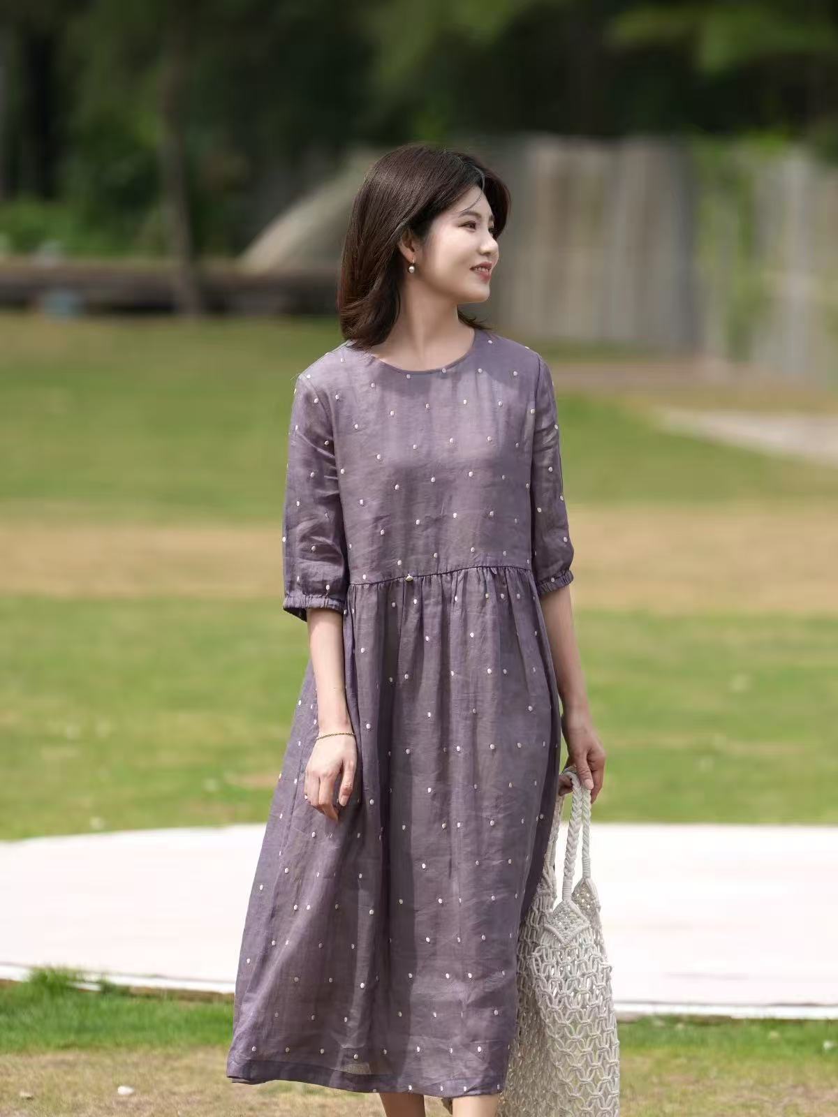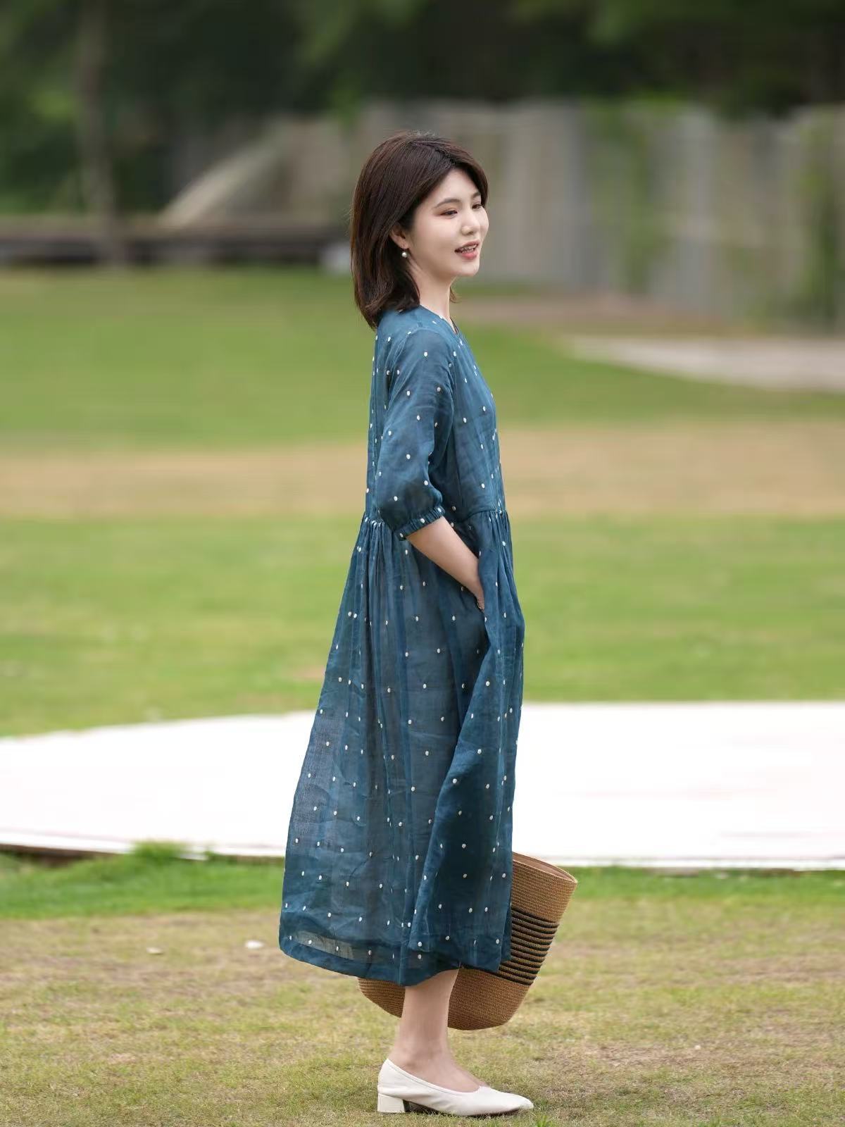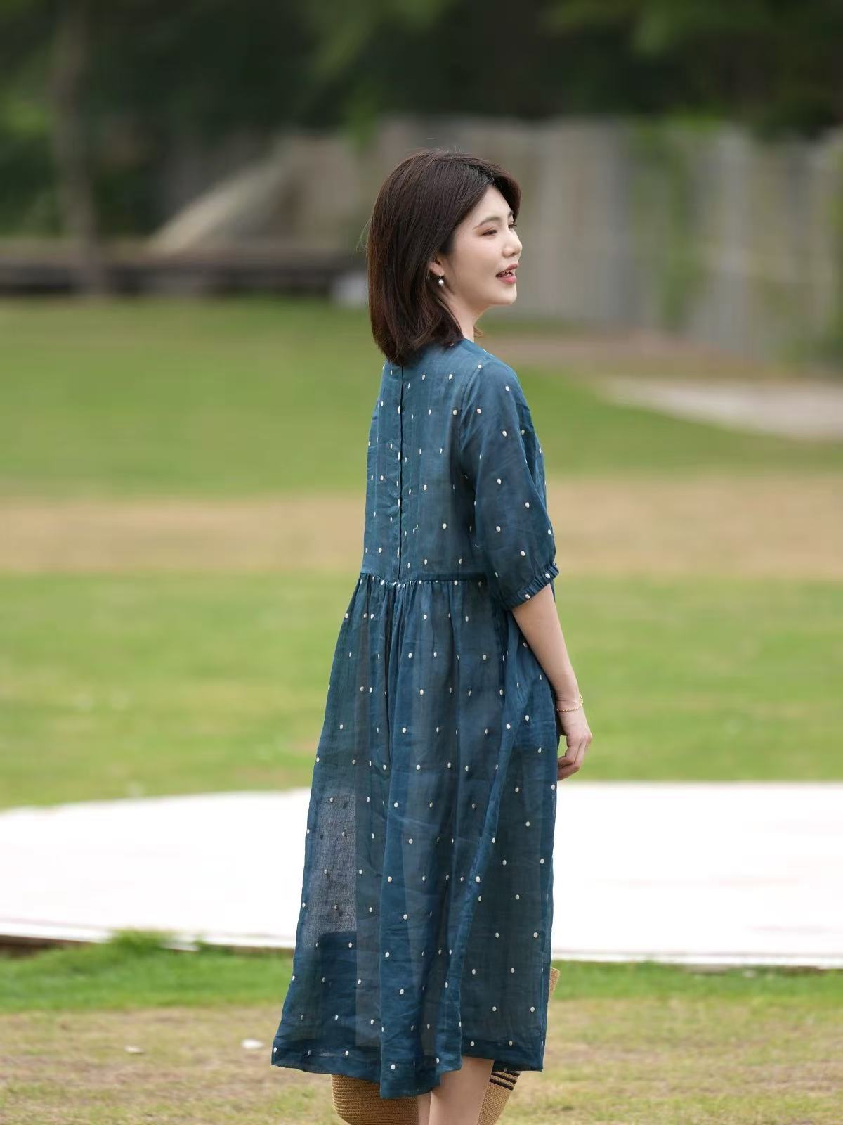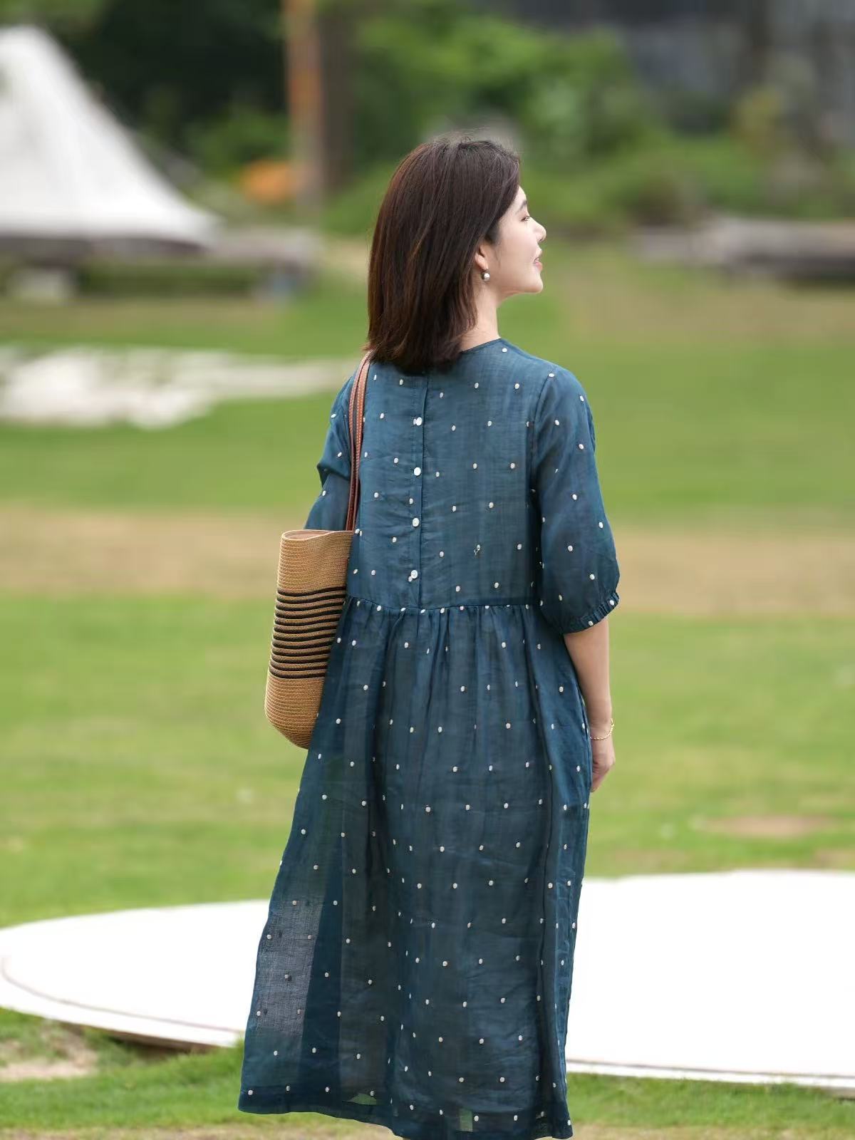 2025轻盈高端苎麻印花圆领大摆文艺气质连衣裙宽松文艺女