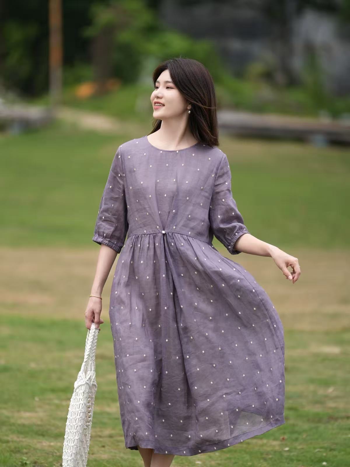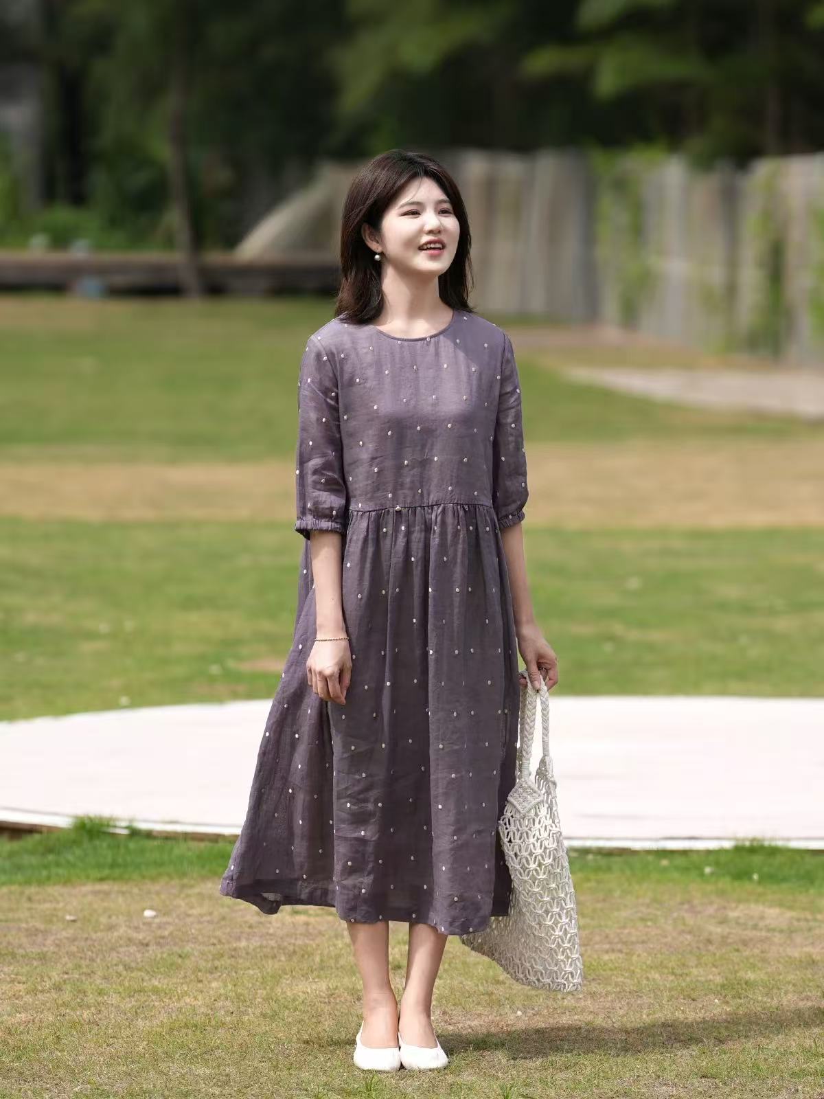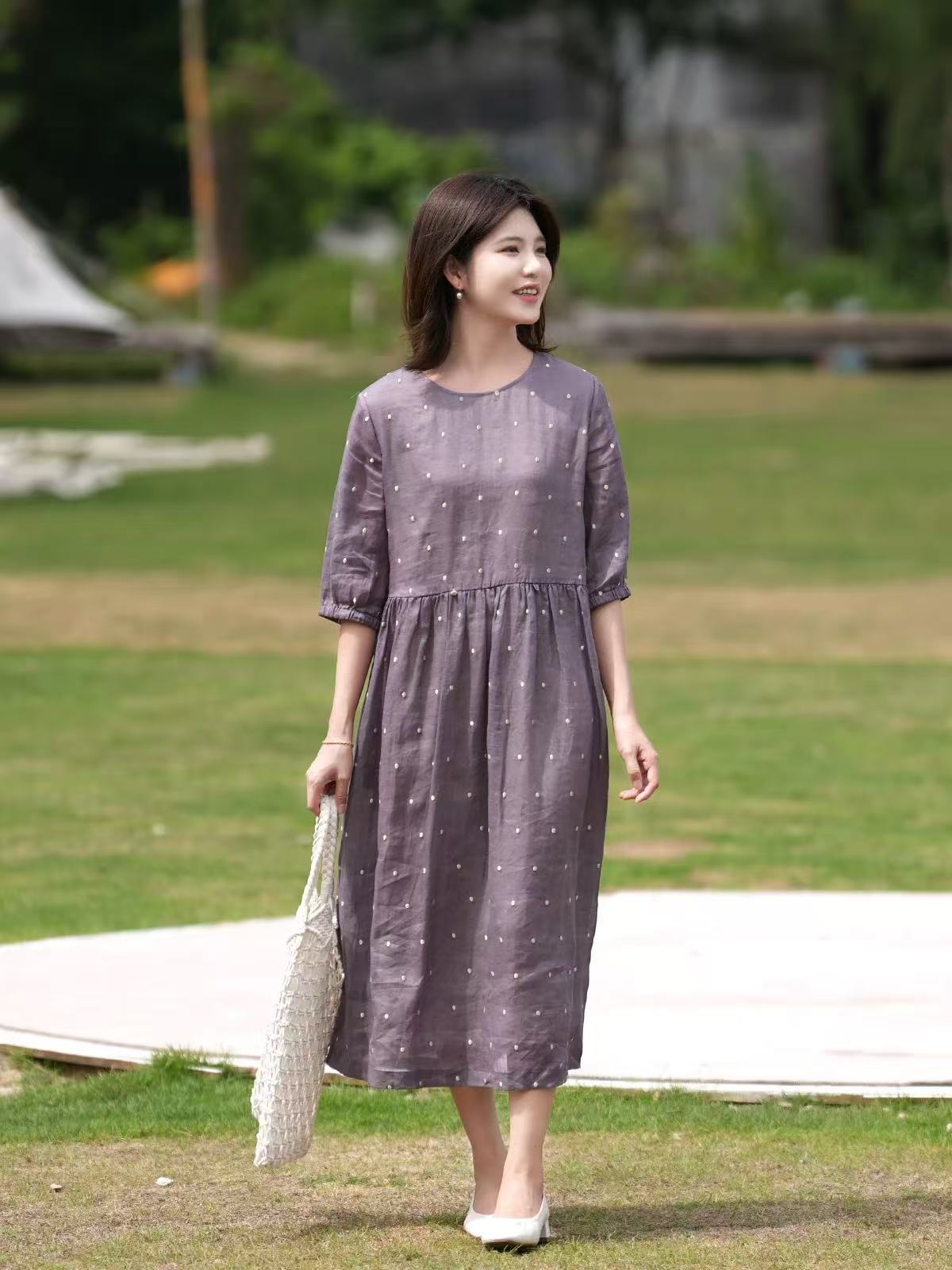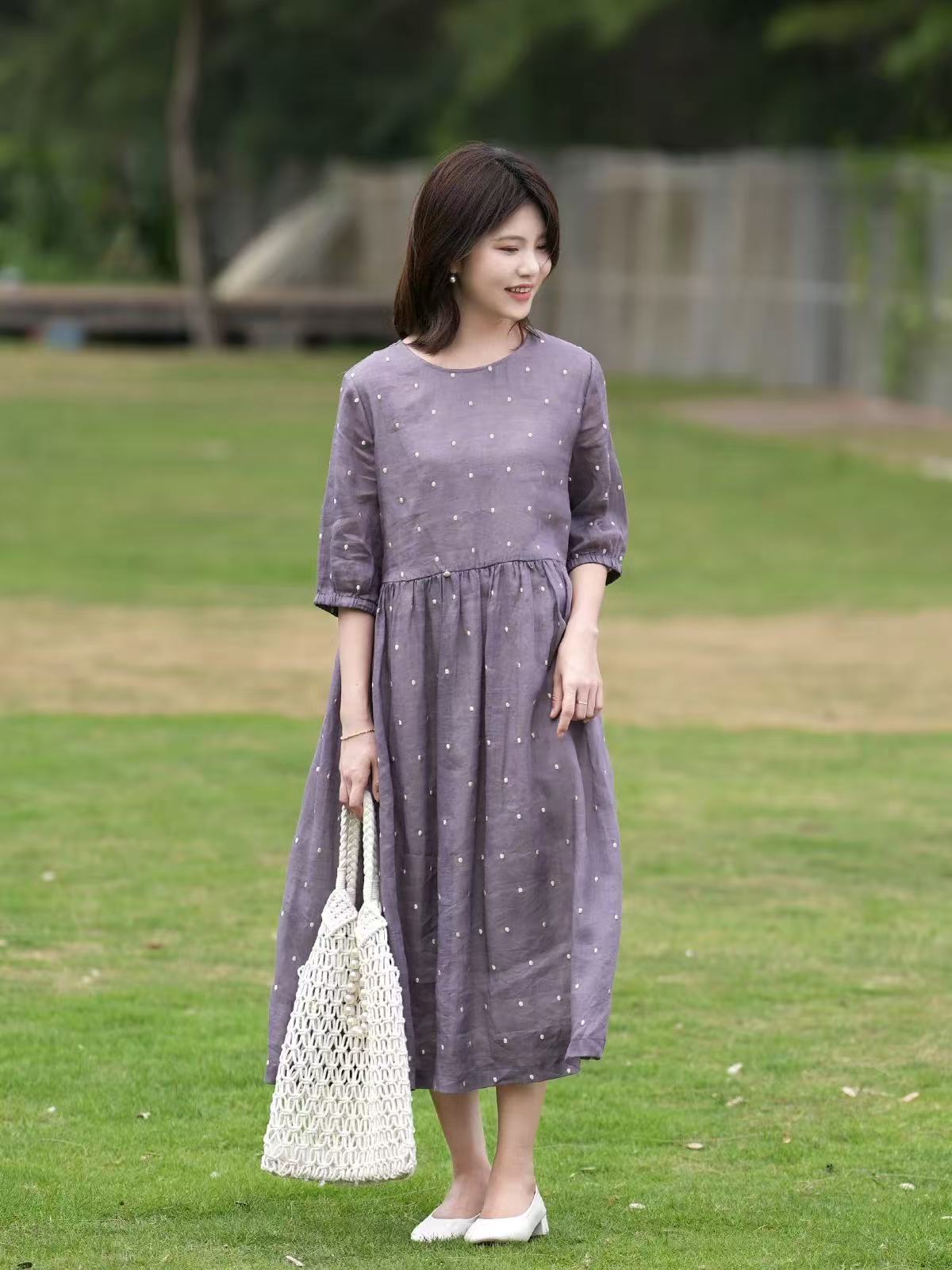 2025轻盈高端苎麻印花圆领大摆文艺气质连衣裙宽松文艺女