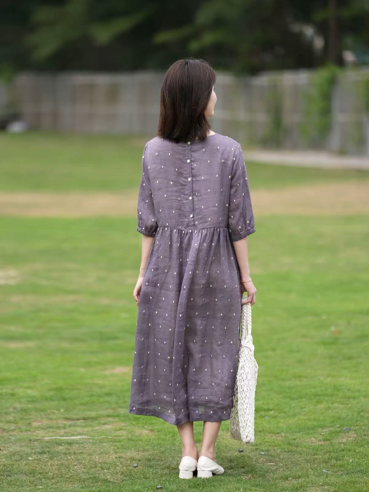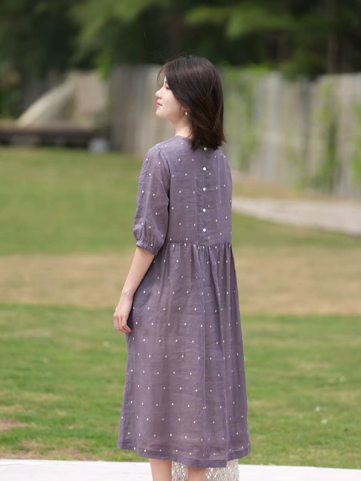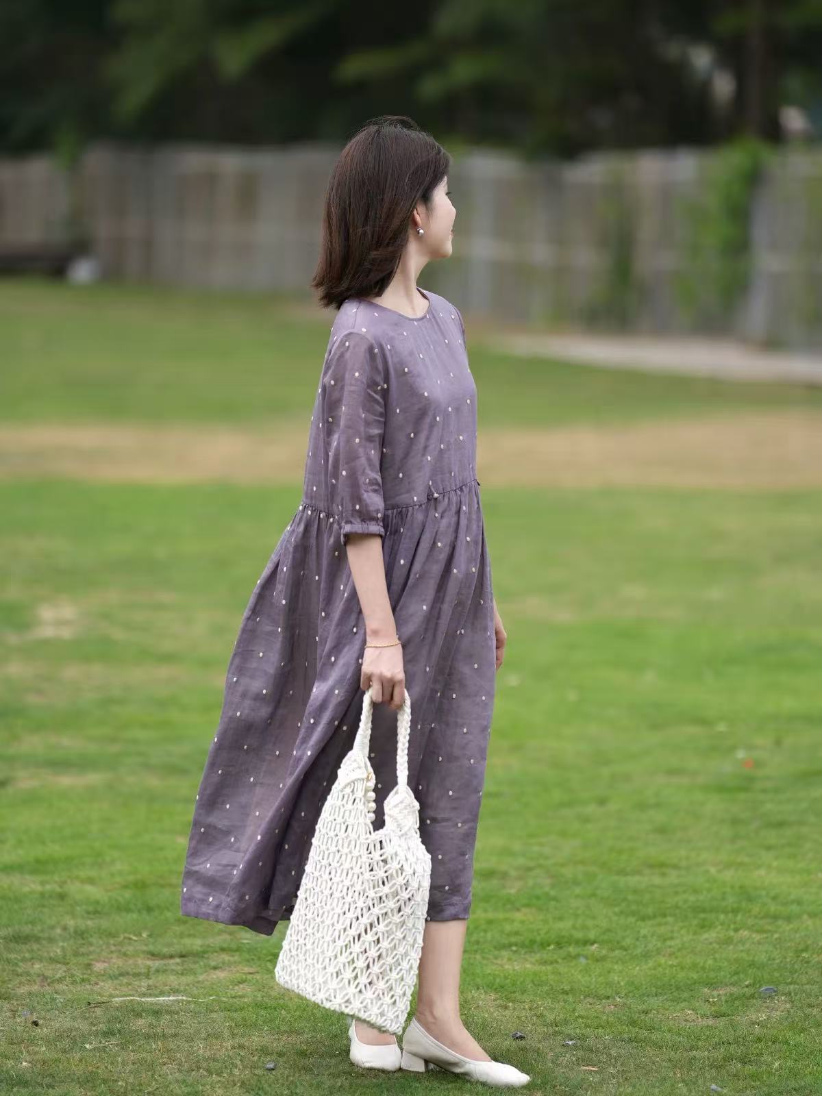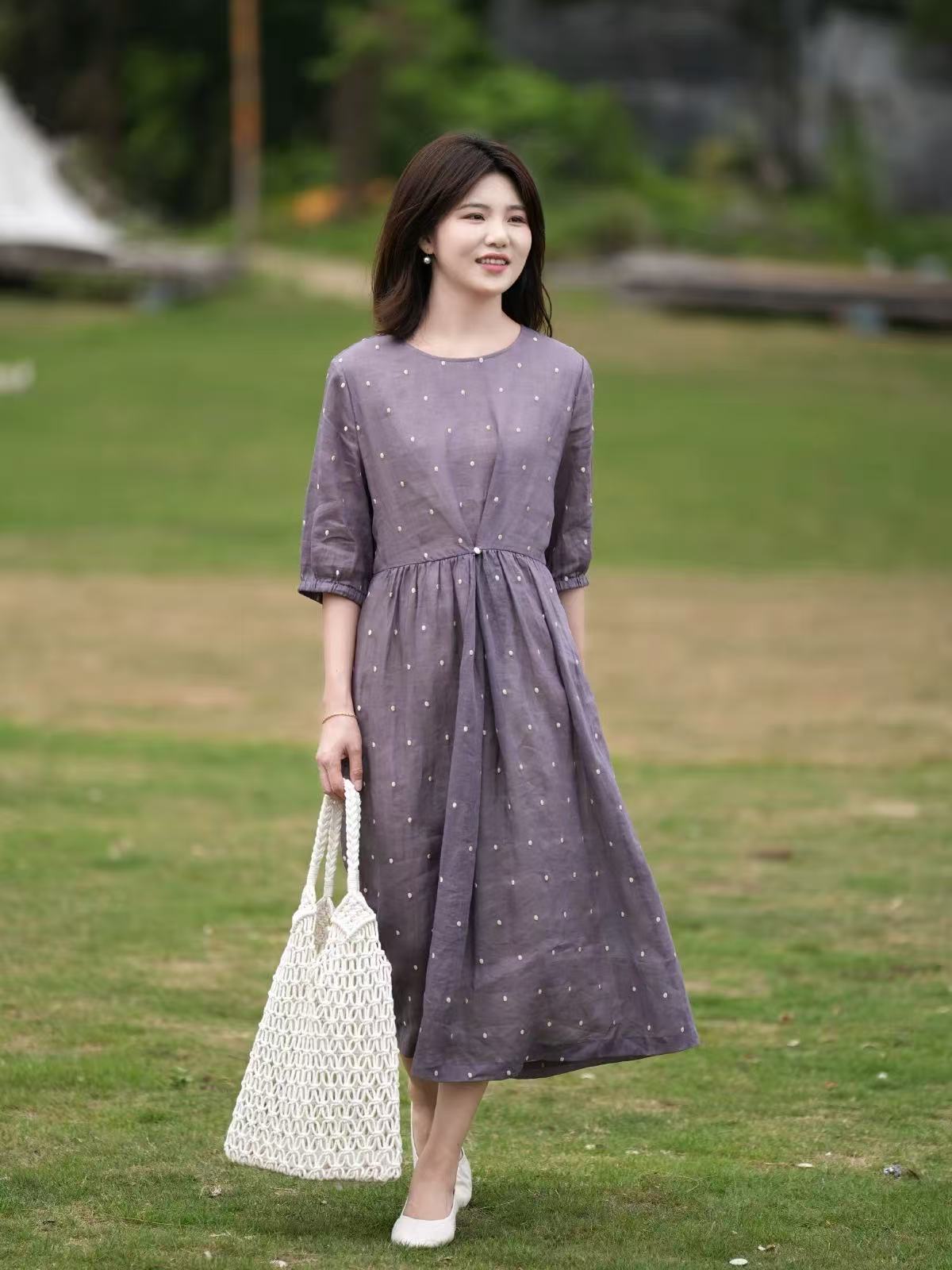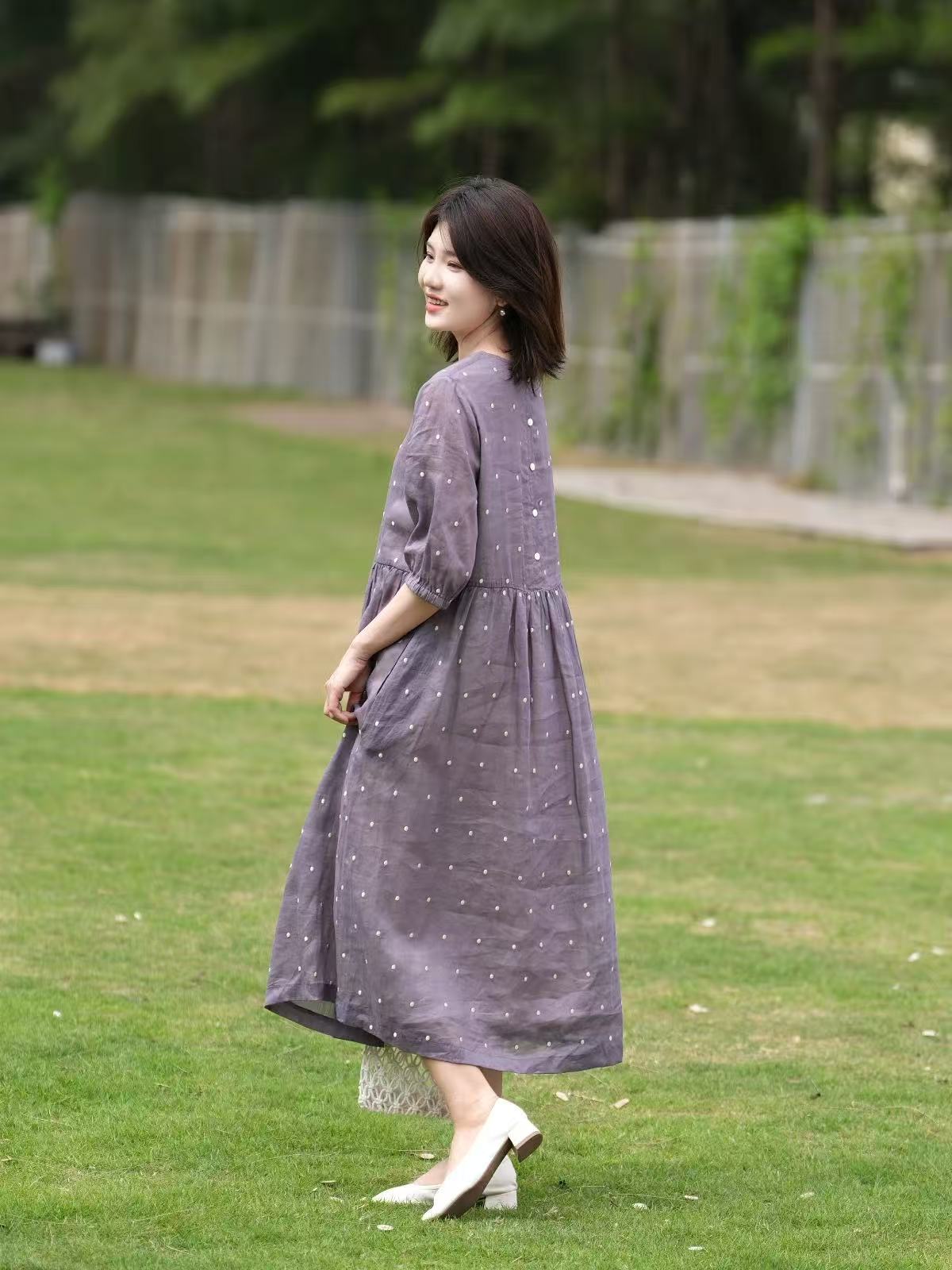 2025轻盈高端苎麻印花圆领大摆文艺气质连衣裙宽松文艺女