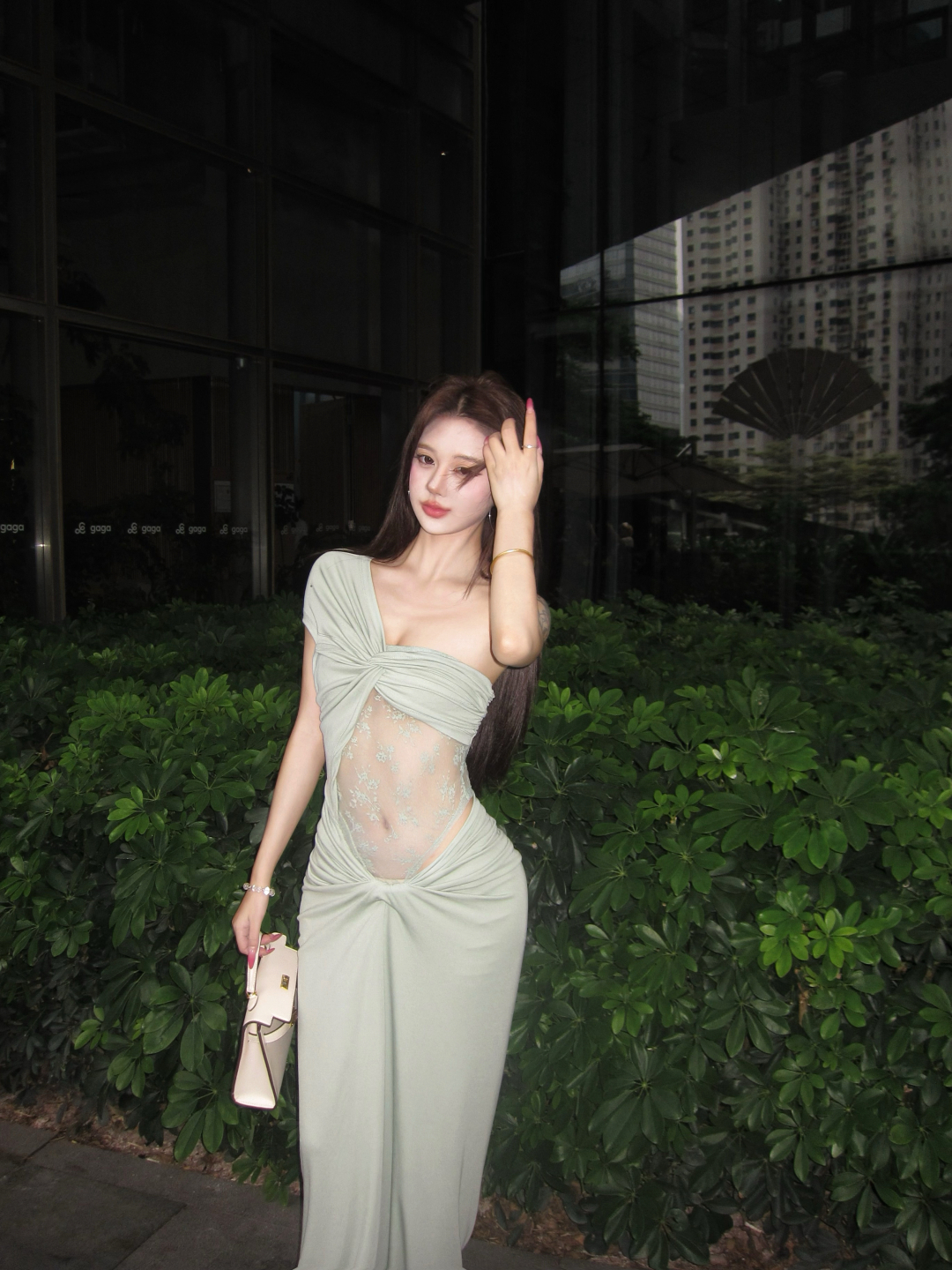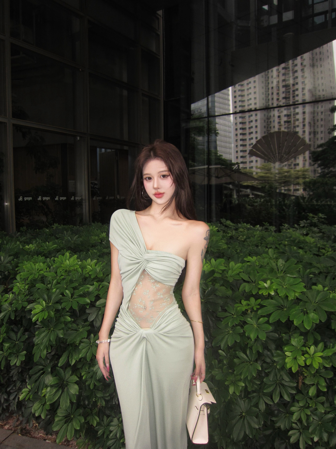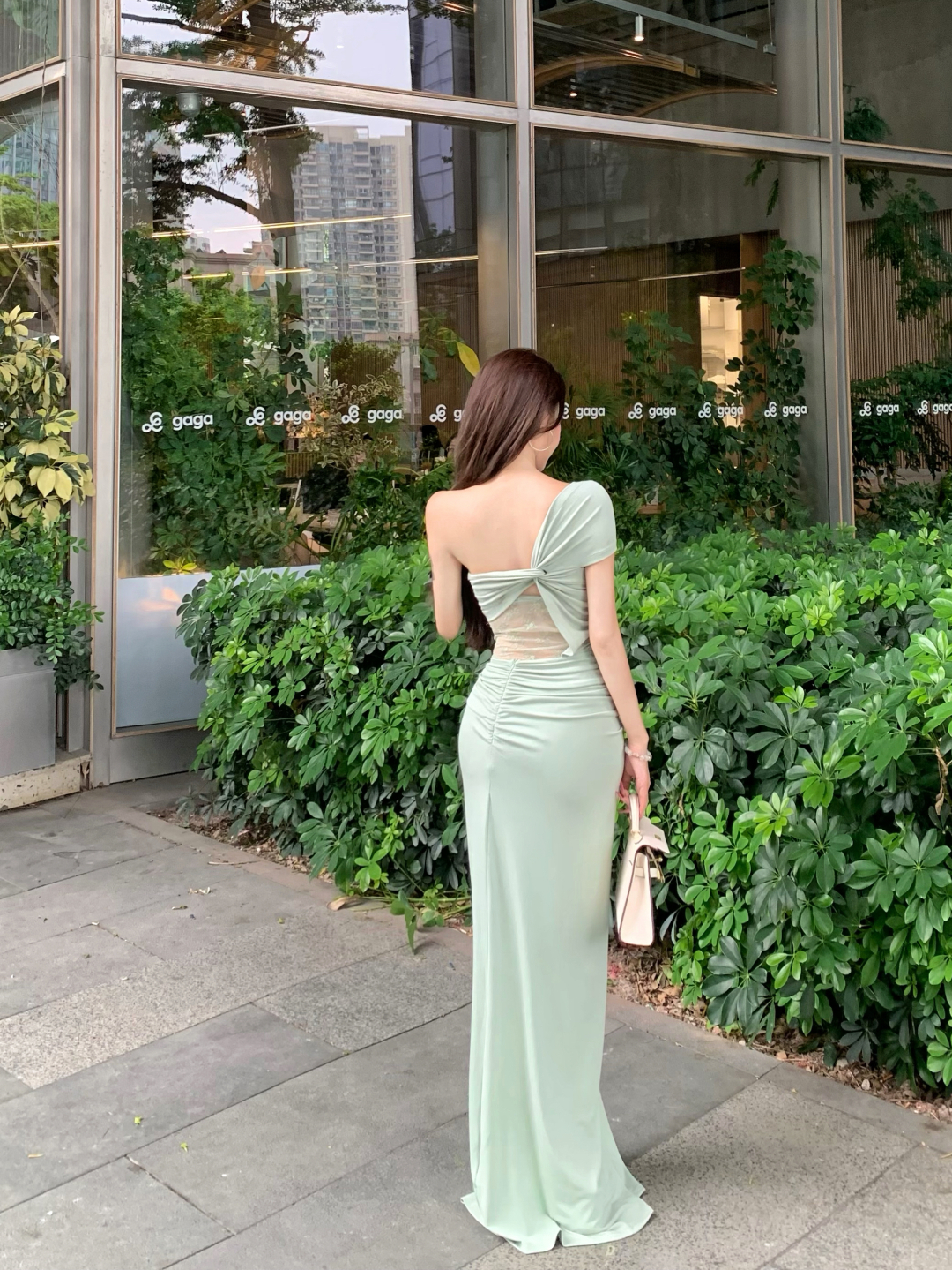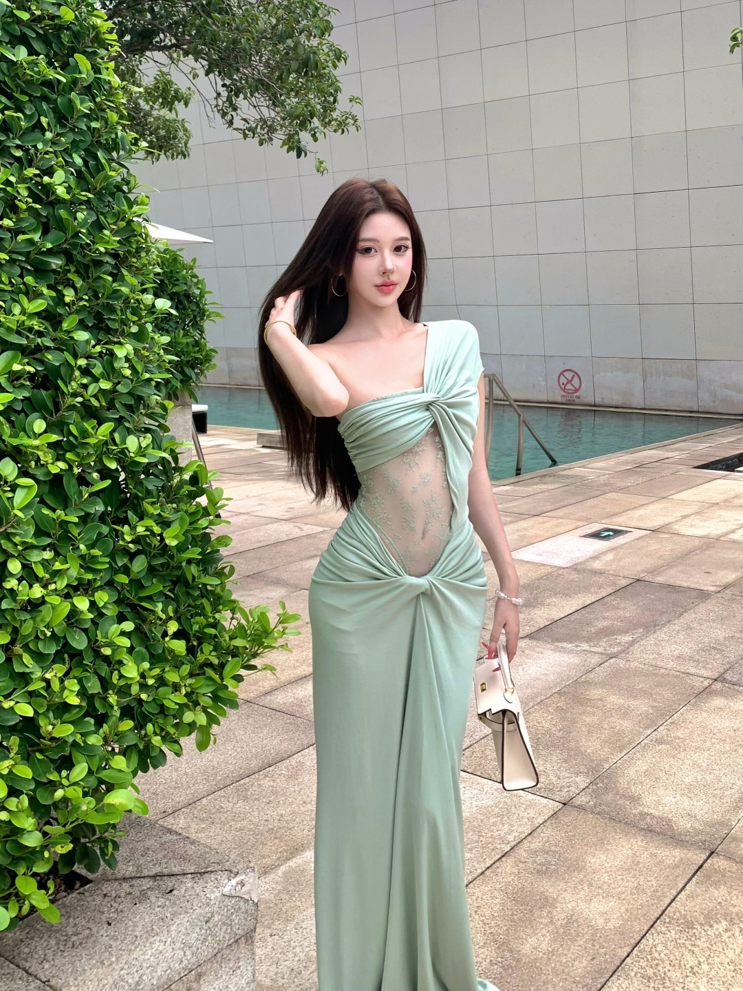 实拍实价 豆绿色设计感斜肩扭结蕾丝拼接性感小众短袖长款连衣裙