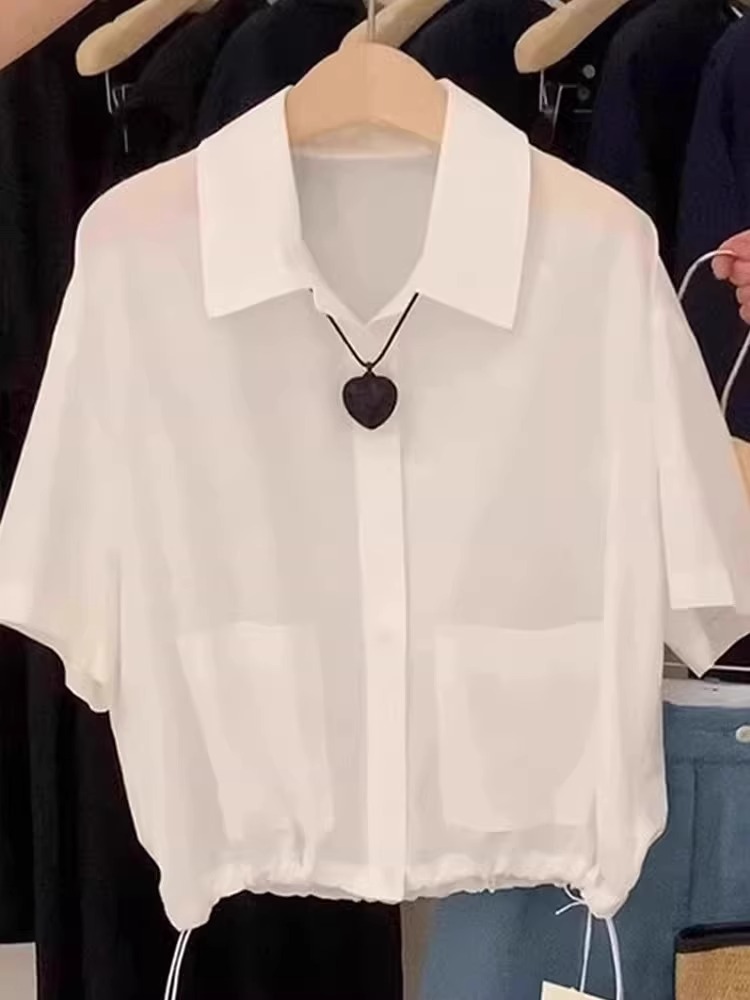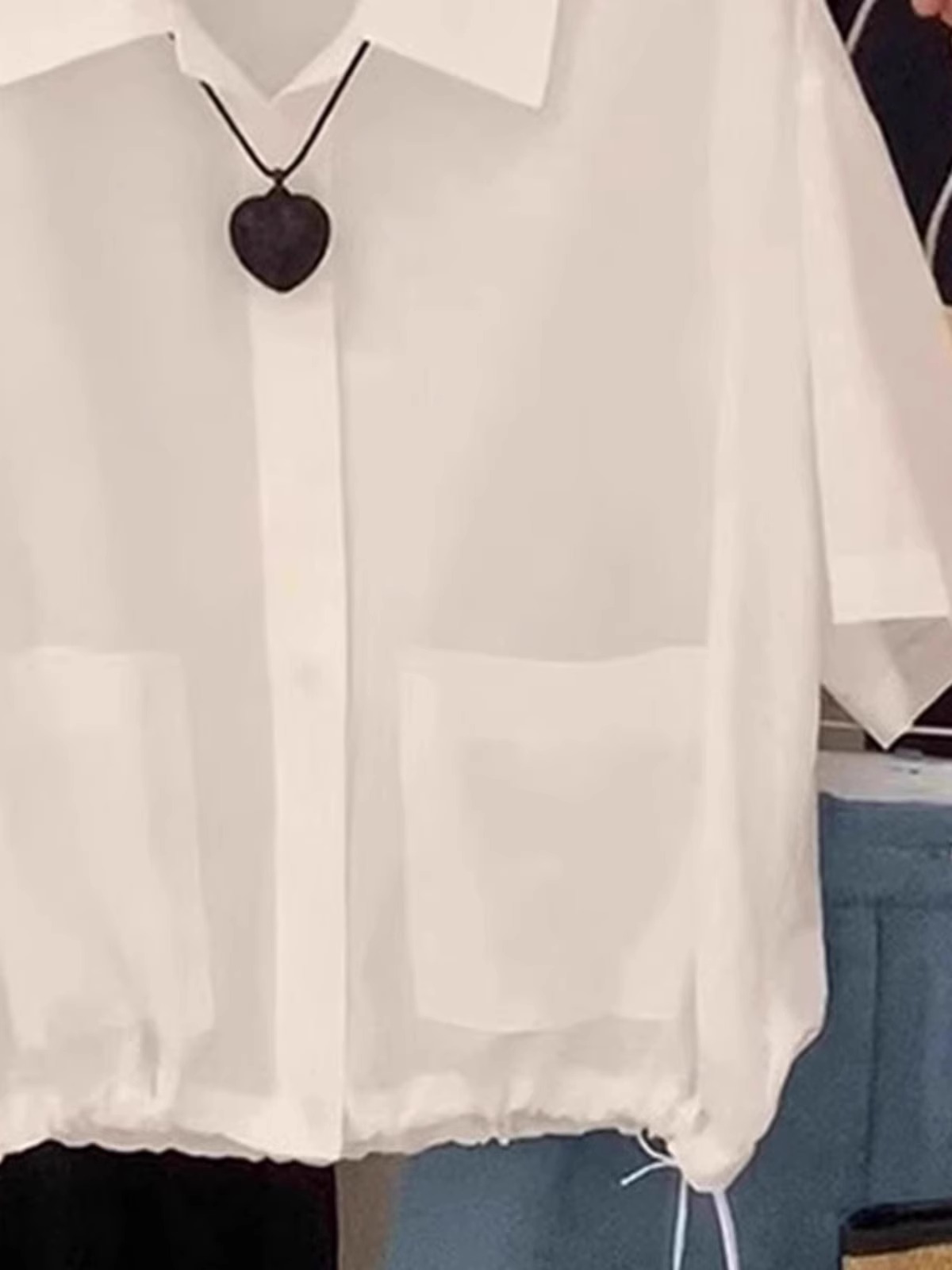 白色短袖衬衫女2025夏季薄款设计感抽绳宽松休闲短款防晒衬衣上衣