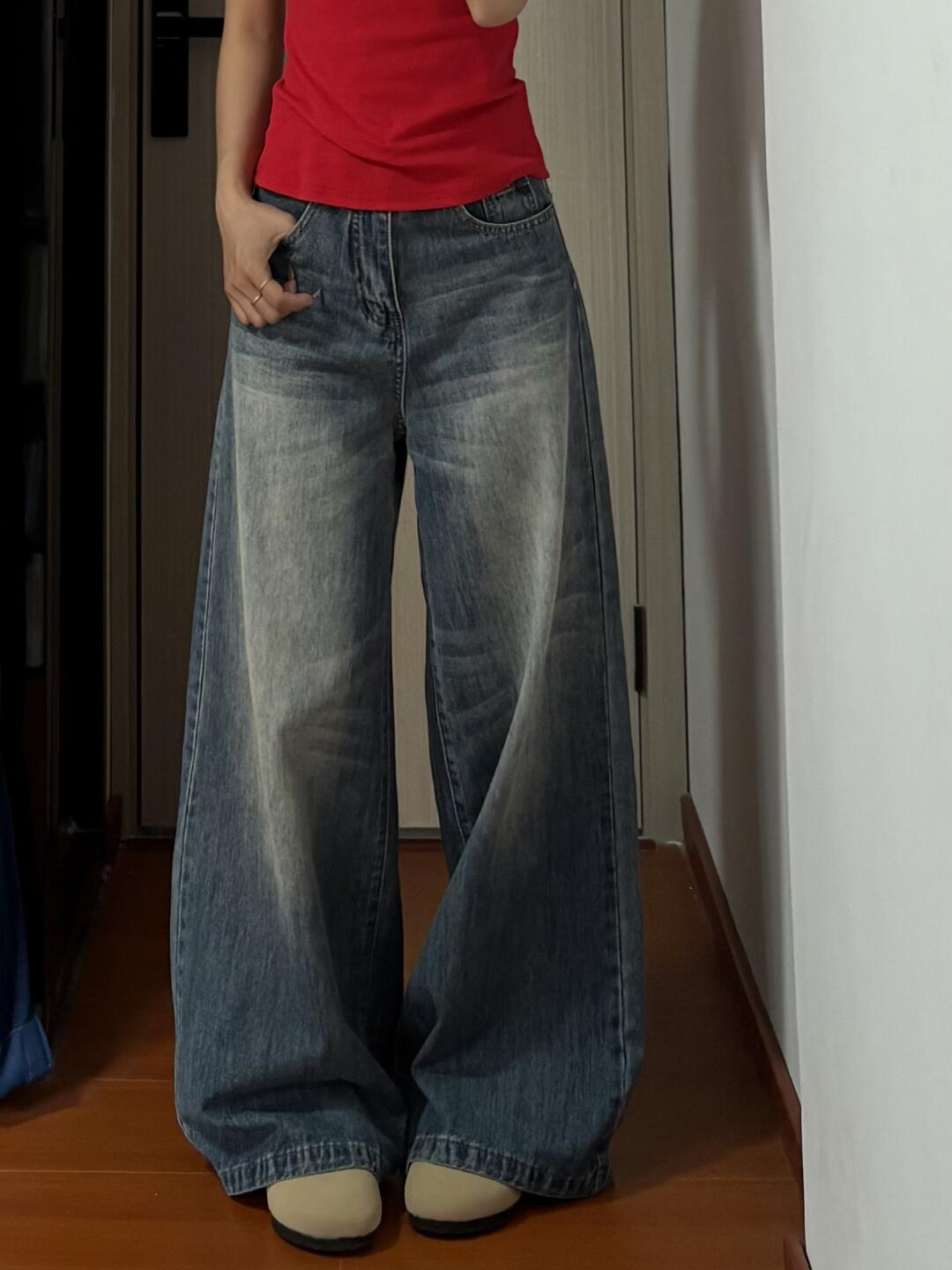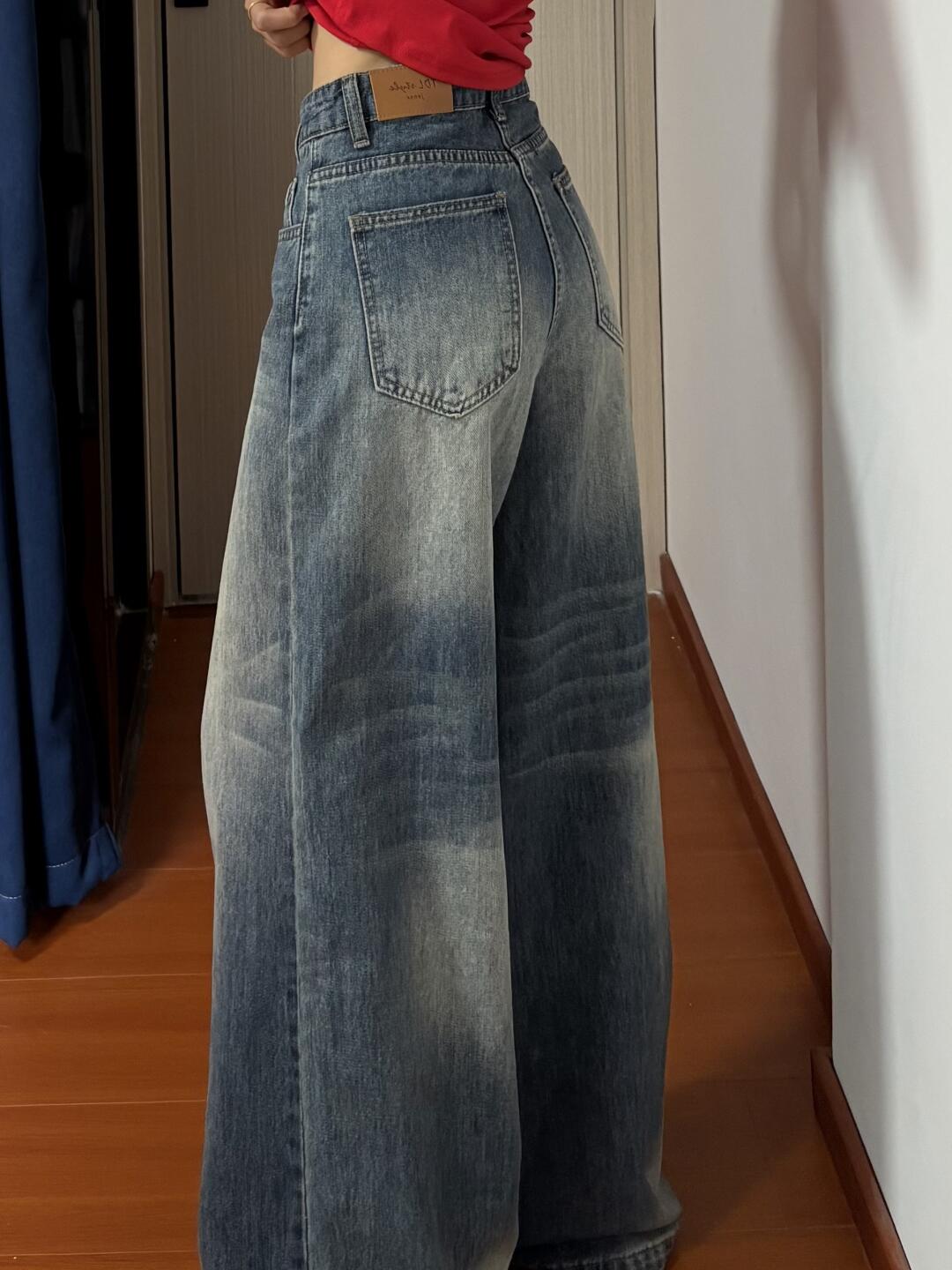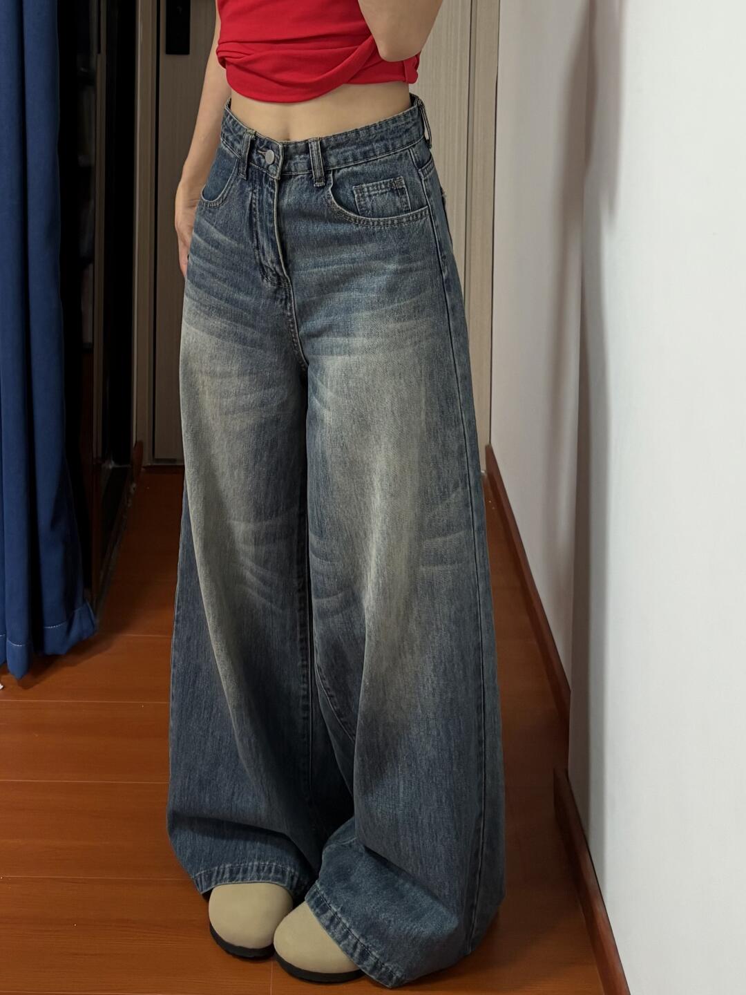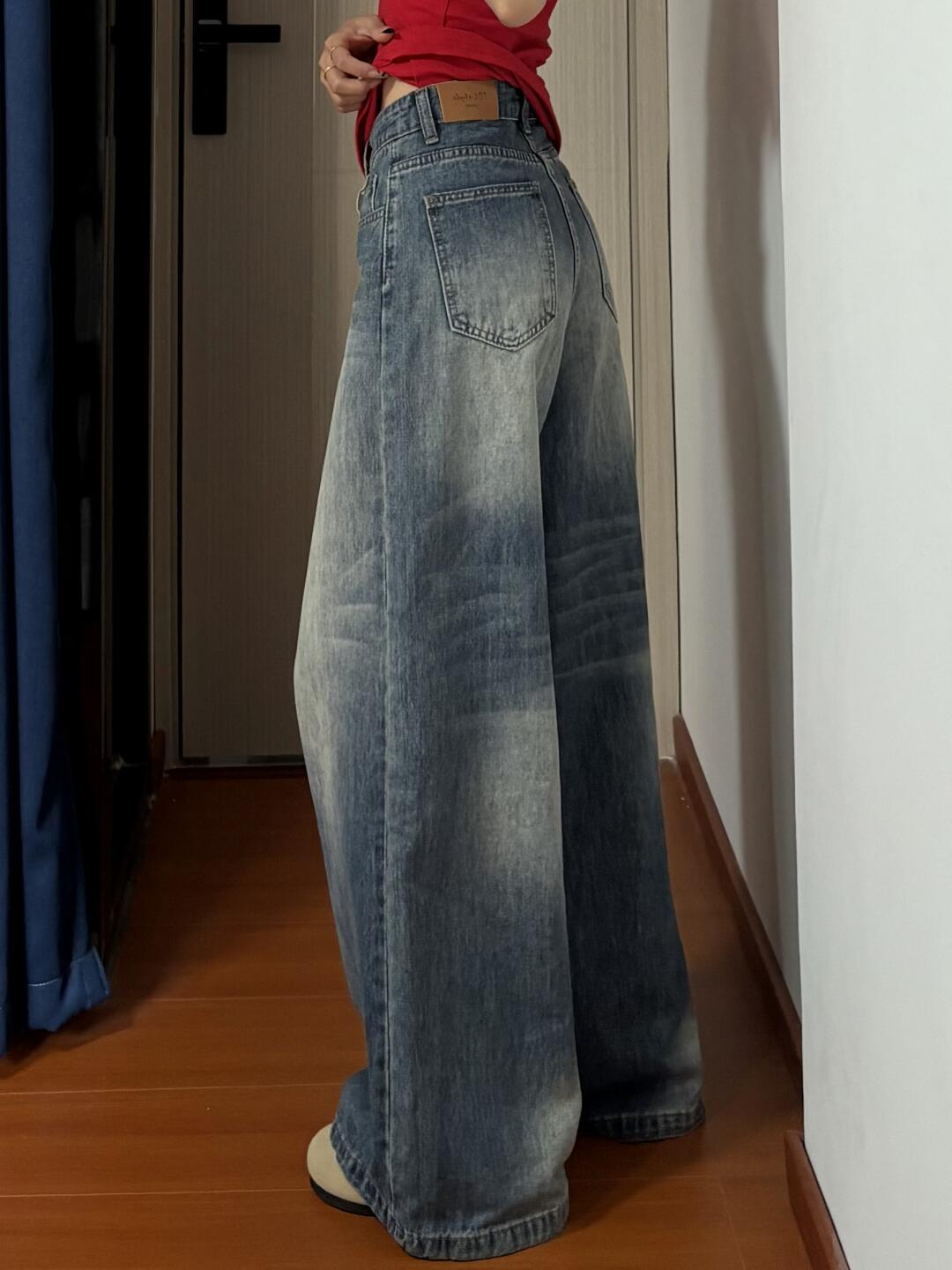 Washed and distressed A-version wide-leg jeans for women, new summer styles, retro high waist, loose and slim straight-leg floor-length pants