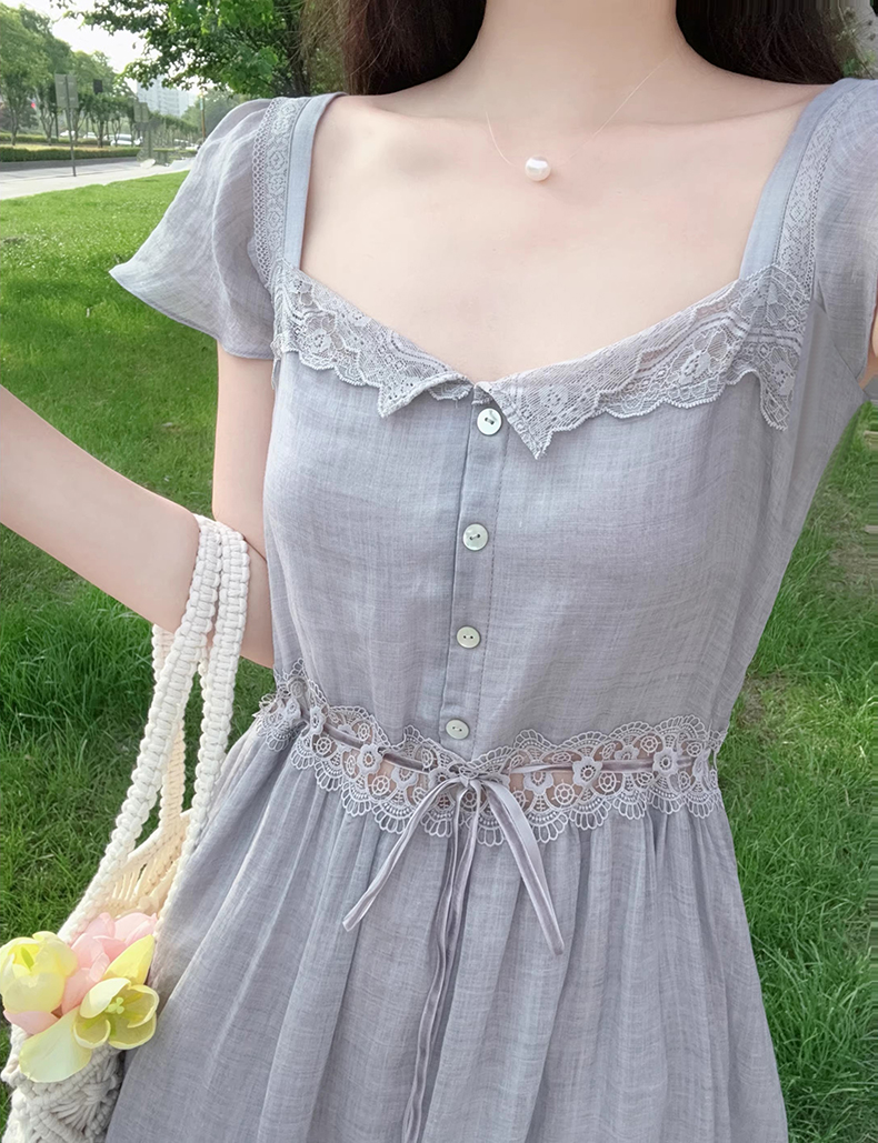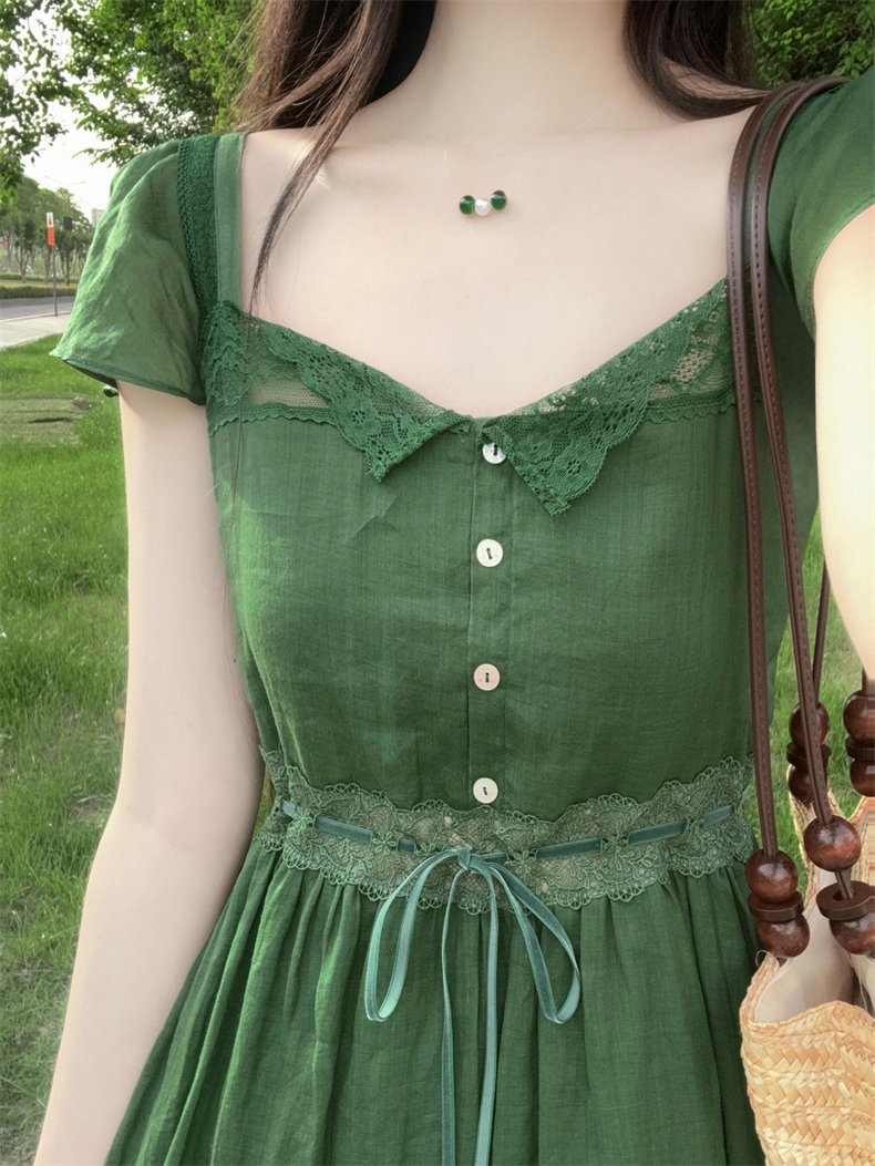 法式高级感绿色蕾丝拼接连衣裙子女夏季2025新款漂亮掐腰气质长裙