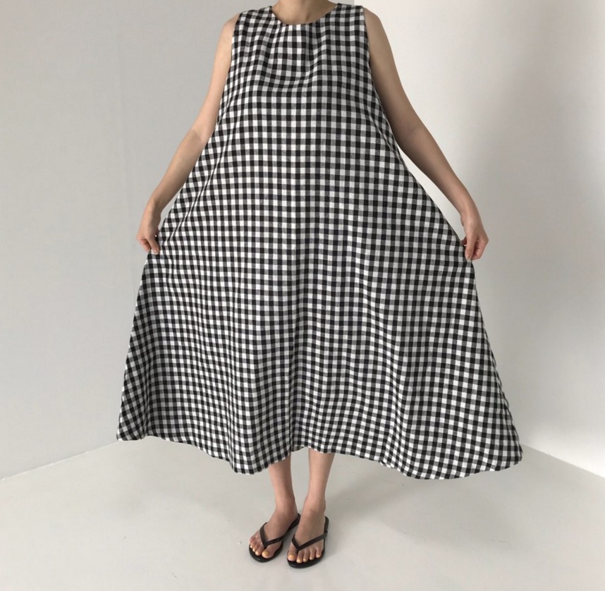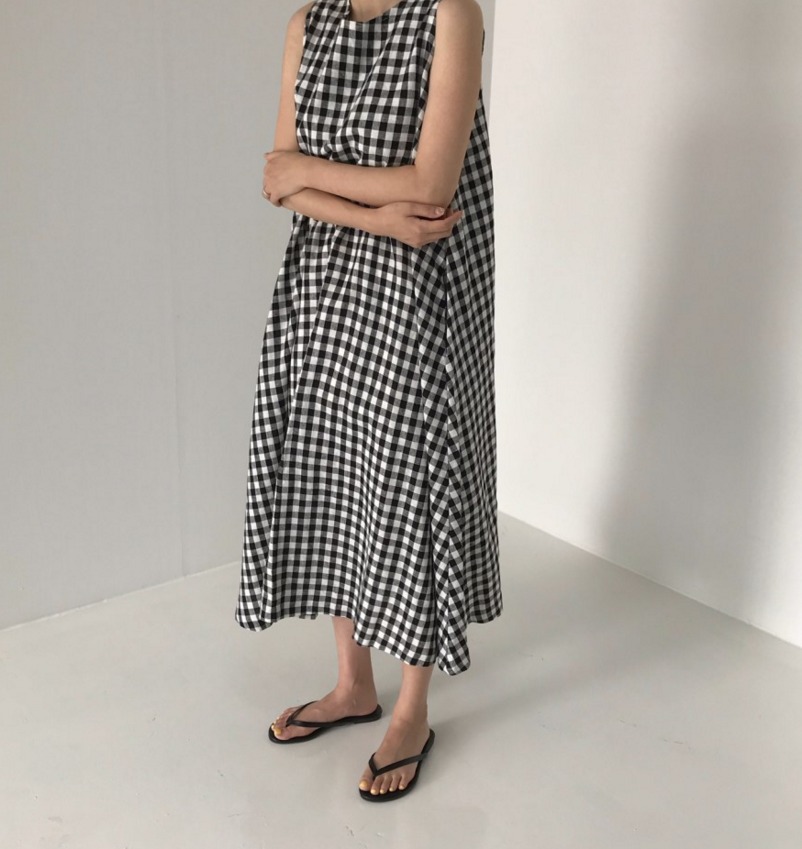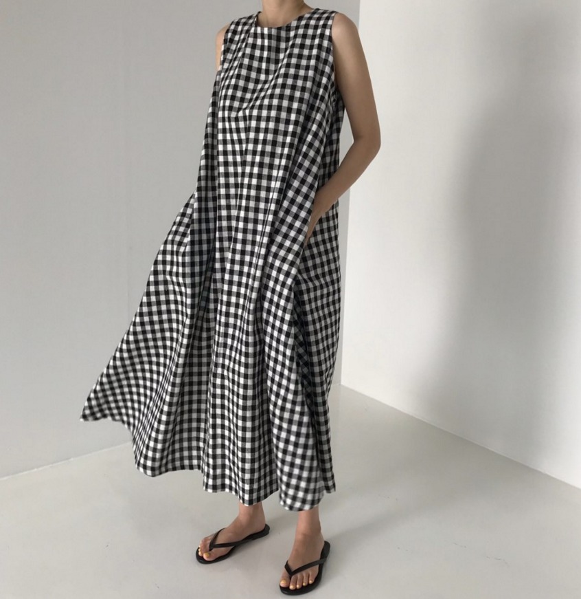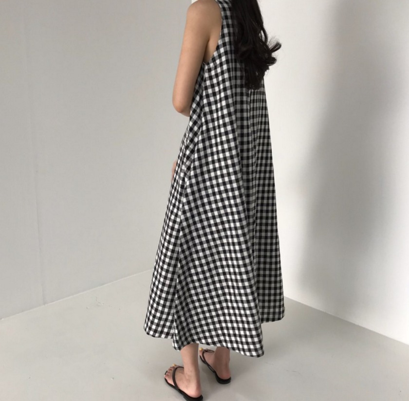 原版料 韩国chic 黑白格 背心 宽松 无袖 过膝 背心裙女