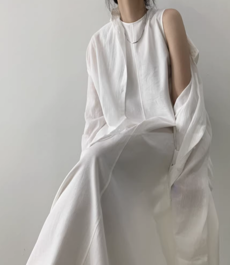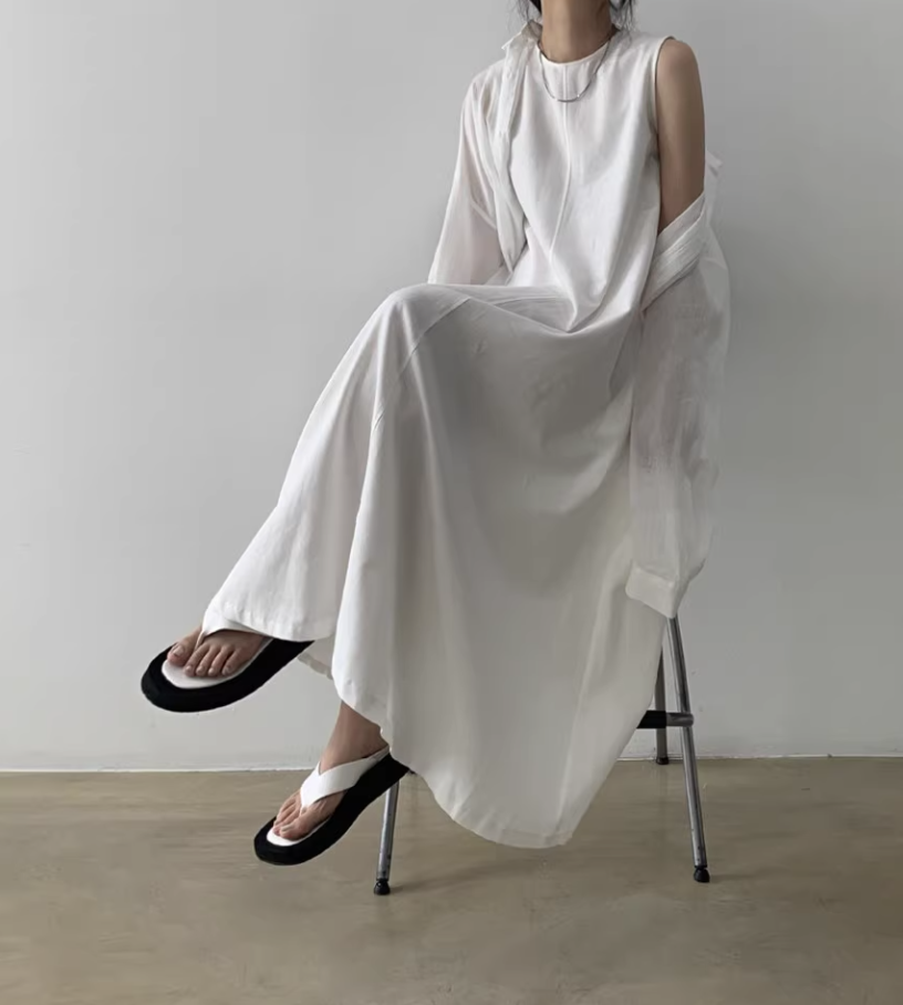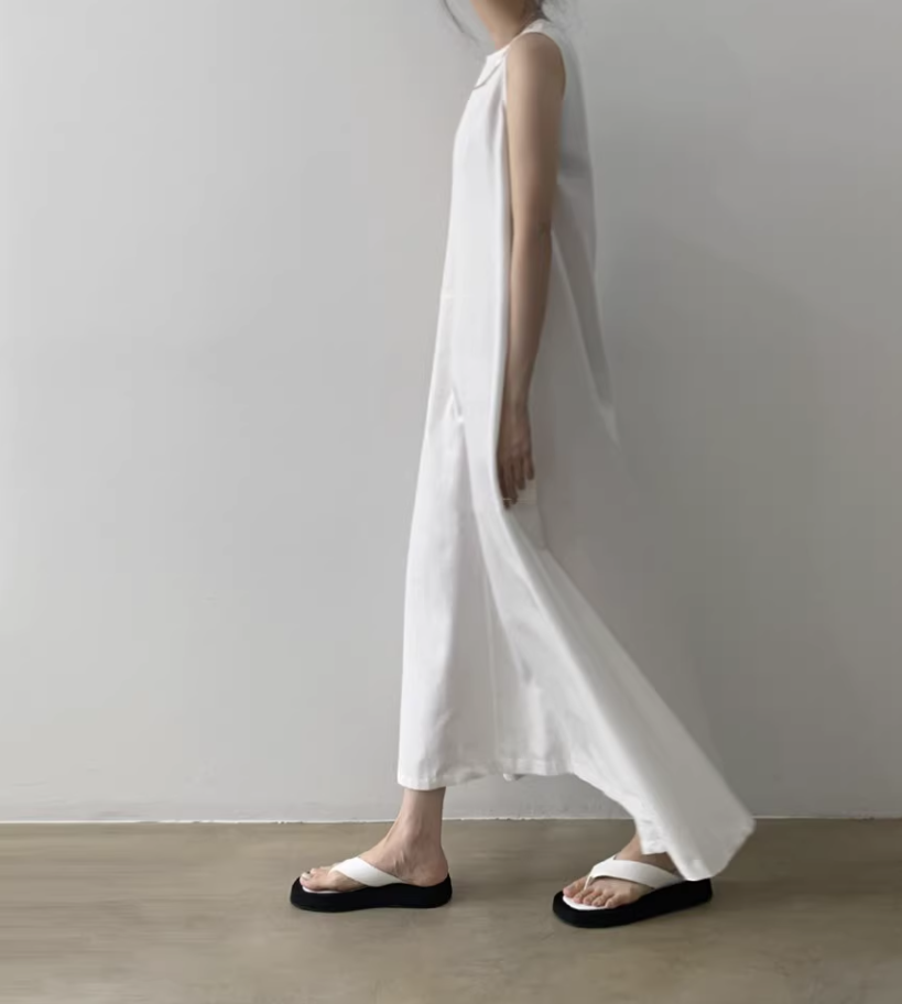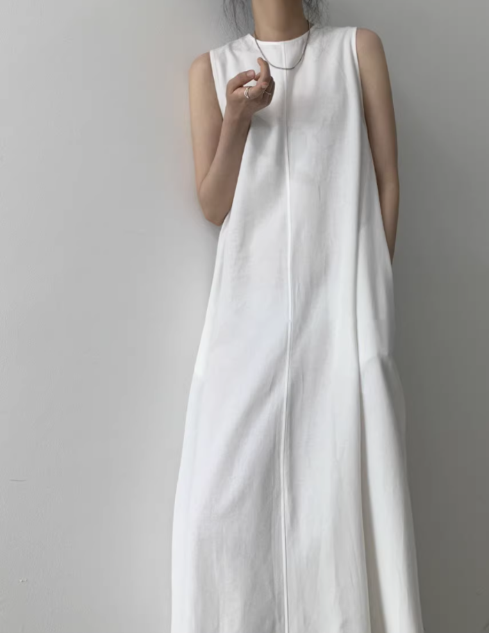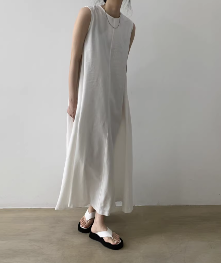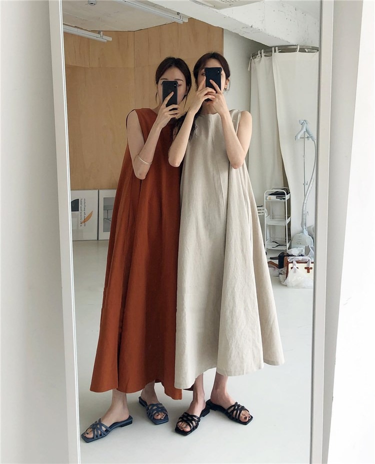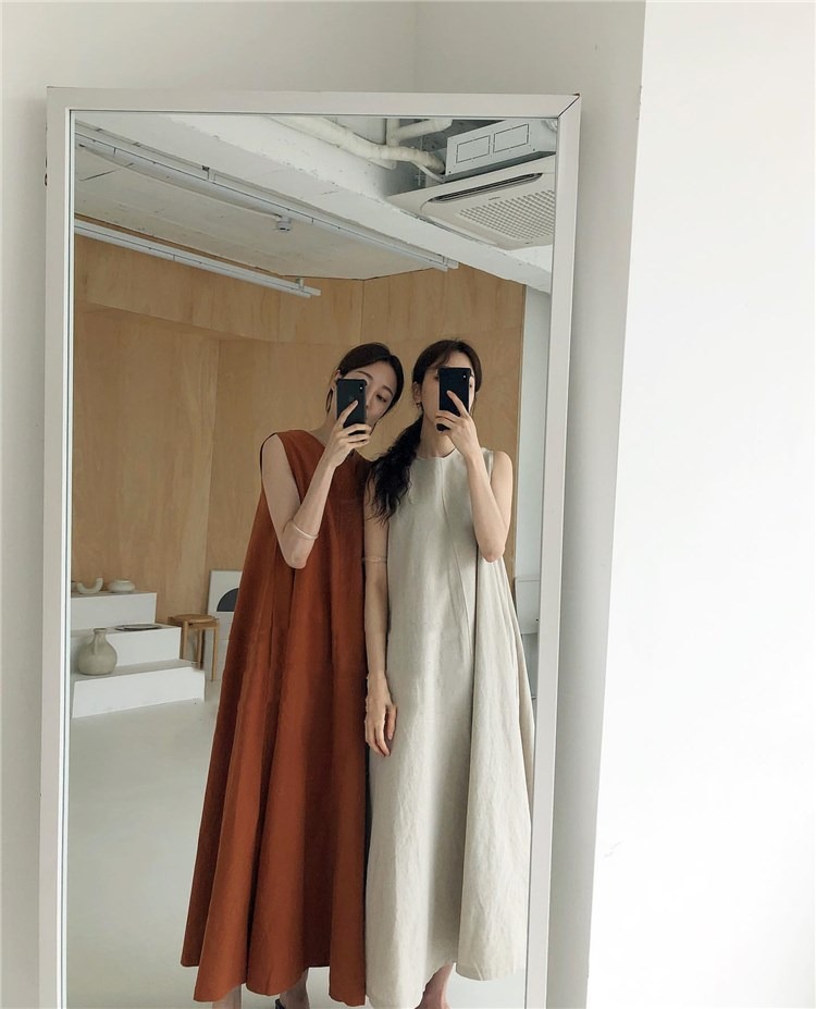 韩国 chic风 宽松 超大摆 无袖南瓜色 长款 棉麻连衣裙