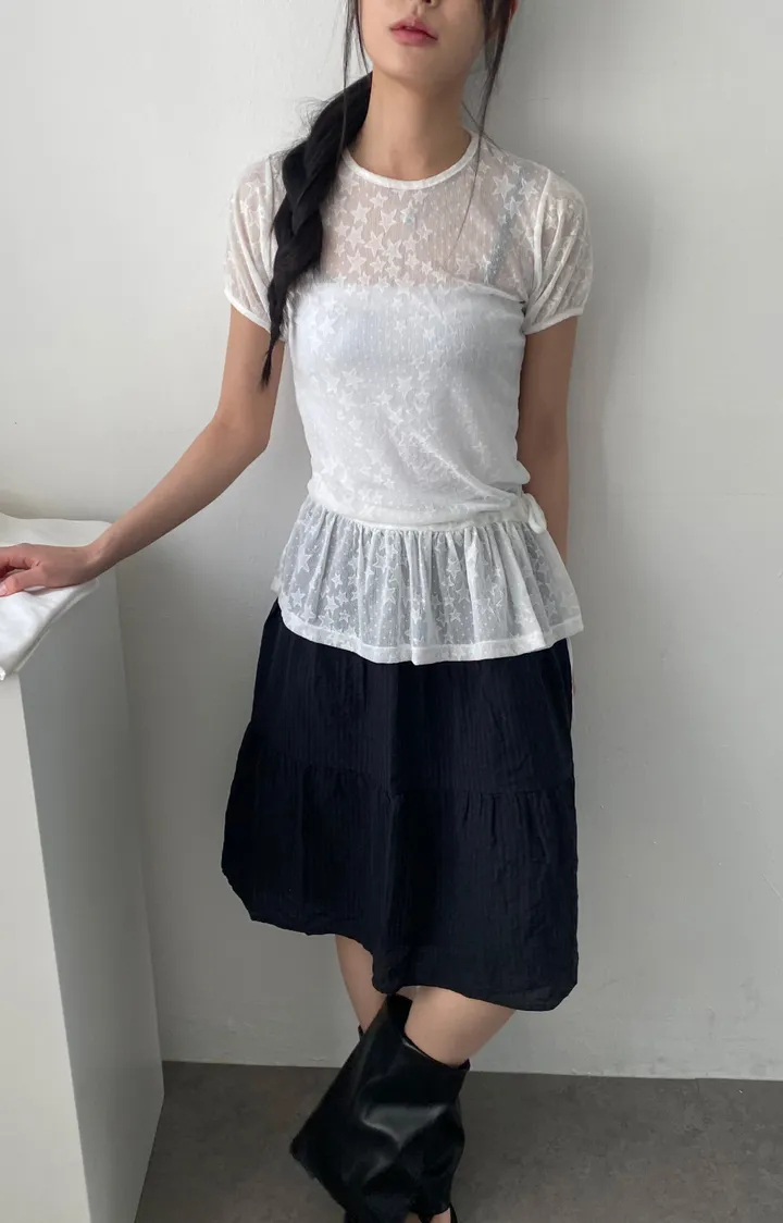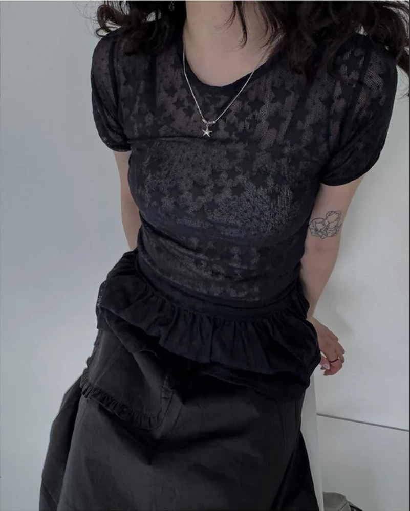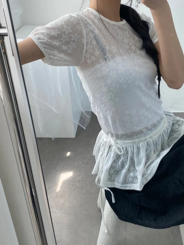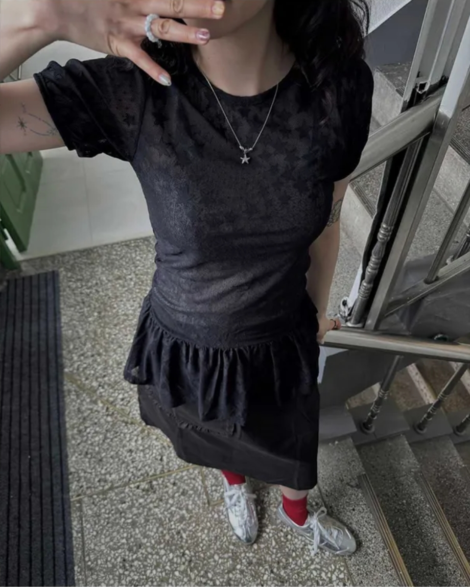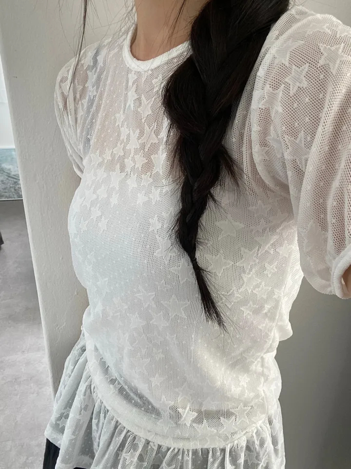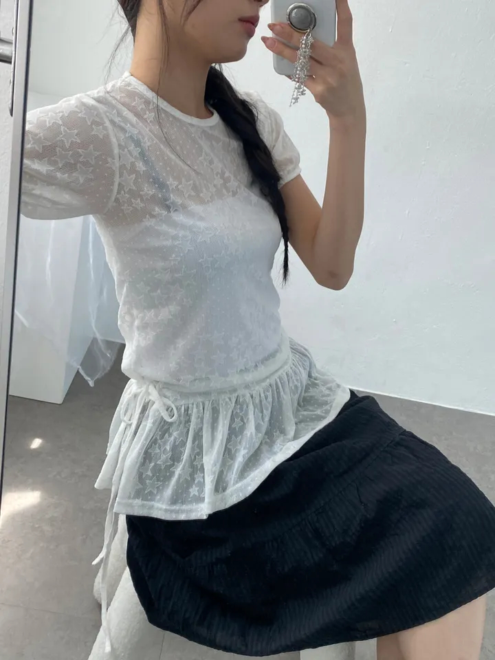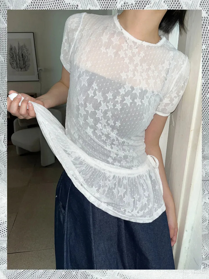 Summer Korean Japanese Y2K cute five-pointed star soft lace hollow short-sleeved drawstring skirt long top