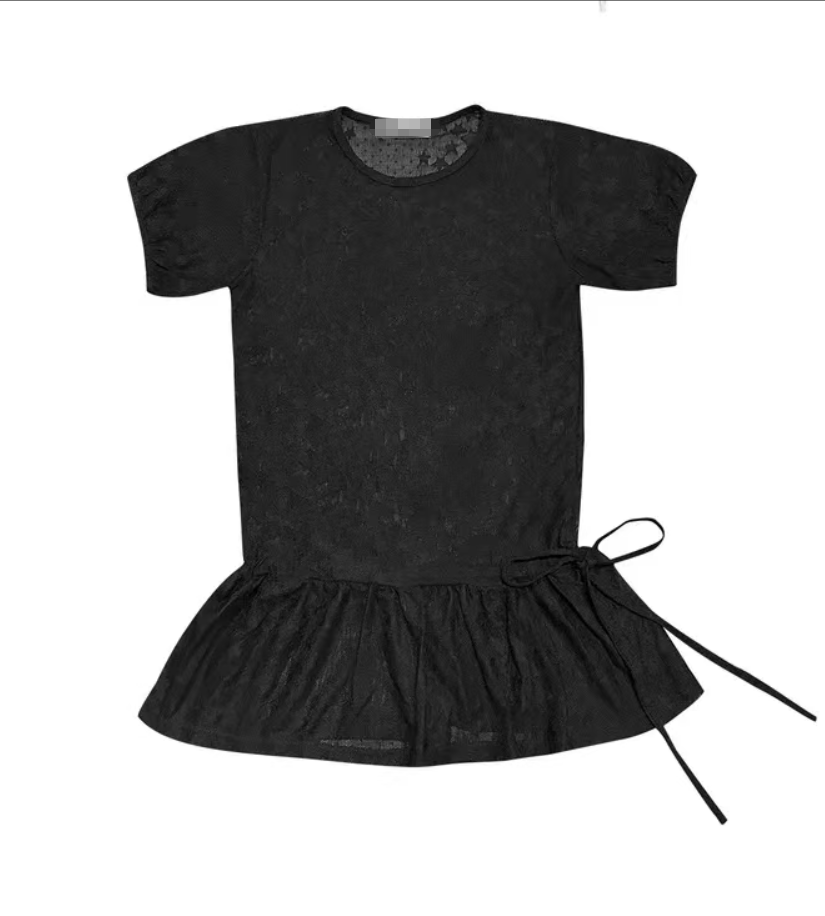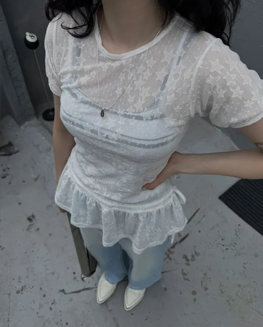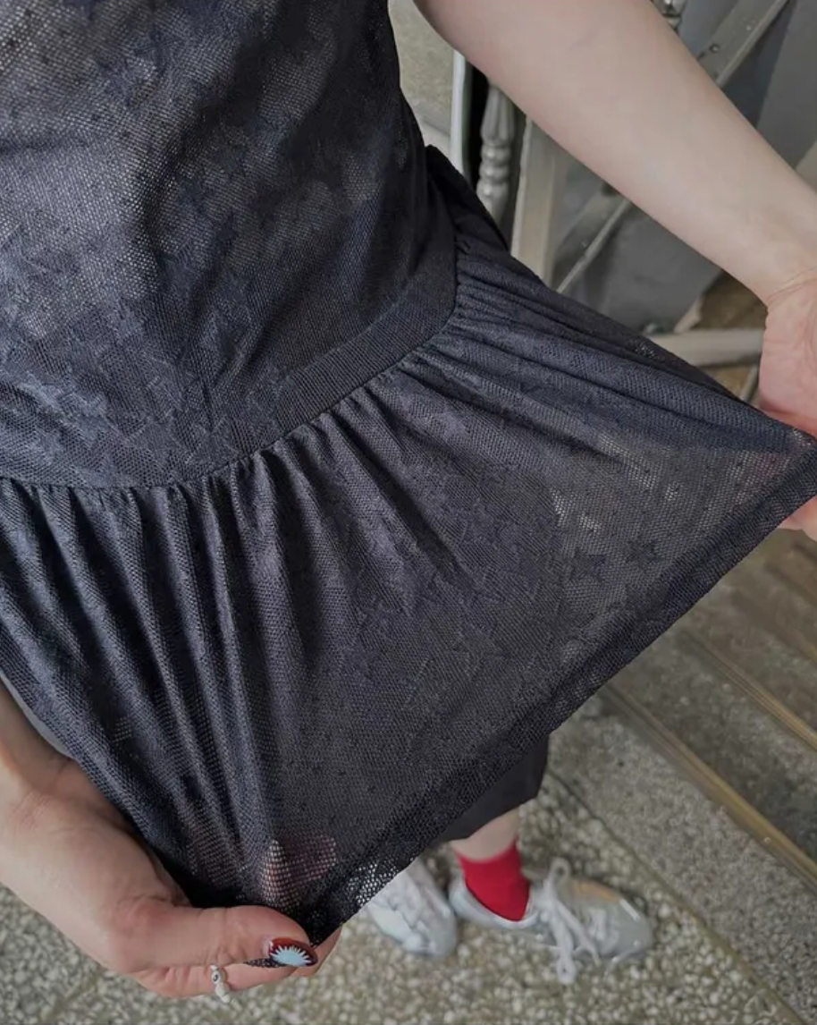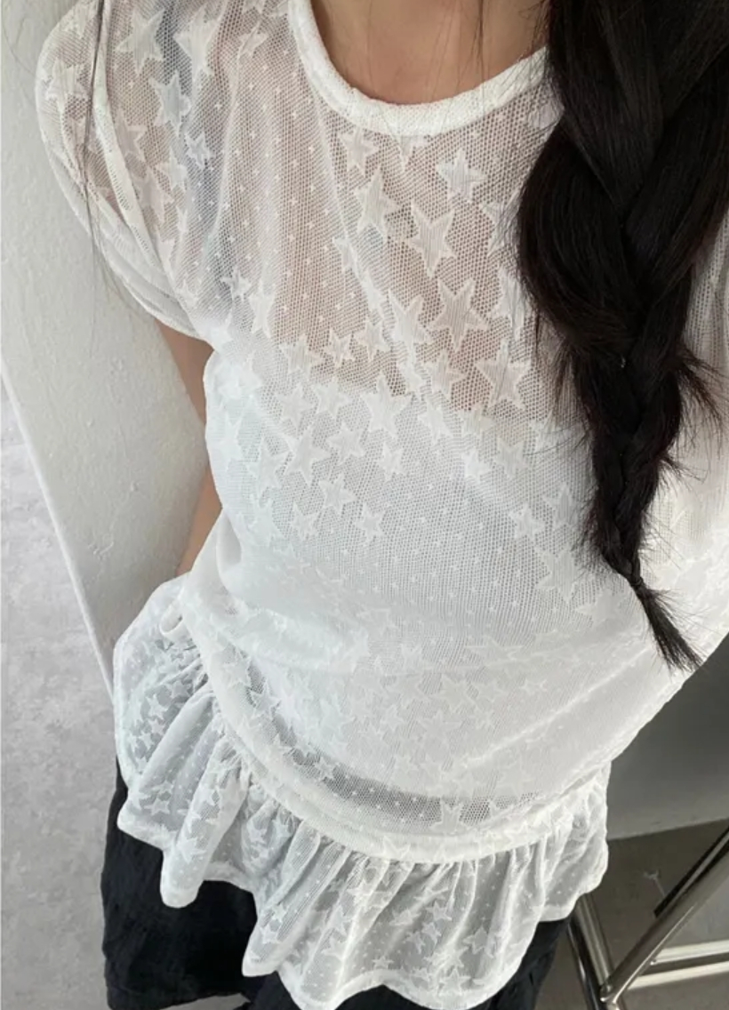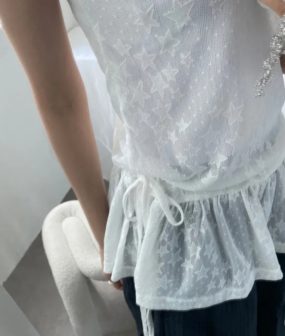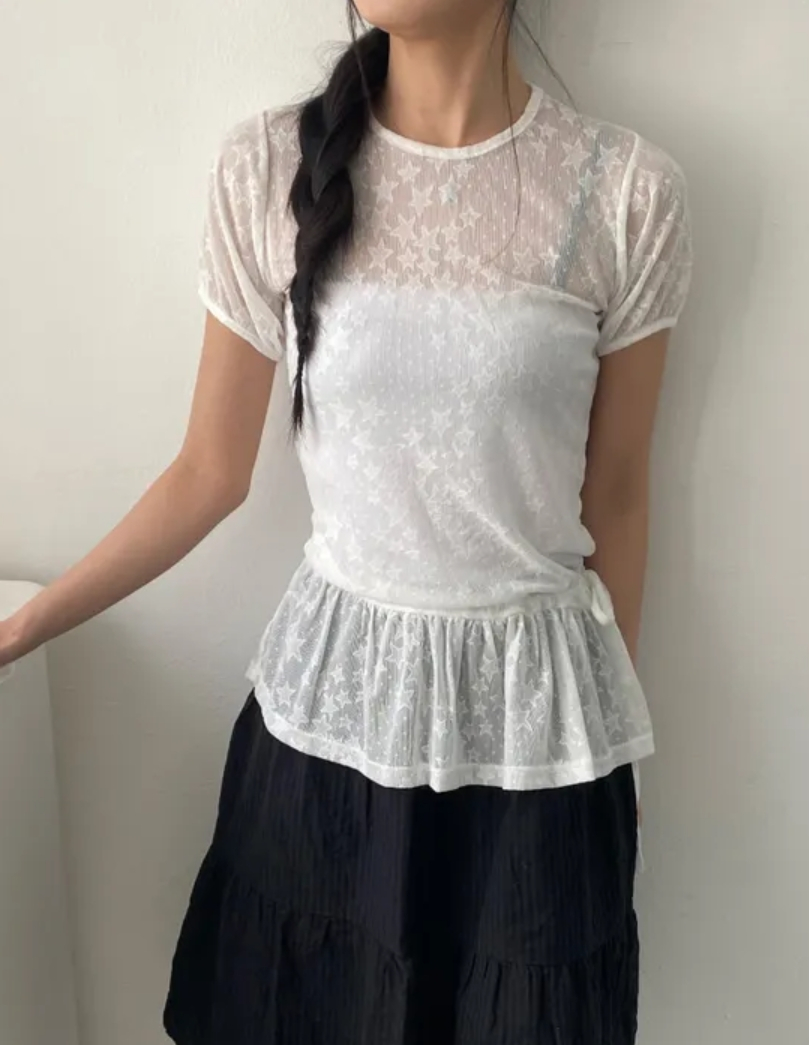 Summer Korean Japanese Y2K cute five-pointed star soft lace hollow short-sleeved drawstring skirt long top