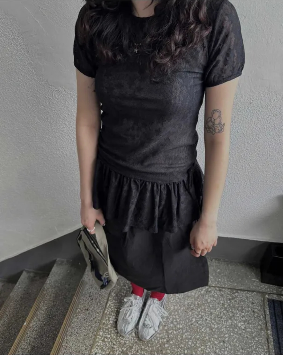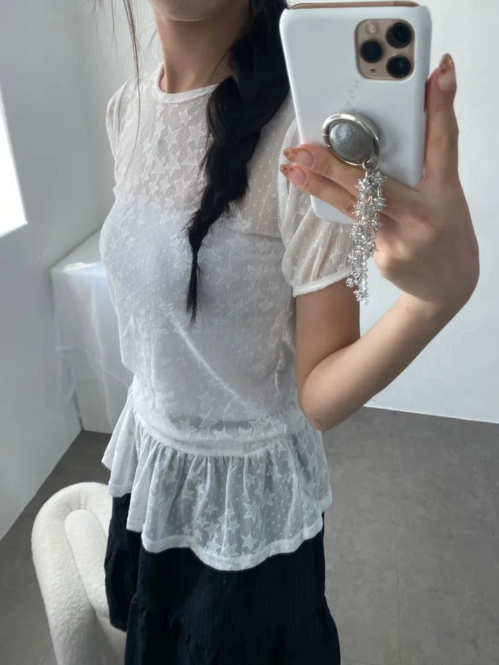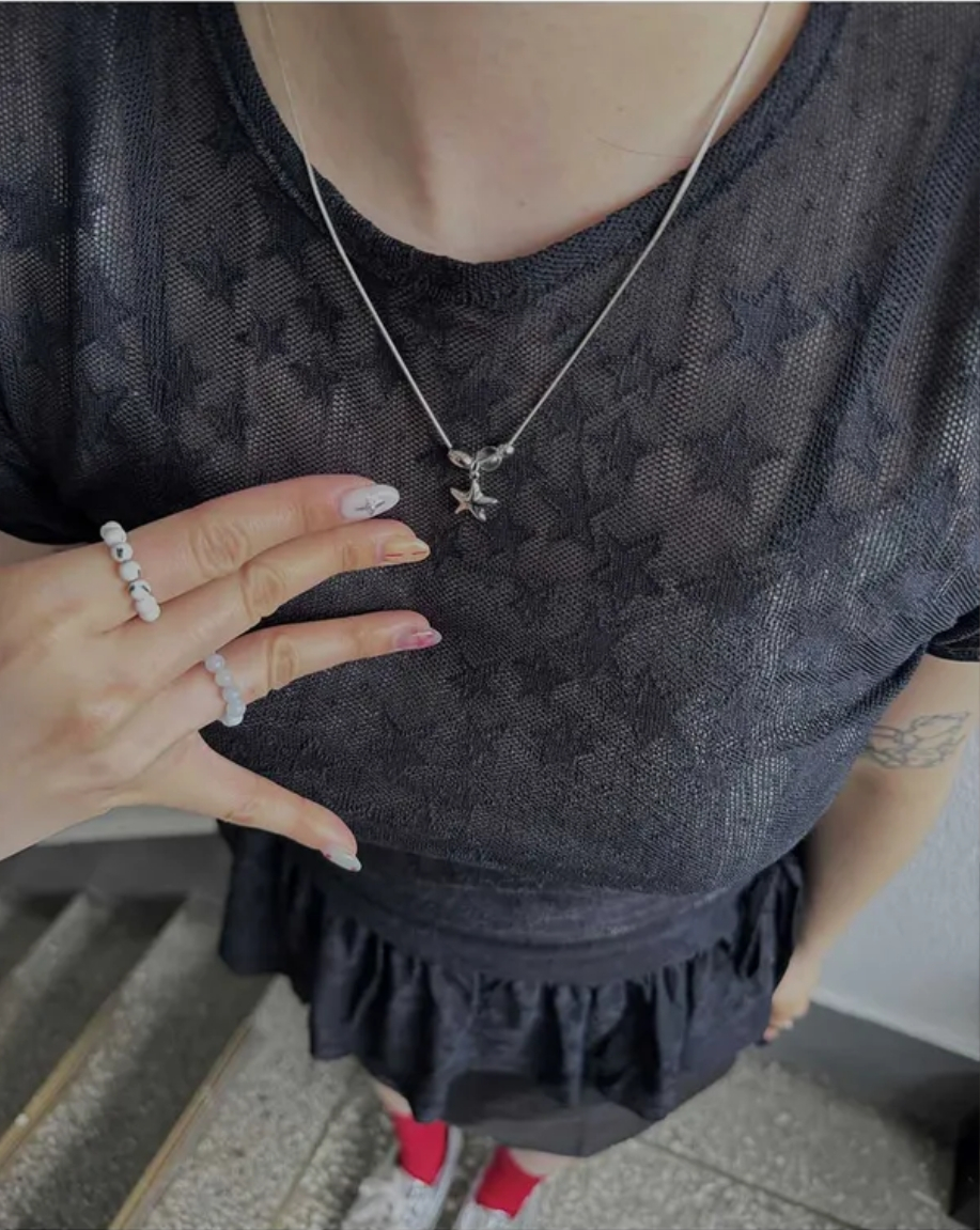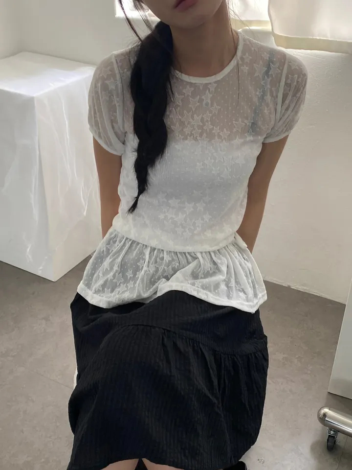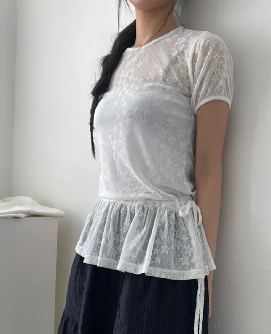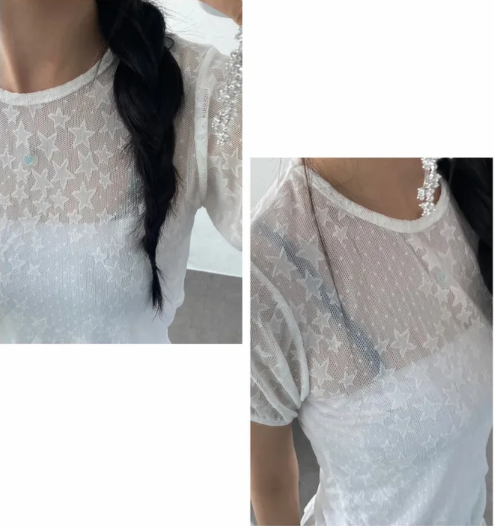 Summer Korean Japanese Y2K cute five-pointed star soft lace hollow short-sleeved drawstring skirt long top