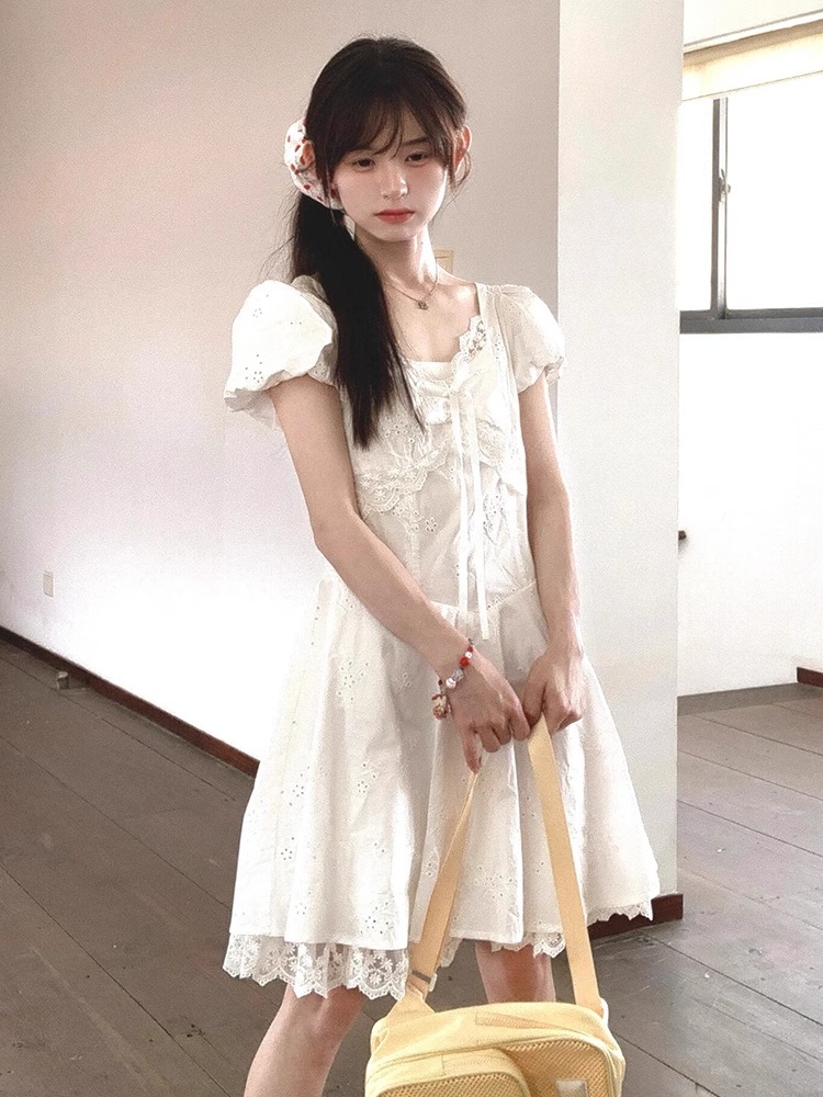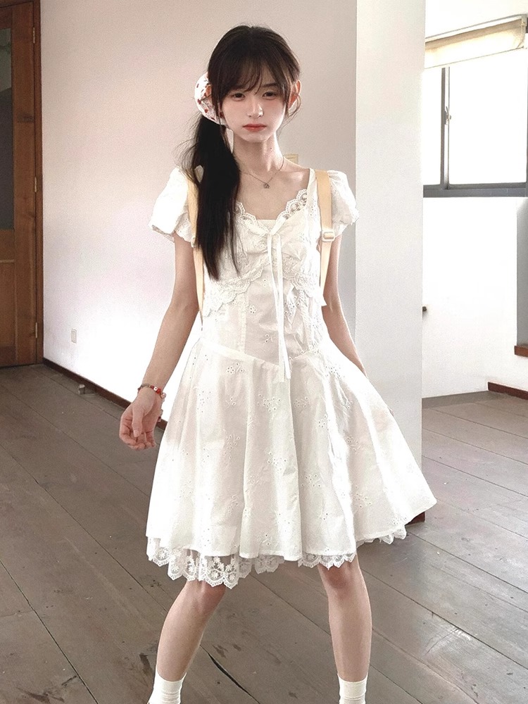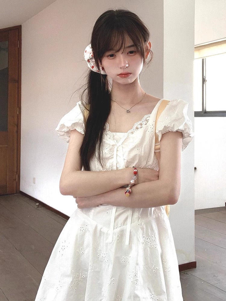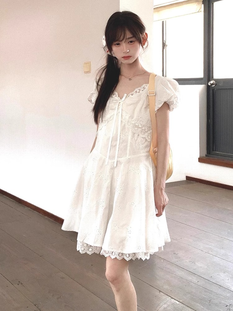 umoumo wu mushroom original ntot summer sweet gentle slim lace splicing hollow embroidery short white skirt