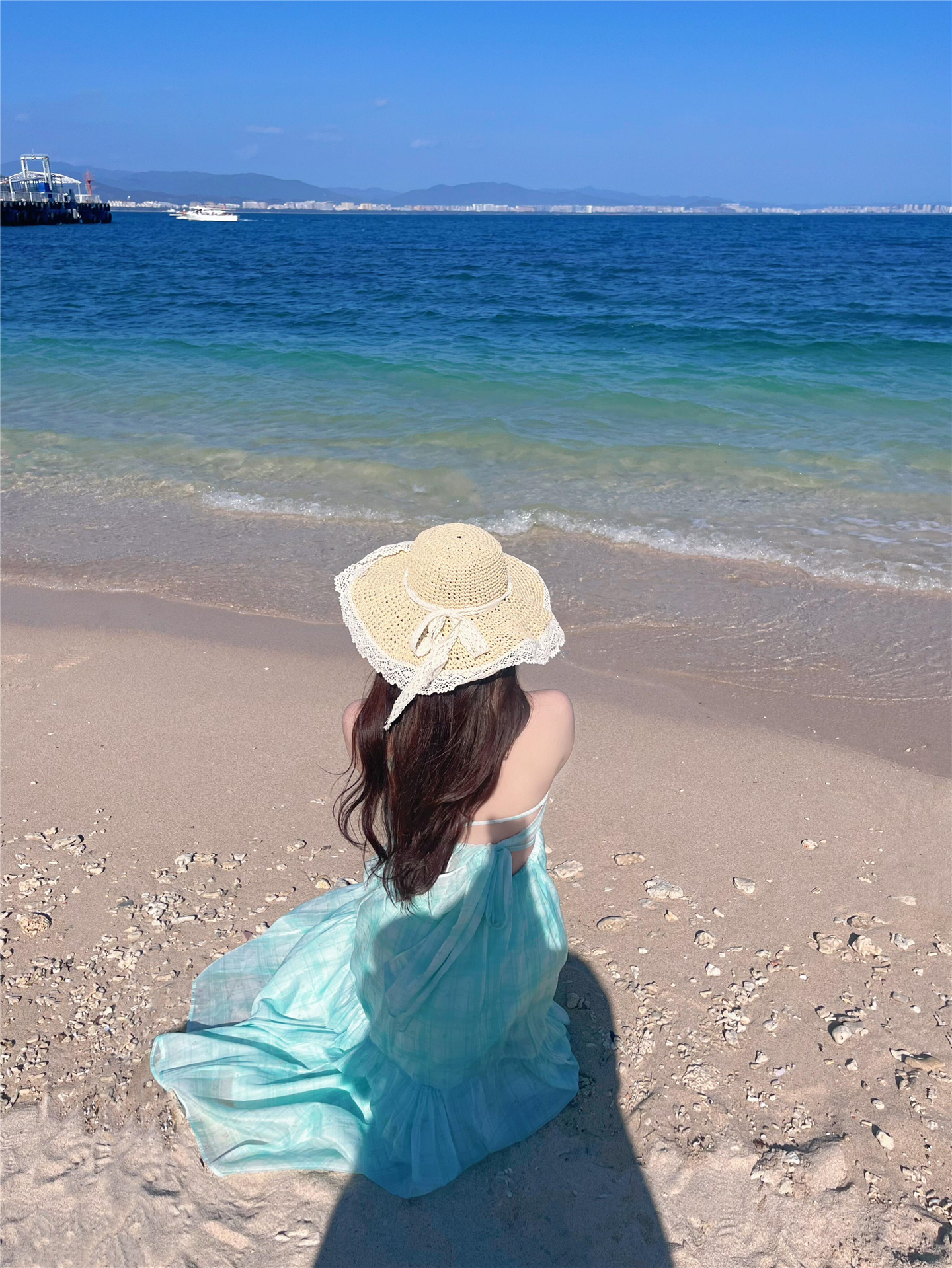 蓝色V领挂脖吊带连衣裙女2025夏新款海边度假小众设计收腰a字长裙