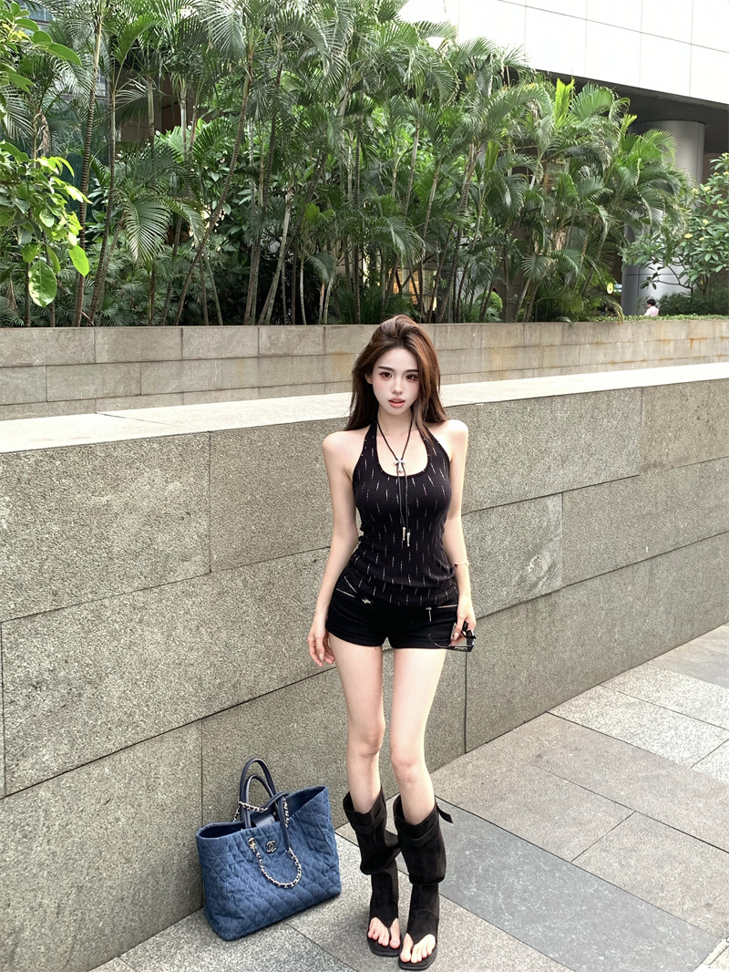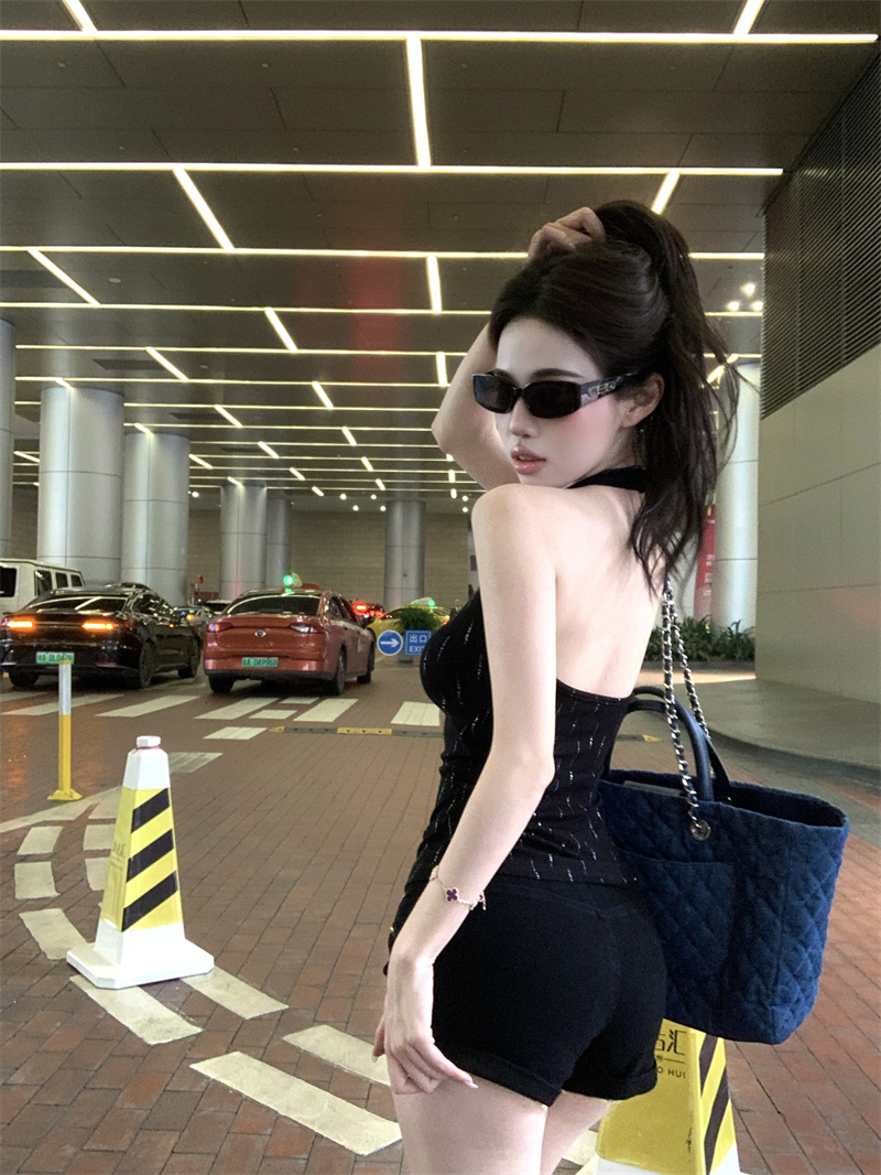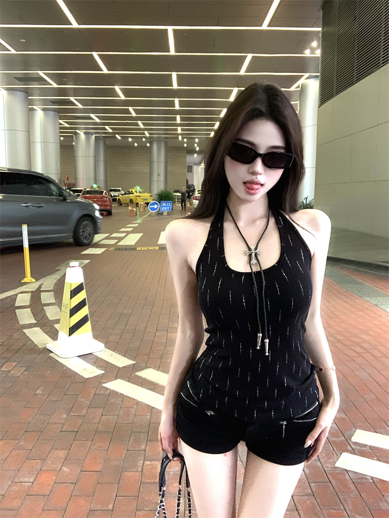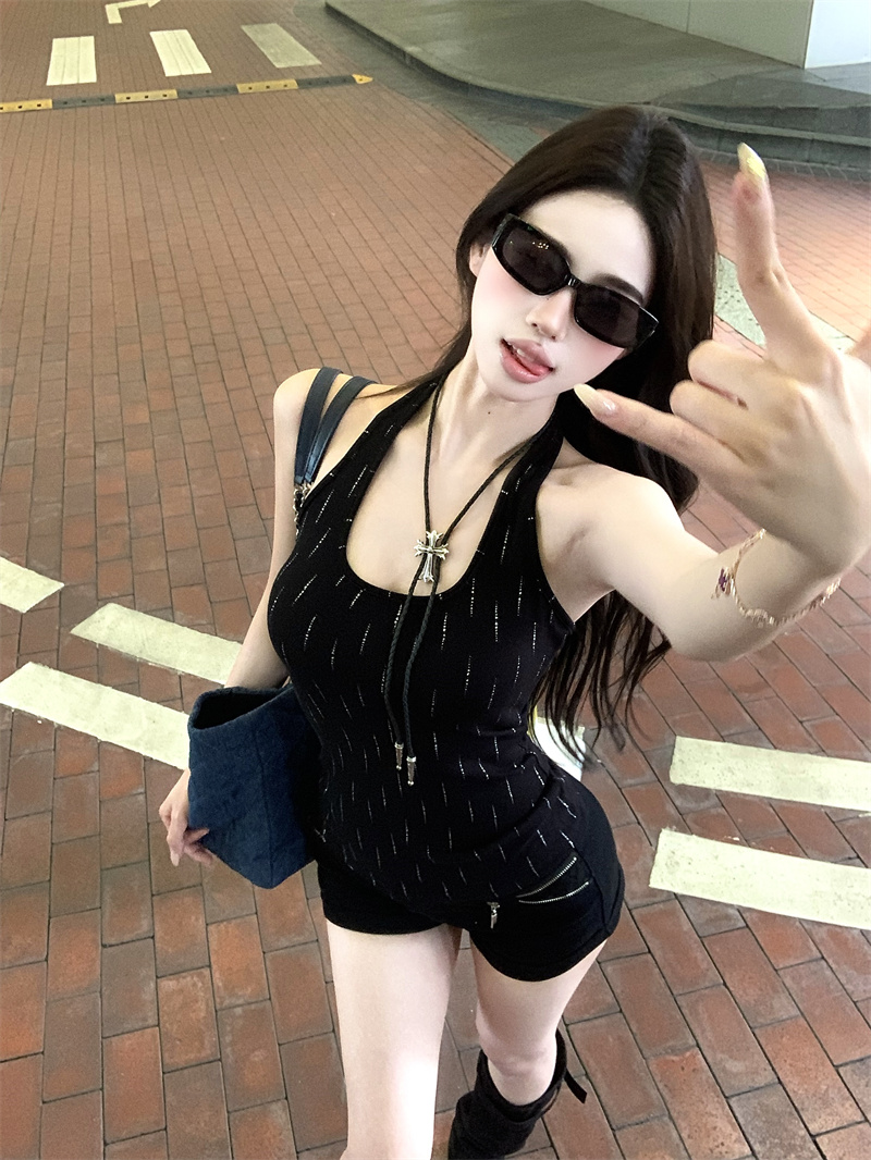 辣妹风重工烫钻黑色挂脖背心夏季修身显瘦百搭性感上衣