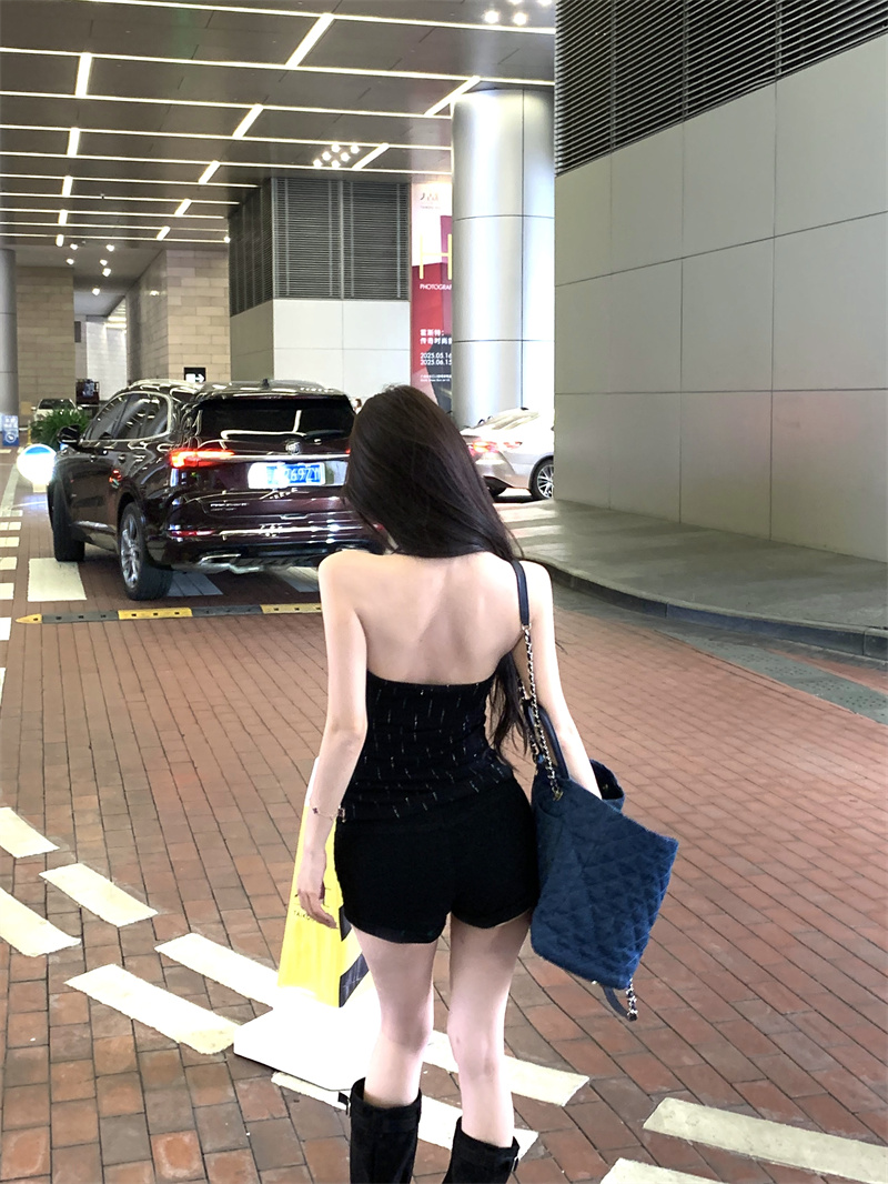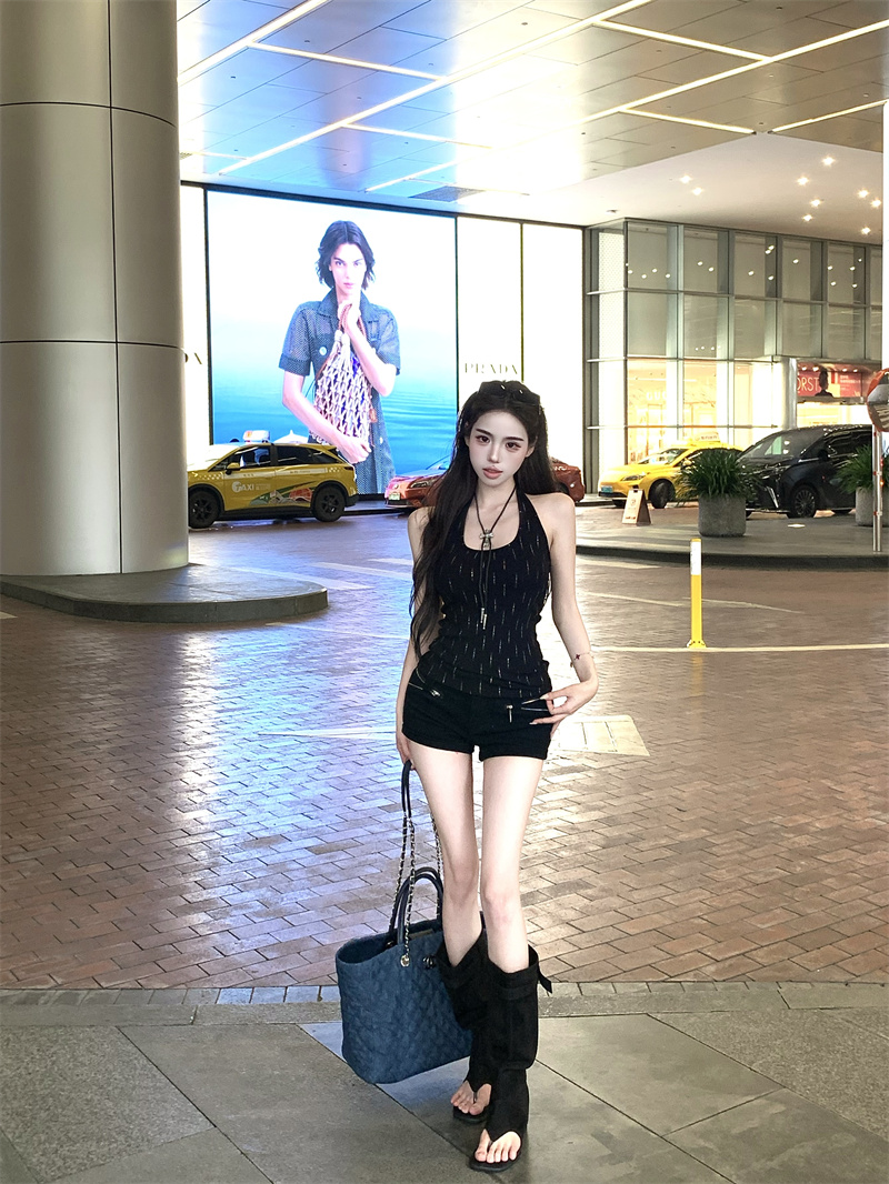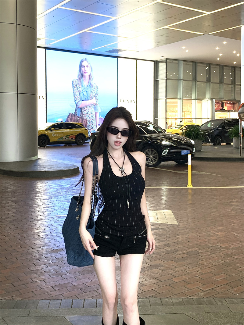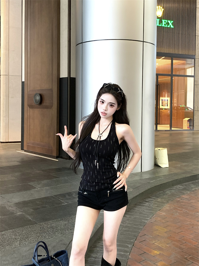 辣妹风重工烫钻黑色挂脖背心夏季修身显瘦百搭性感上衣