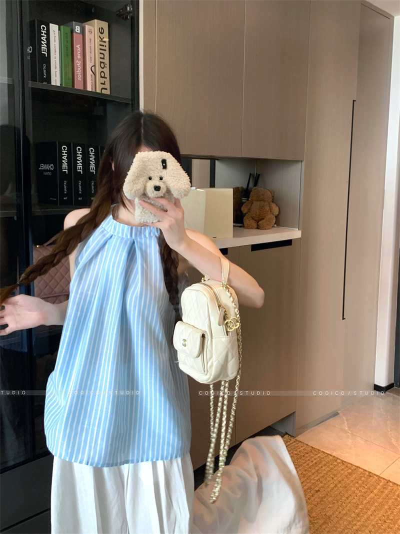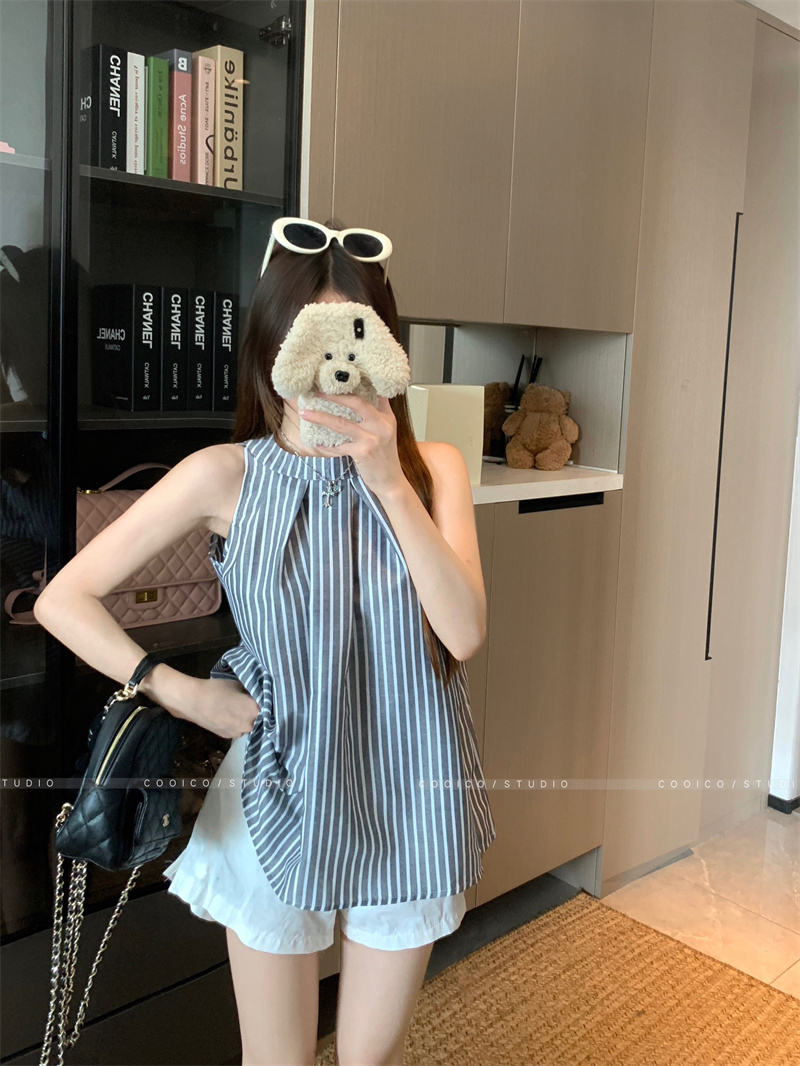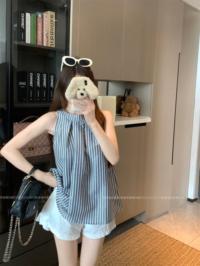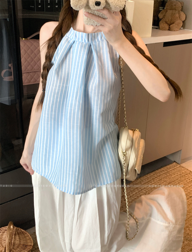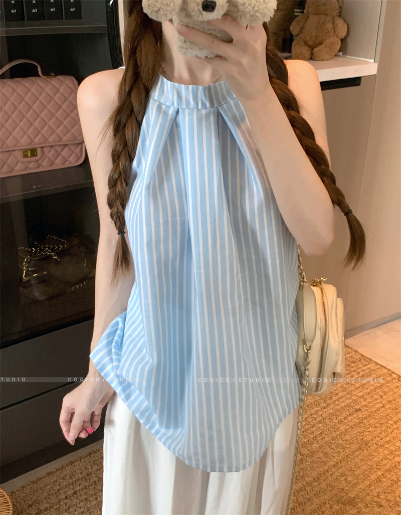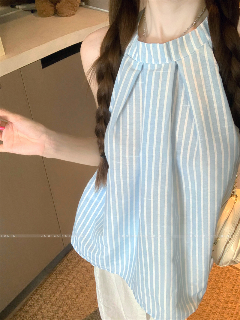 法式蓝色条纹无袖挂脖衬衫女夏季2025新款设计感小众宽松衬衣上衣