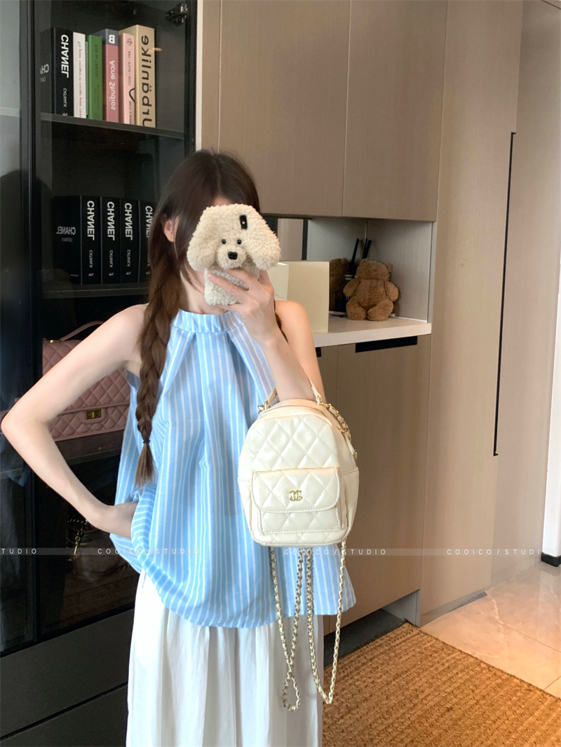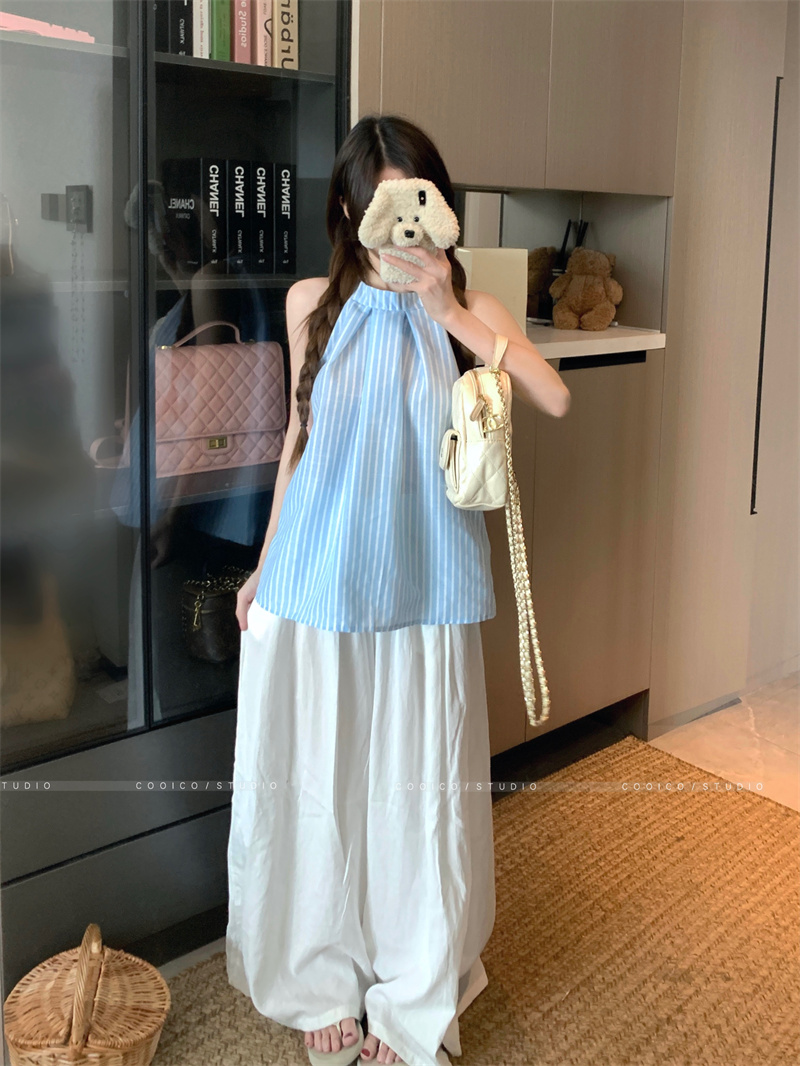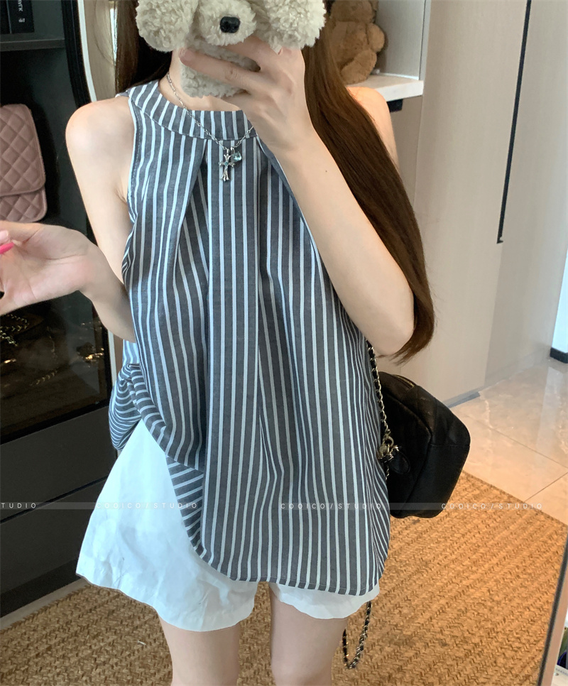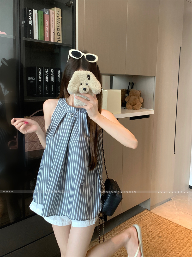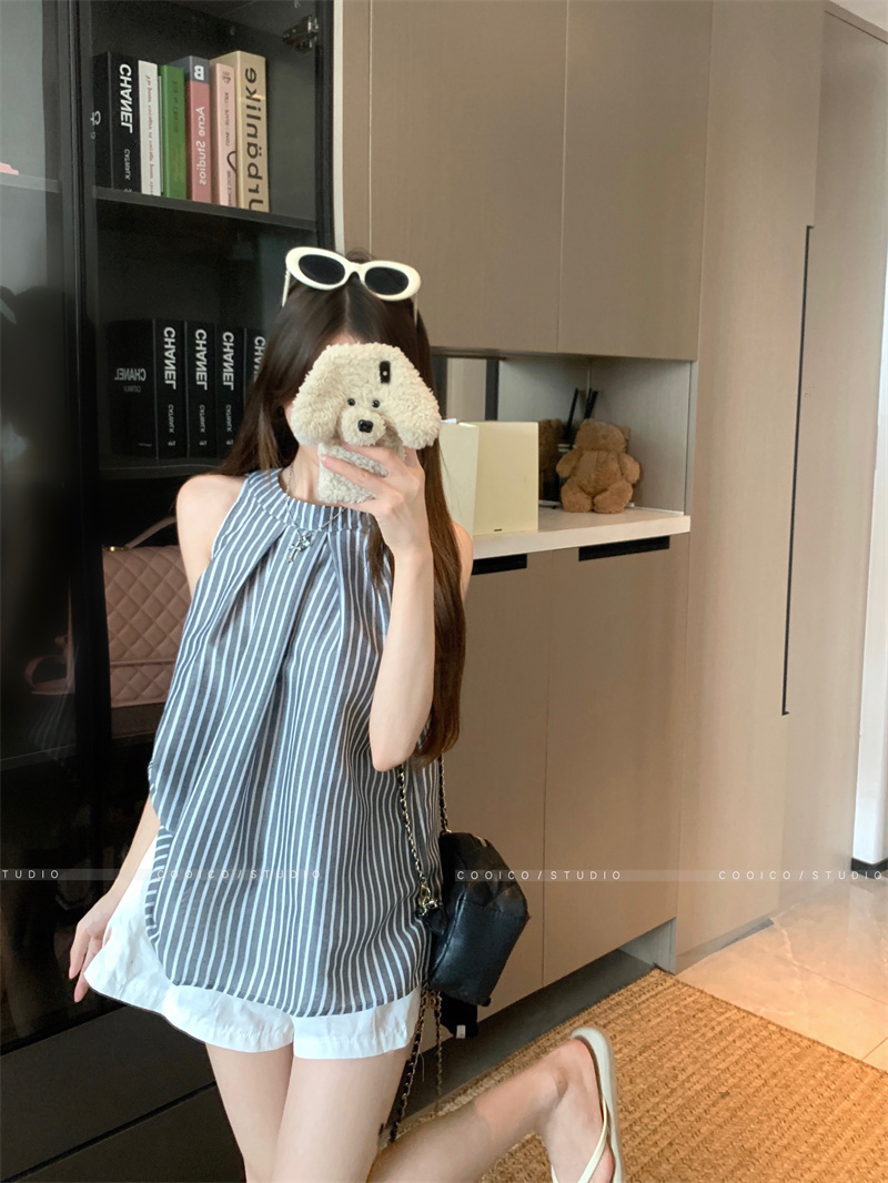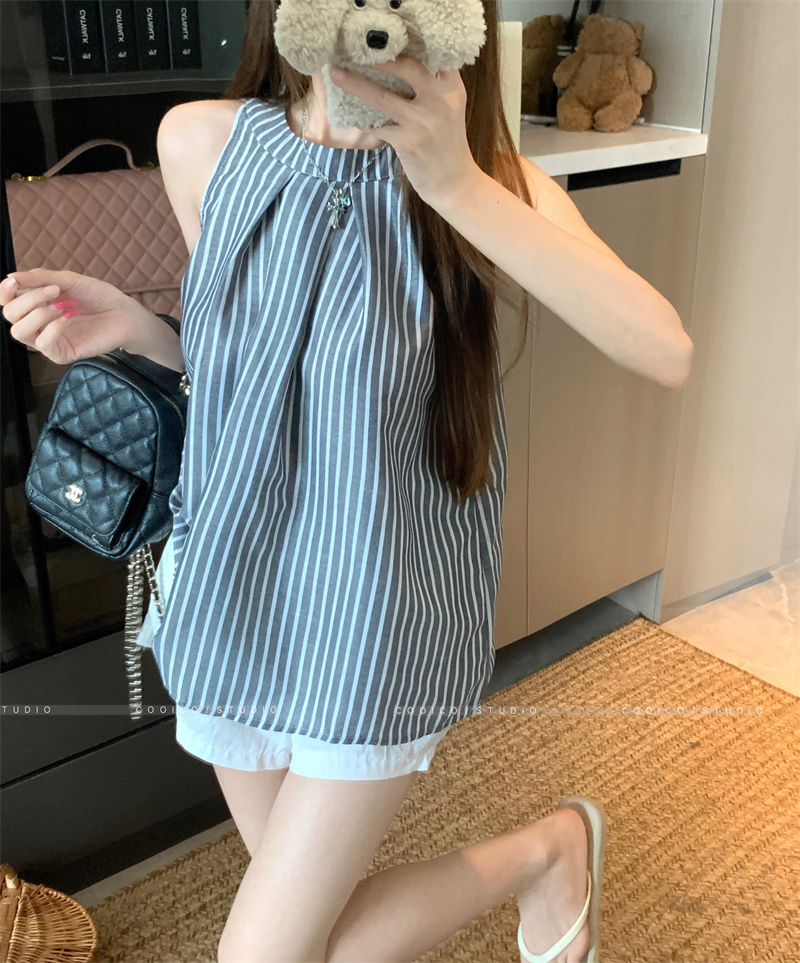 法式蓝色条纹无袖挂脖衬衫女夏季2025新款设计感小众宽松衬衣上衣