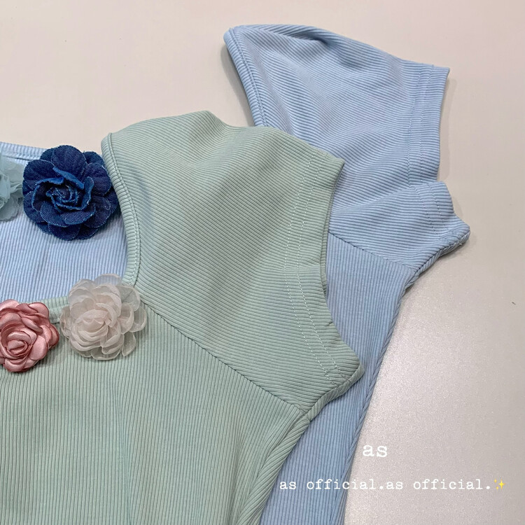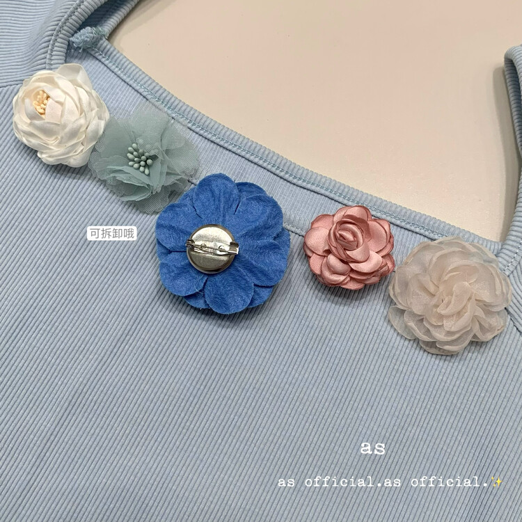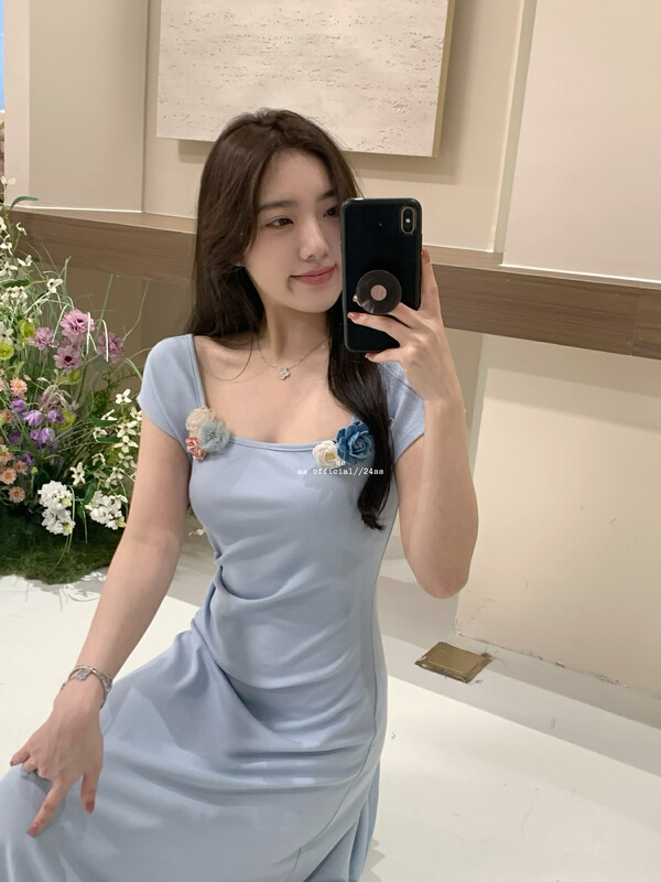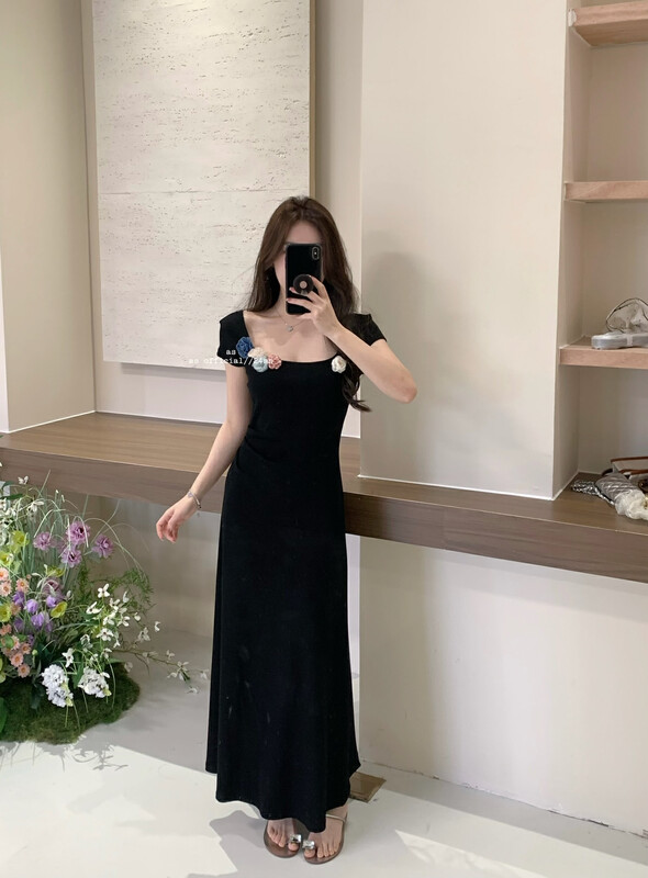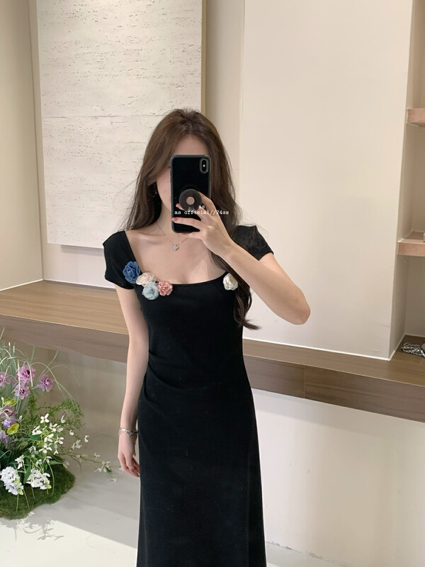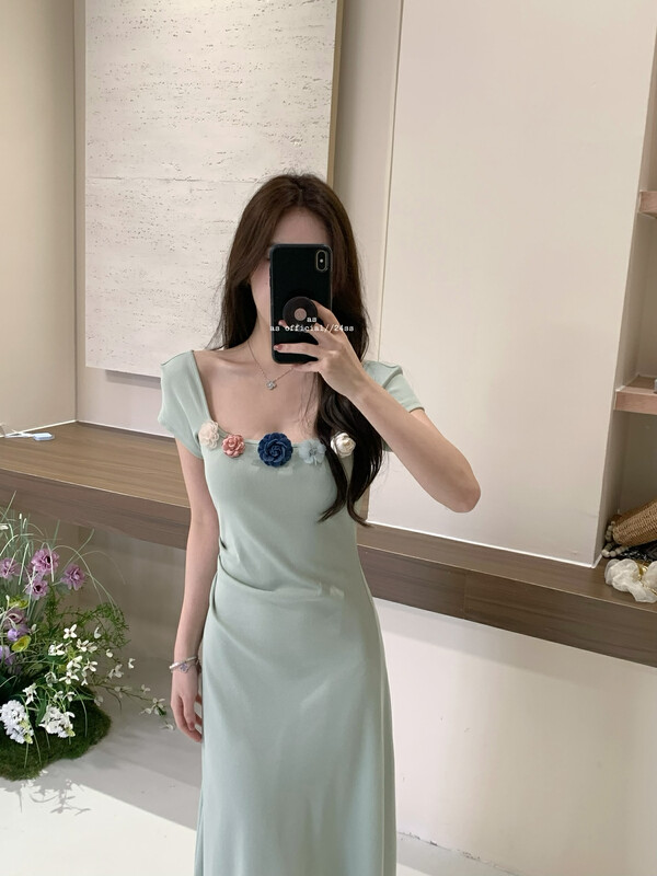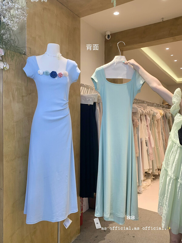 法式蓝色立体花朵高级感方领连衣裙女夏季小众设计褶皱修身掐腰裙