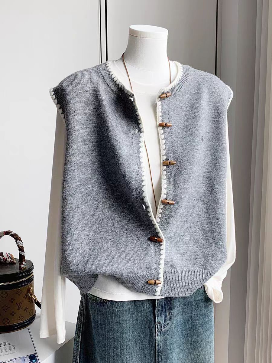 女士文艺纯色开衫毛线马甲秋冬宽松叠背心穿圆领牛角木扣针织马夹
