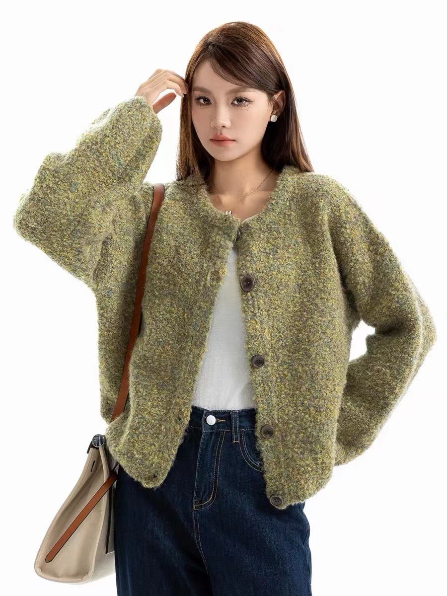 原创显瘦宽松慵懒风圆领针织短款毛衣开衫上衣外套潮女款