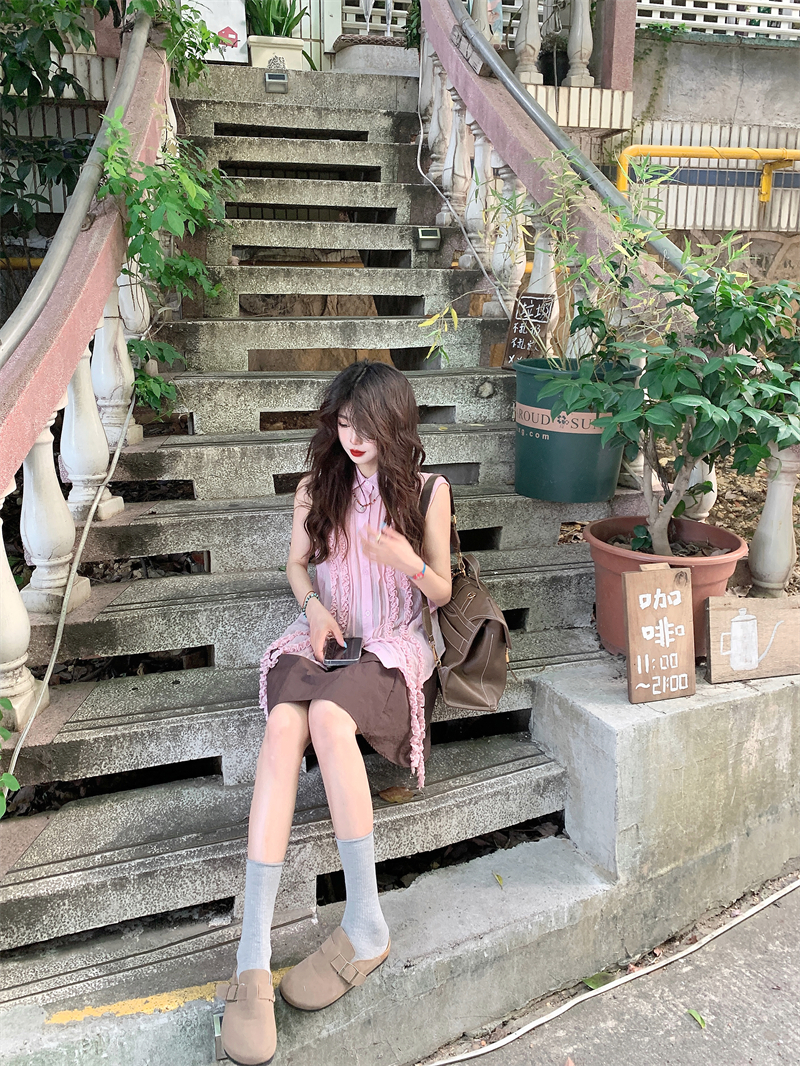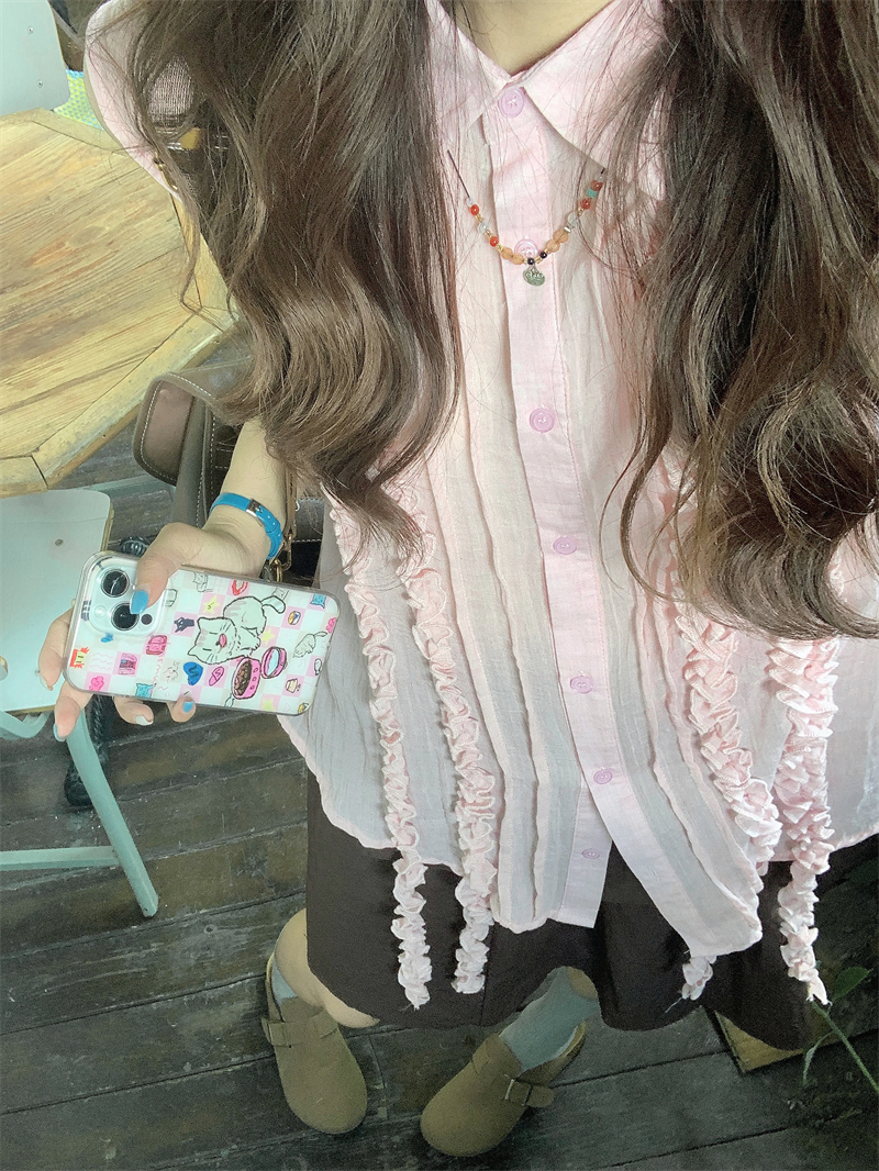 实拍实价#松弛感法式木耳花边飘带气质polo领无袖坎肩宽松防晒衫