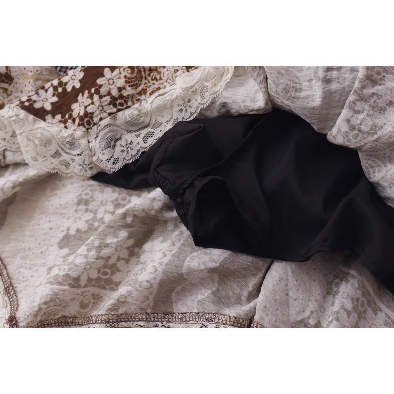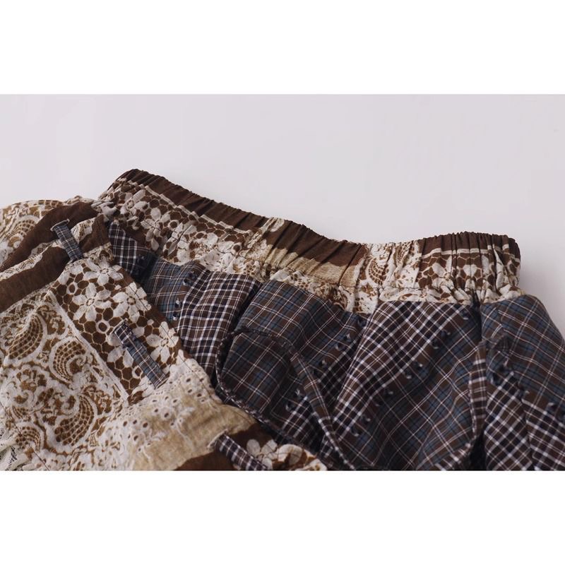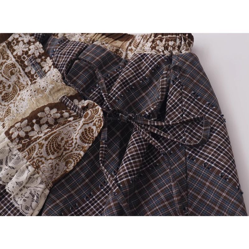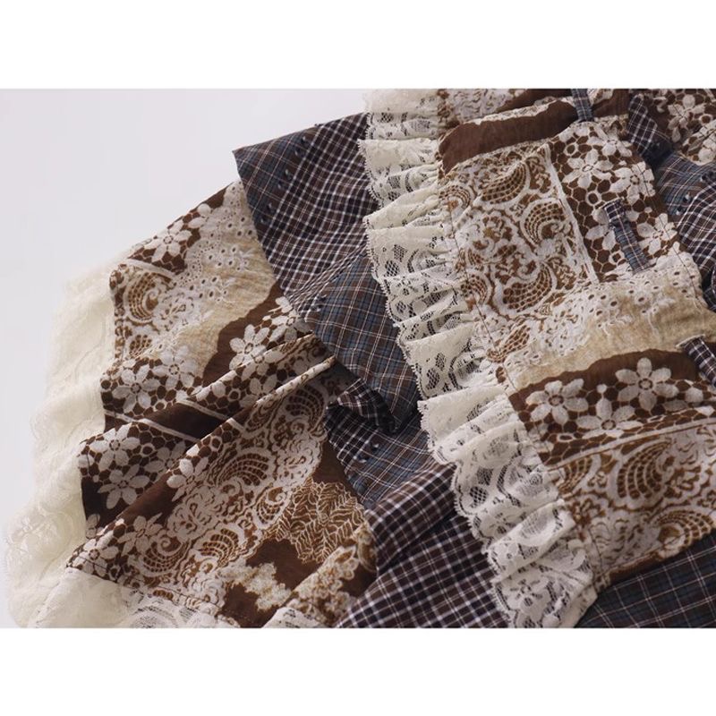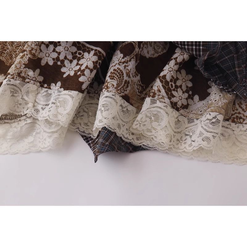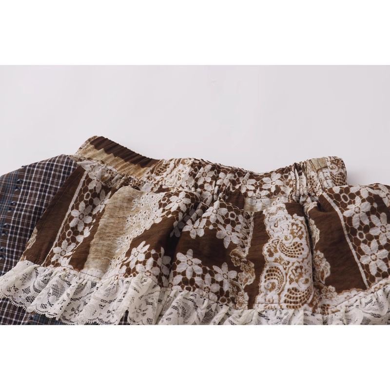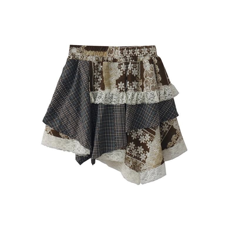夏季新款小众设计感森系复古不规则格子拼接蕾丝边碎花半身裙短裙