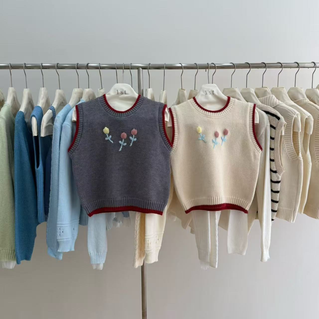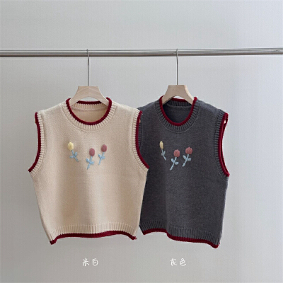 手工花圆领拼色针织马甲背心女早秋宽松外穿马夹毛