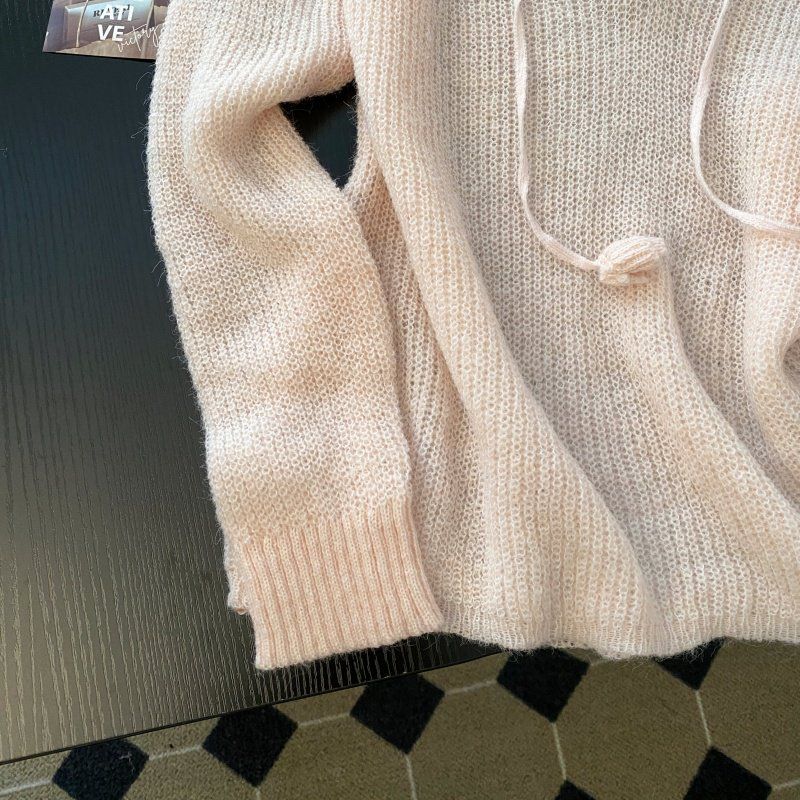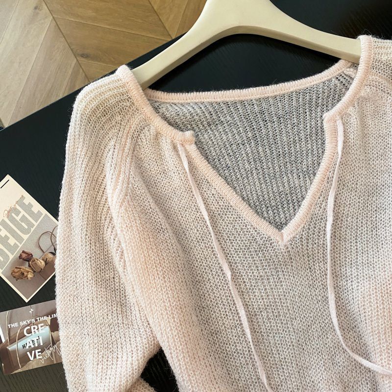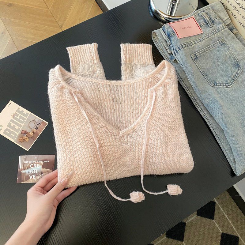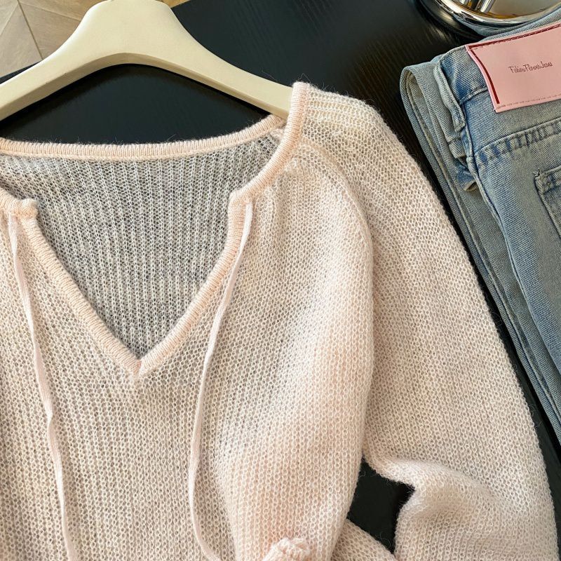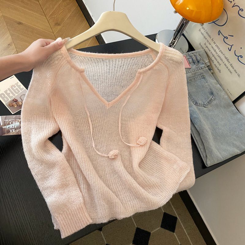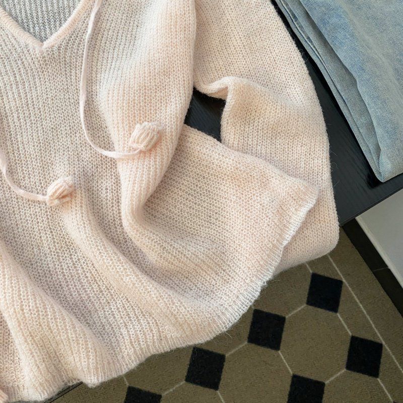 实拍~粉色V领系带毛衣女秋季2024温柔减龄气质软糯薄款套头针织衫