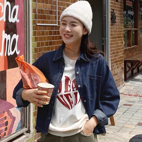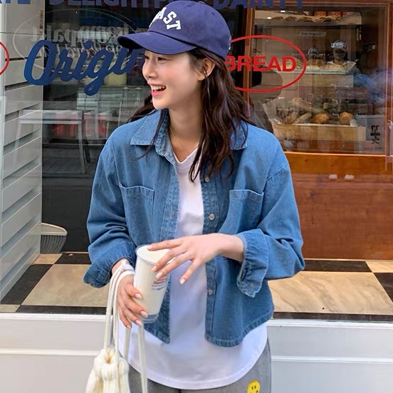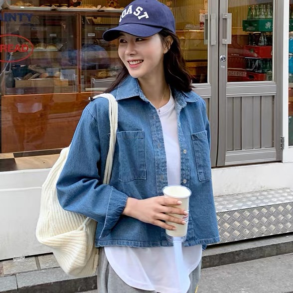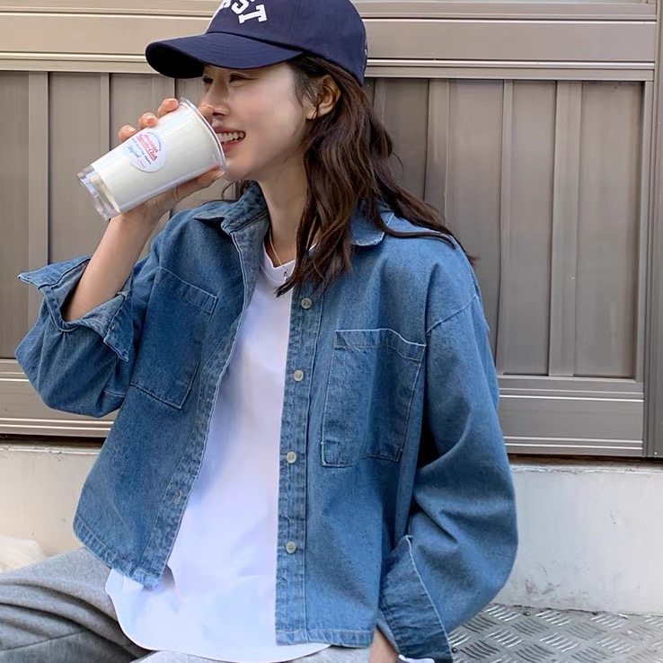 2025韩国代购正品女装 时尚宽松休闲翻领长袖短款牛仔衬衫