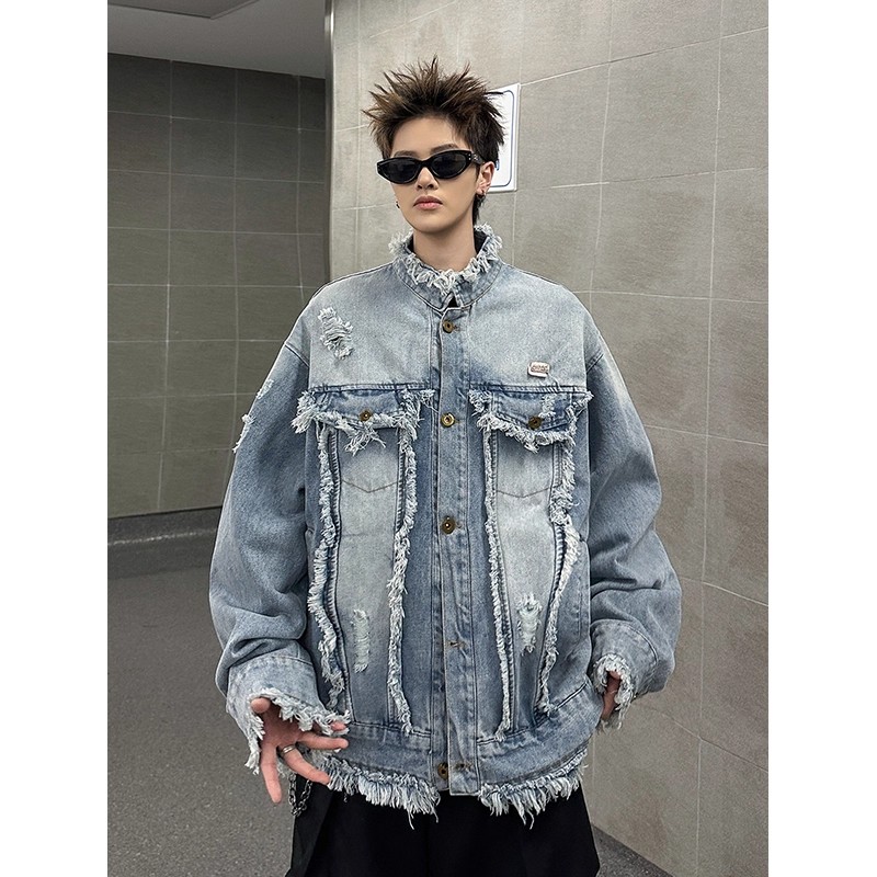 美式复古水洗毛边牛仔外套男女2025春秋宽松做旧痞帅工装立领夹克